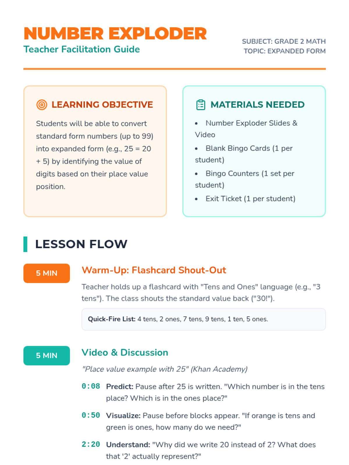 A second-grade math lesson where students learn to decompose two-digit numbers into expanded form using base-10 block visualizations and an interactive Bingo game.