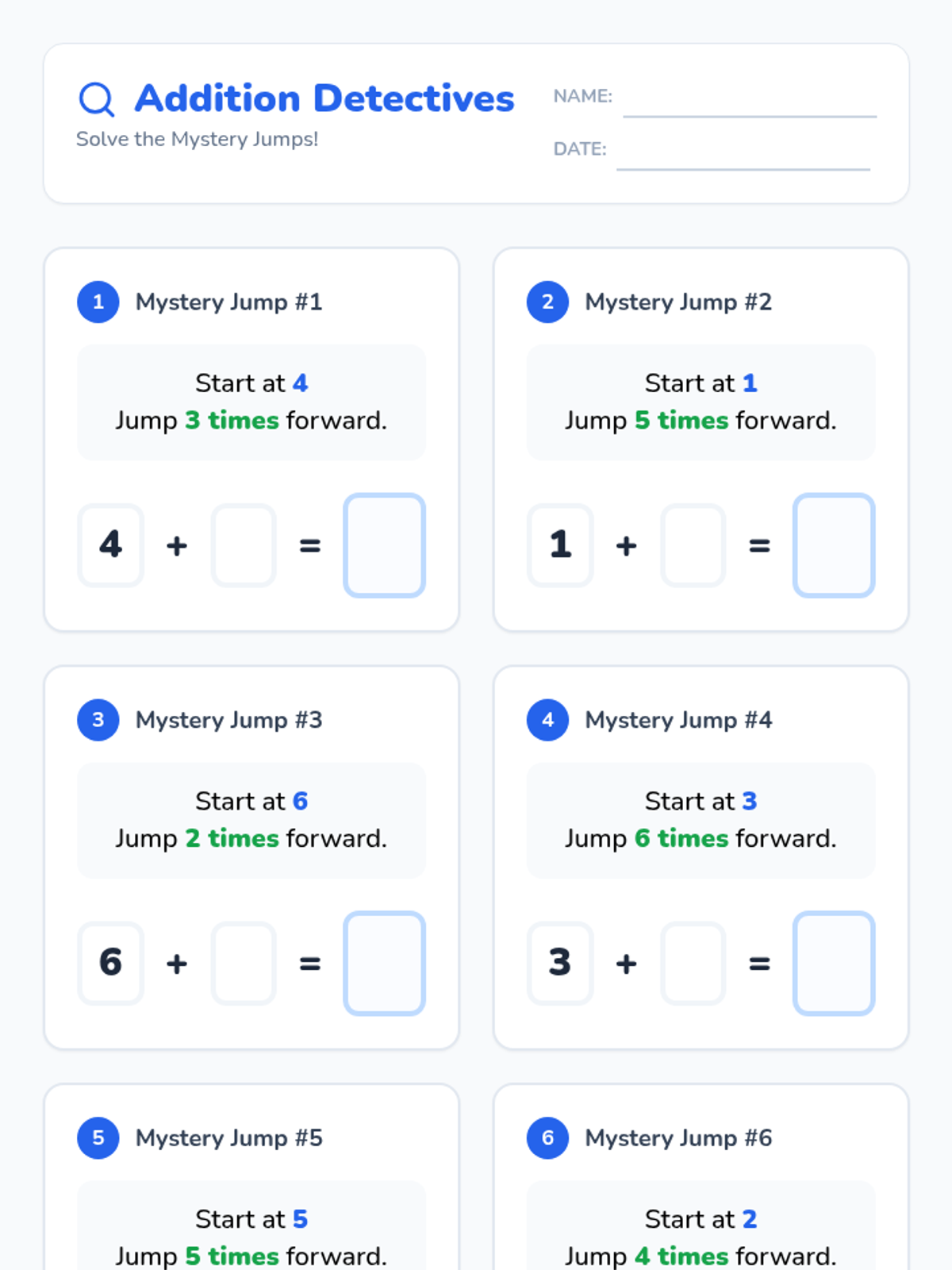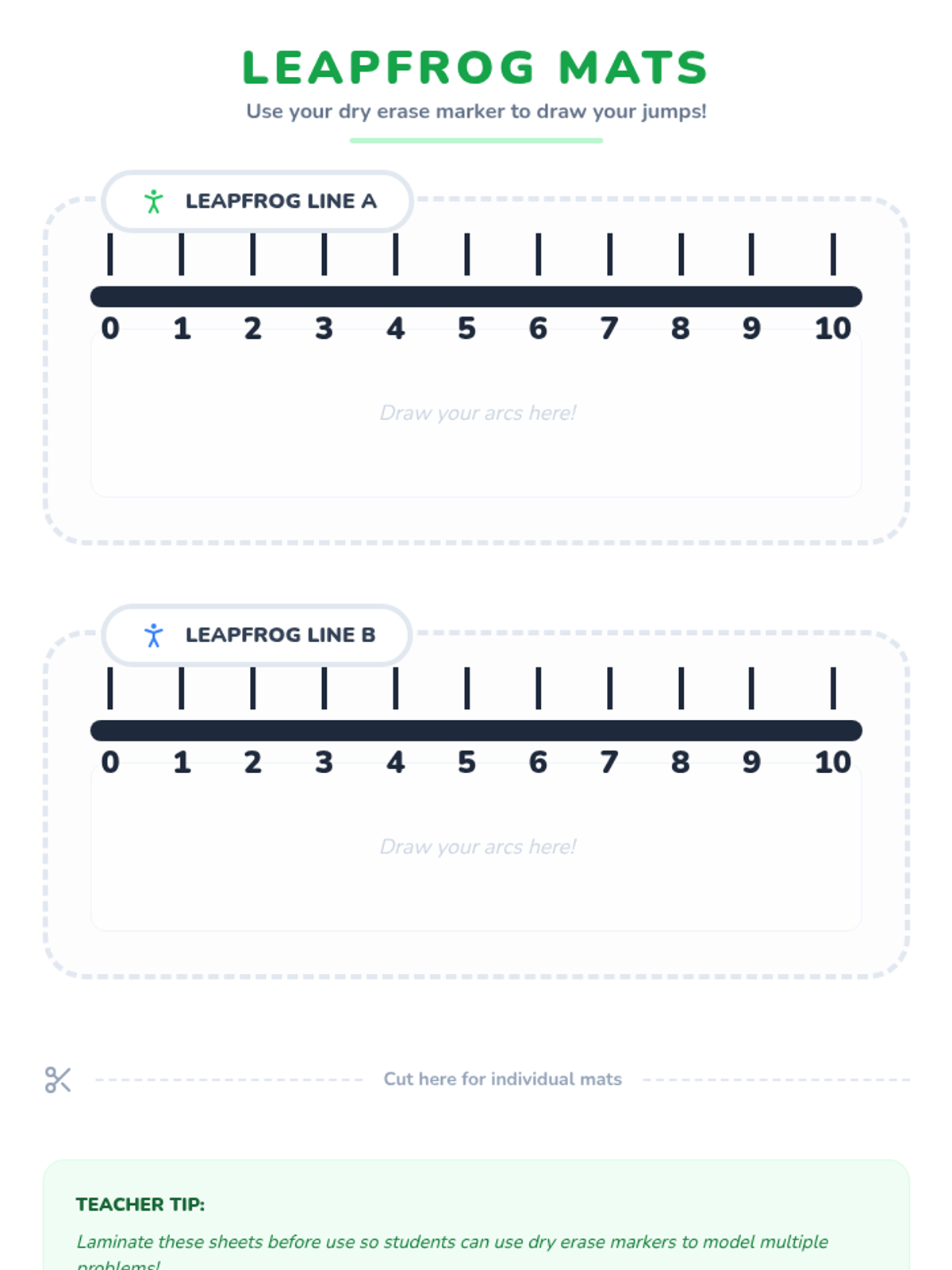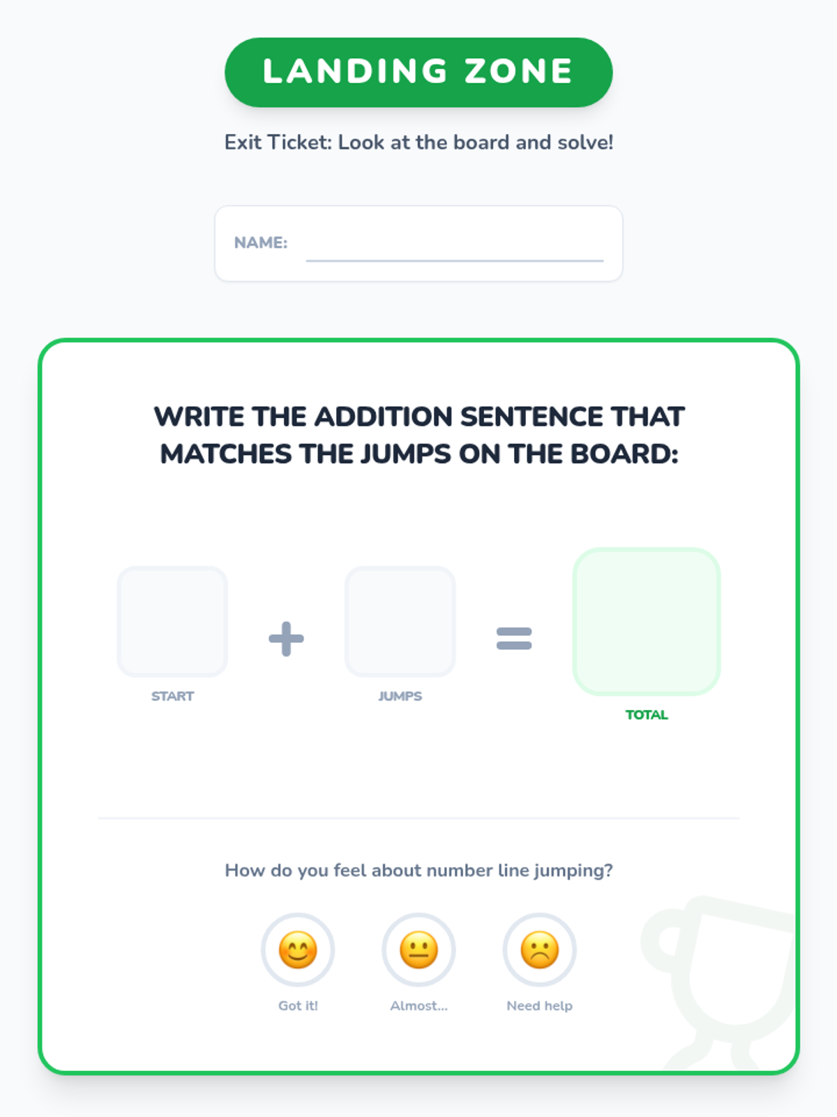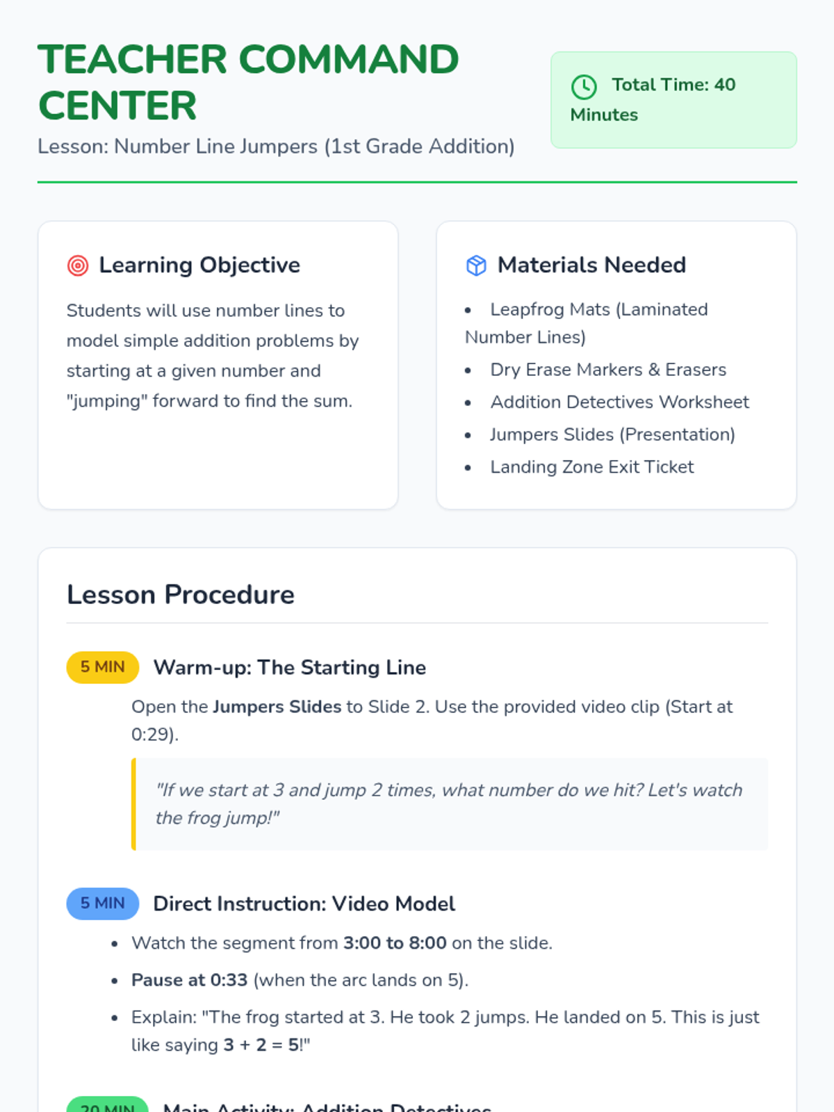 A 1st Grade lesson where students learn to solve simple addition problems by modeling 'jumps' on a number line, using a frog-themed visual approach.
