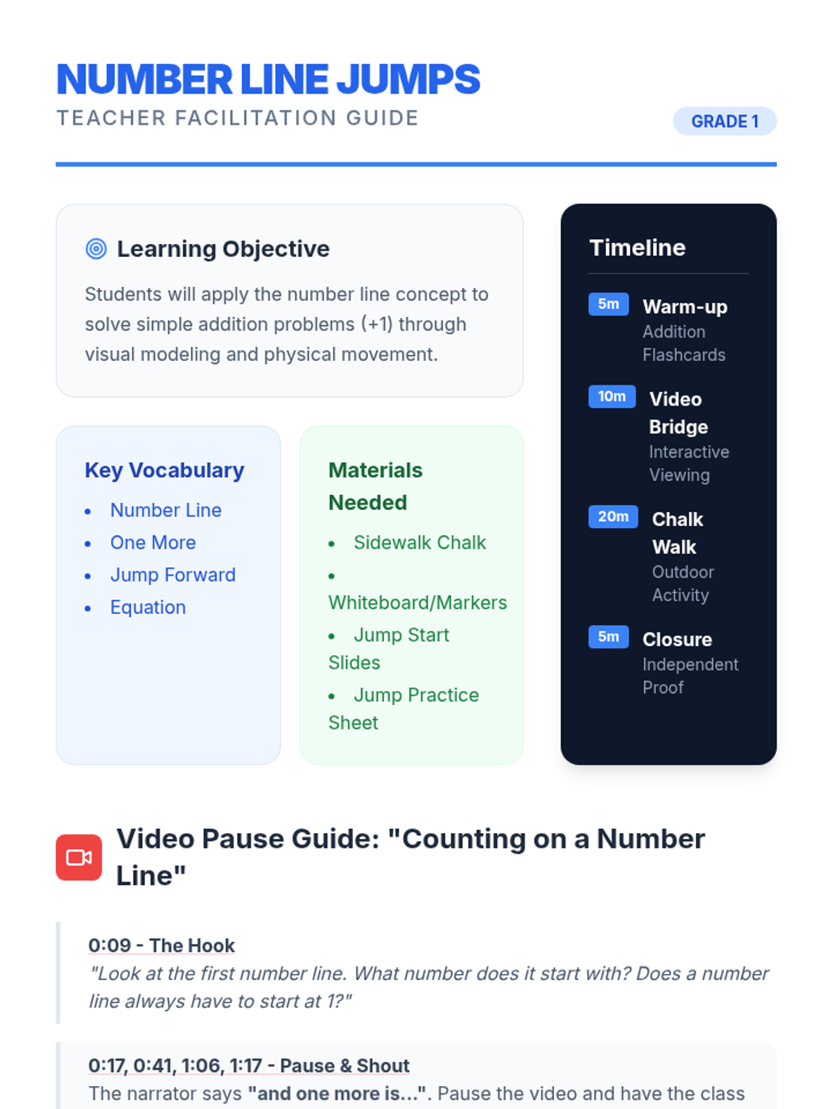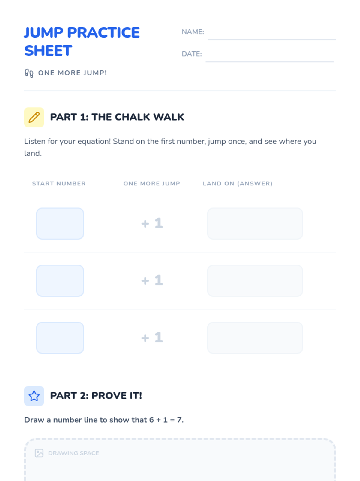 A fun, active lesson for 1st graders to learn addition using number lines. Students will watch a video, perform a physical 'Chalk Walk' activity outdoors, and practice drawing their own number lines to solve 'one more' problems.