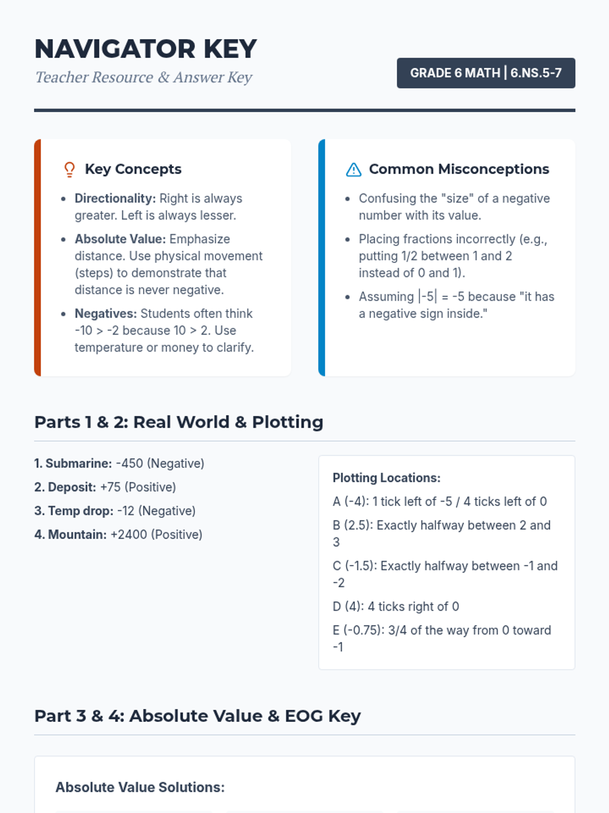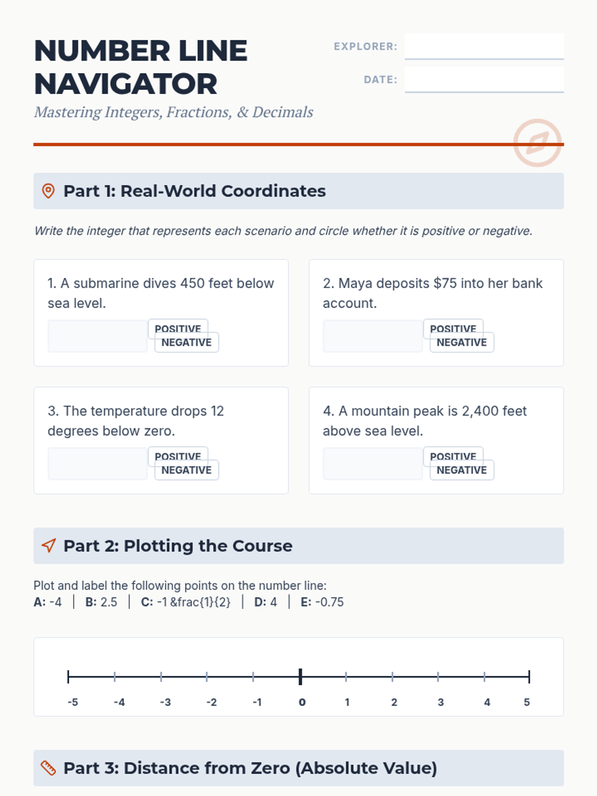 A comprehensive lesson on understanding and placing integers, fractions, and decimals on number lines, including absolute value and comparison of rational numbers. Aligned to NCSCOS 6.NS.5-7.
