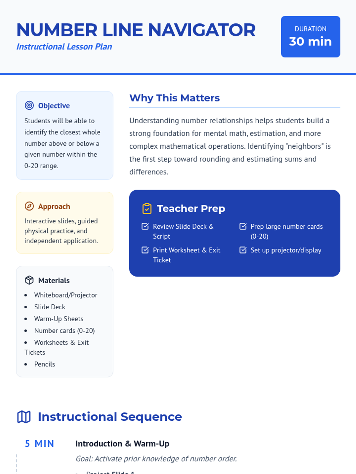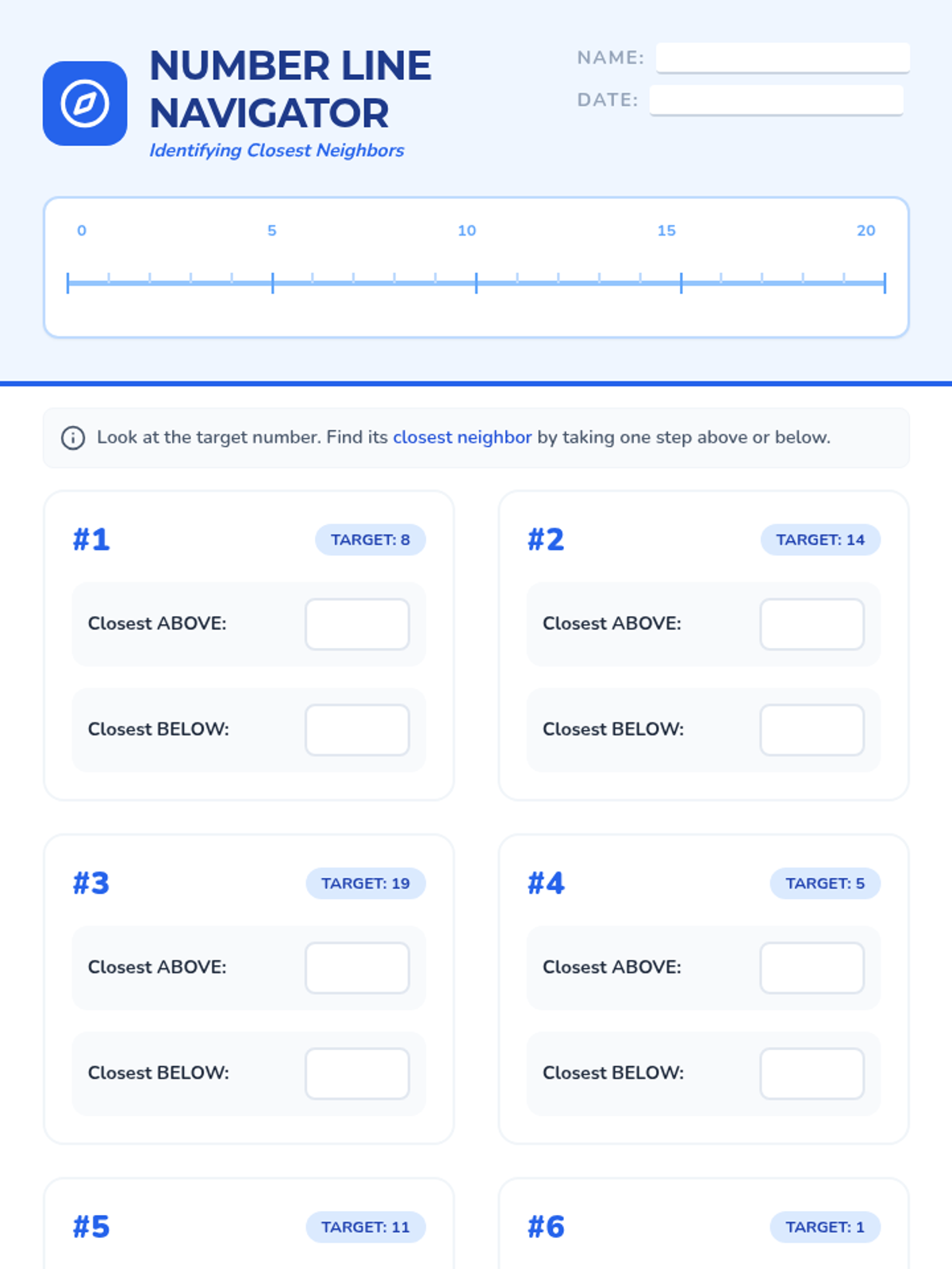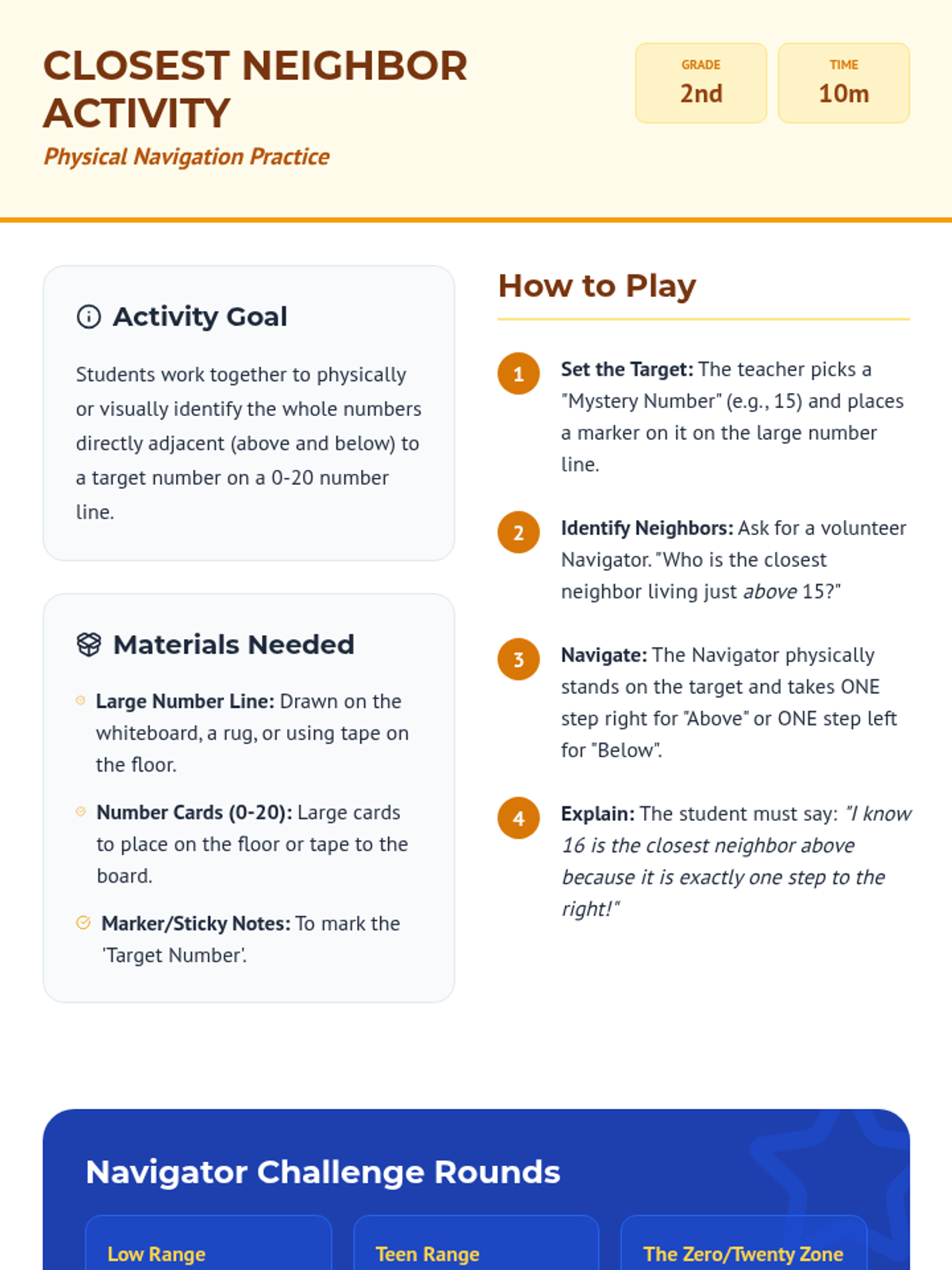 A 30-minute lesson for 2nd-grade students focusing on identifying the closest whole number above or below a target number within the 0-20 range using a number line. Students act as 'Navigators' to build their number sense and mental math foundations.