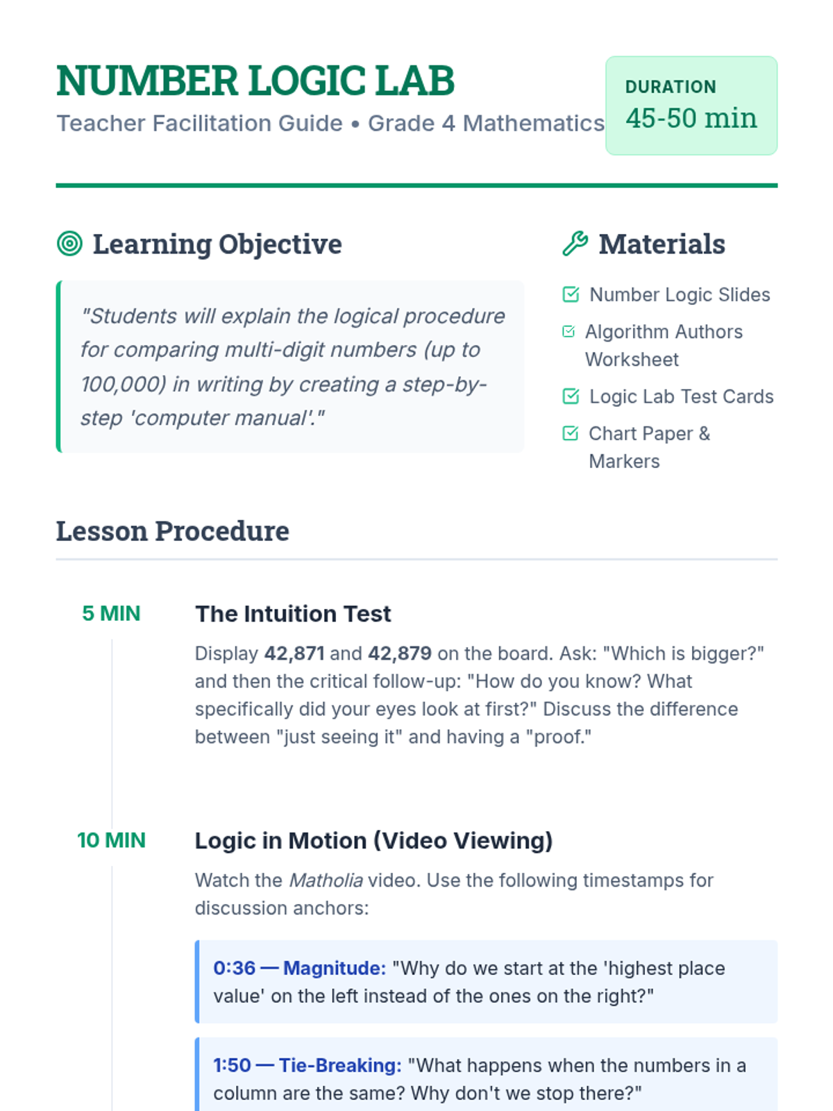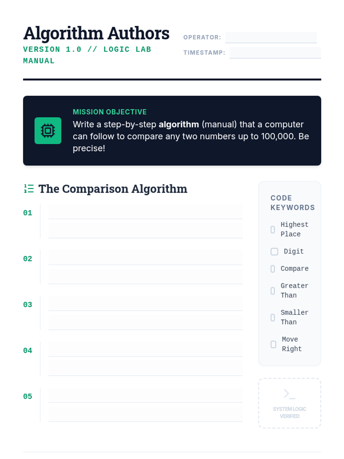 A 4th-grade lesson where students analyze the narrative of comparing large numbers and write a step-by-step 'manual' for a computer to follow. The lesson uses a structured video analysis to build a logical algorithm for multi-digit comparison.