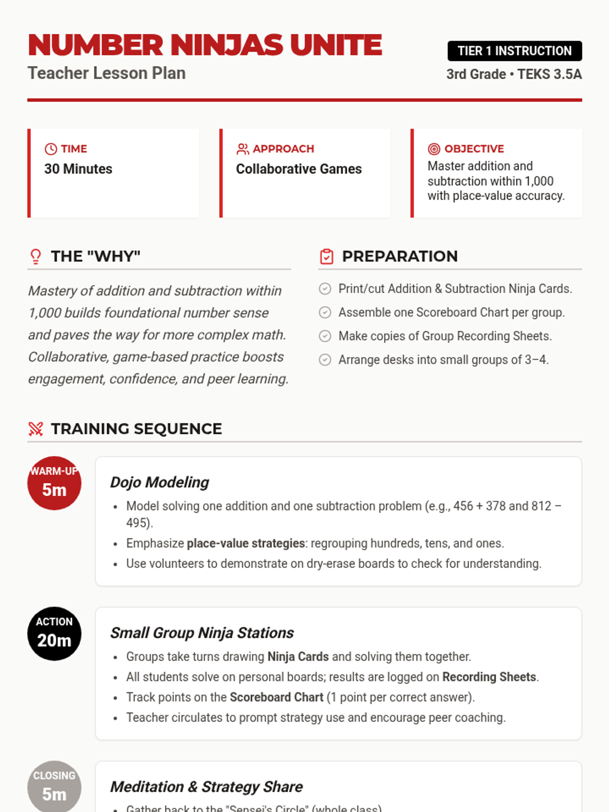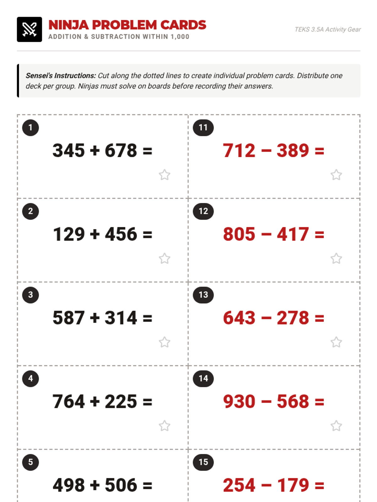 In this 30-minute lesson, 3rd graders will work in small groups to master addition and subtraction within 1,000 (TEKS 3.5A) through collaborative games and targeted practice.