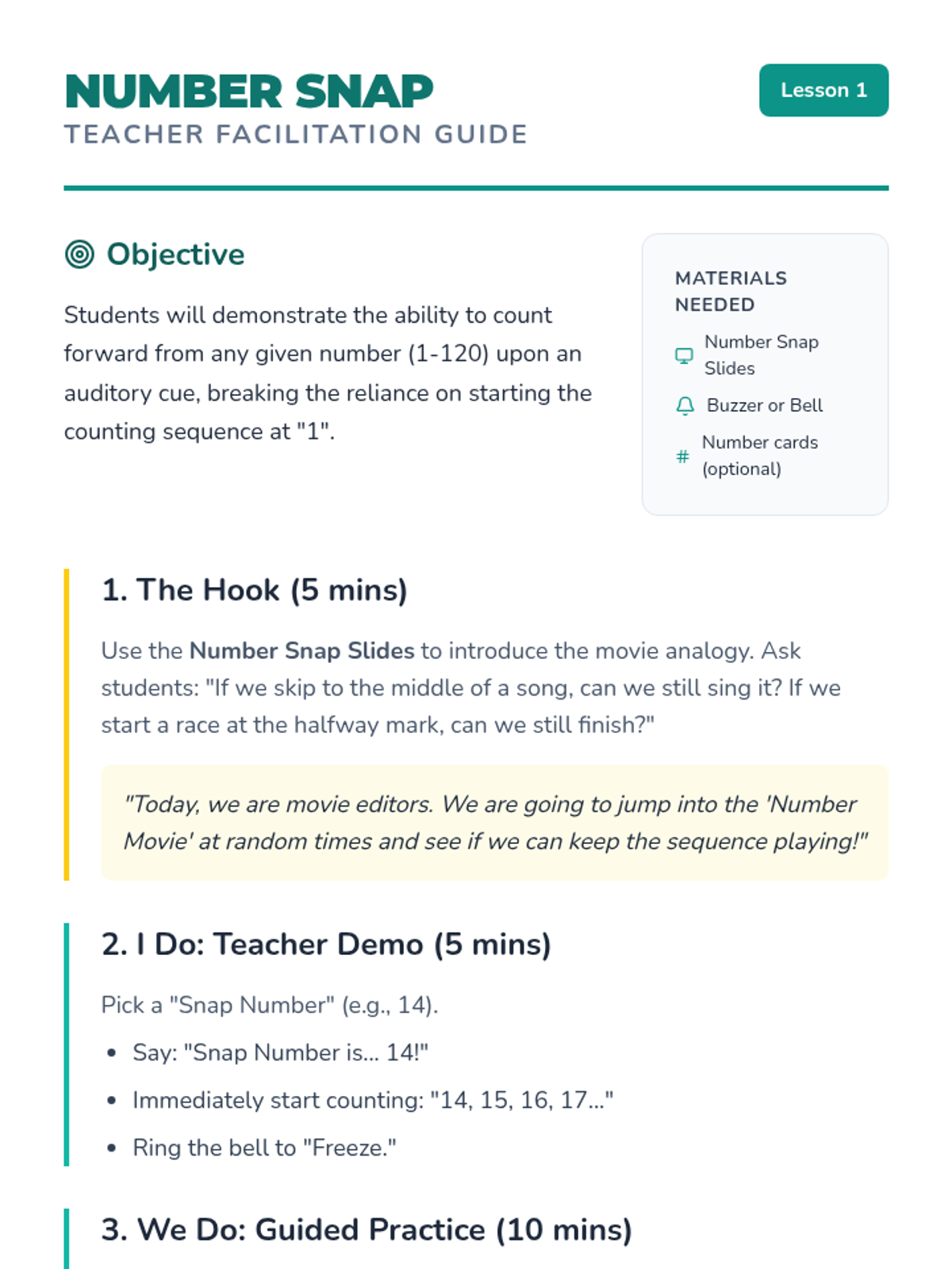 Students listen for a 'Snap Number' and immediately begin counting forward, building listening skills and reaction time while breaking the habit of starting at one.