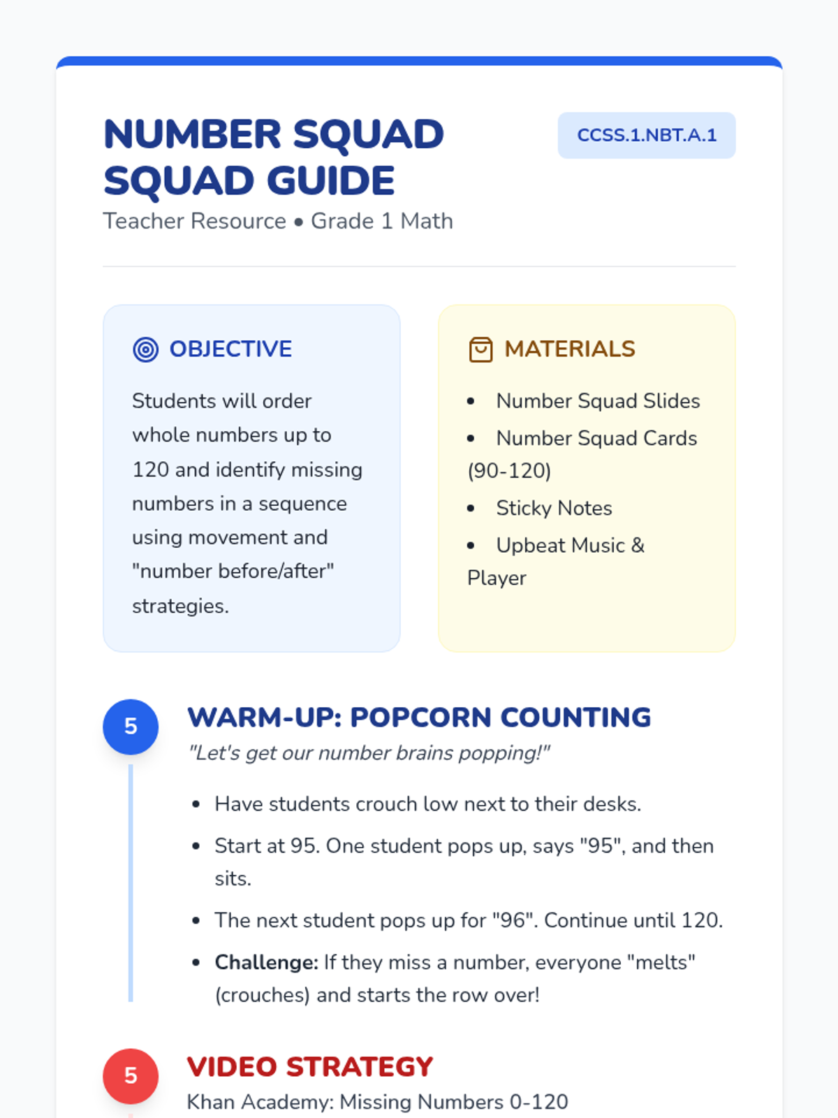 A high-energy math lesson where 1st graders act as a living number line to master sequencing numbers from 90 to 120. Students use the 'number before' strategy and identify patterns in a 120 chart through movement and video analysis.