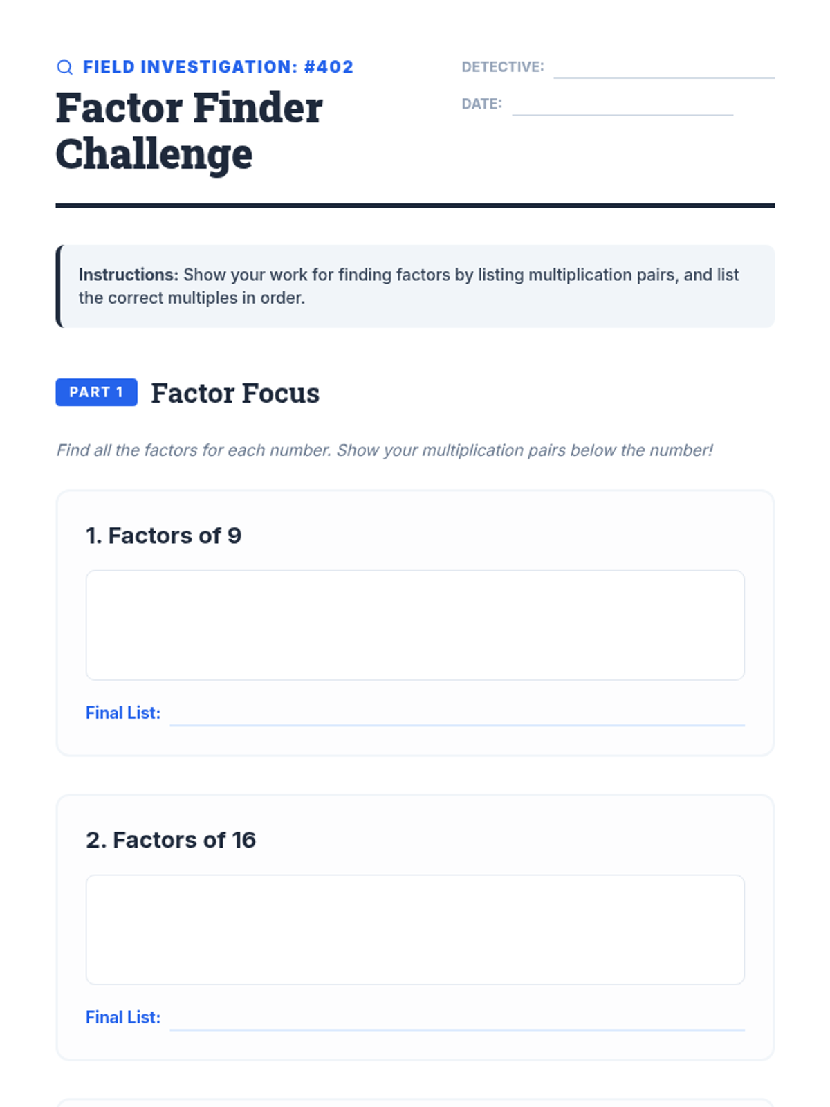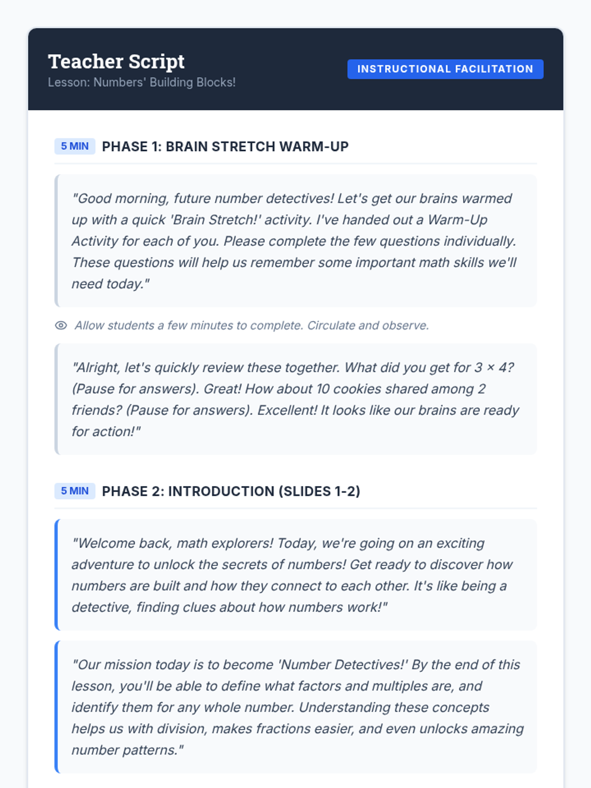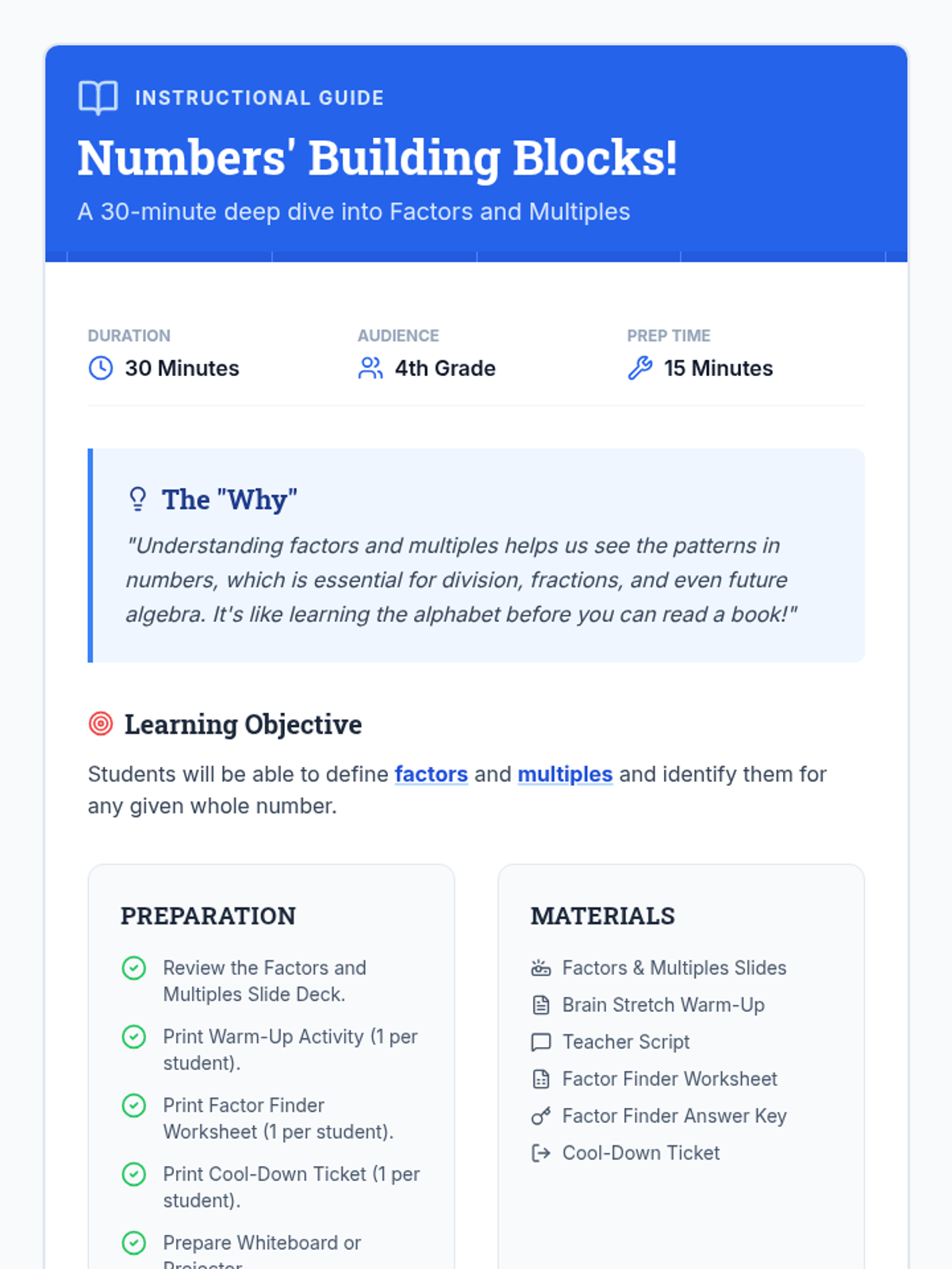 A foundational 4th-grade math lesson that introduces factors and multiples using a 'Building Blocks' and 'Number Detective' theme. Students will learn to identify factor pairs and generate skip-counting multiples through interactive slides and hands-on practice.