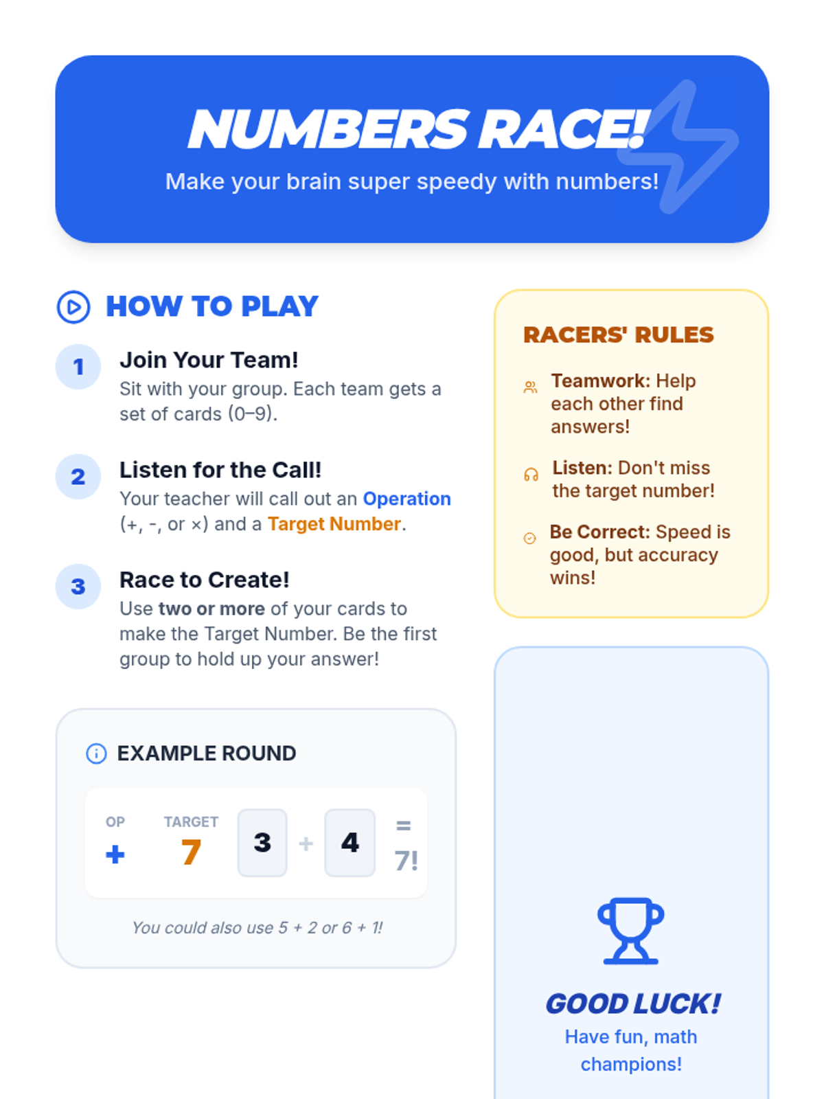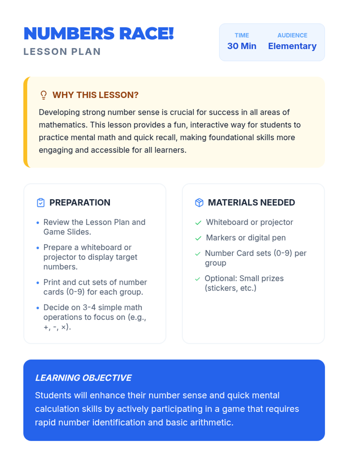 A high-energy, 30-minute mental math lesson where students compete in teams to reach target numbers using basic operations and number cards. Designed with visual supports for ESL and 504 learners.