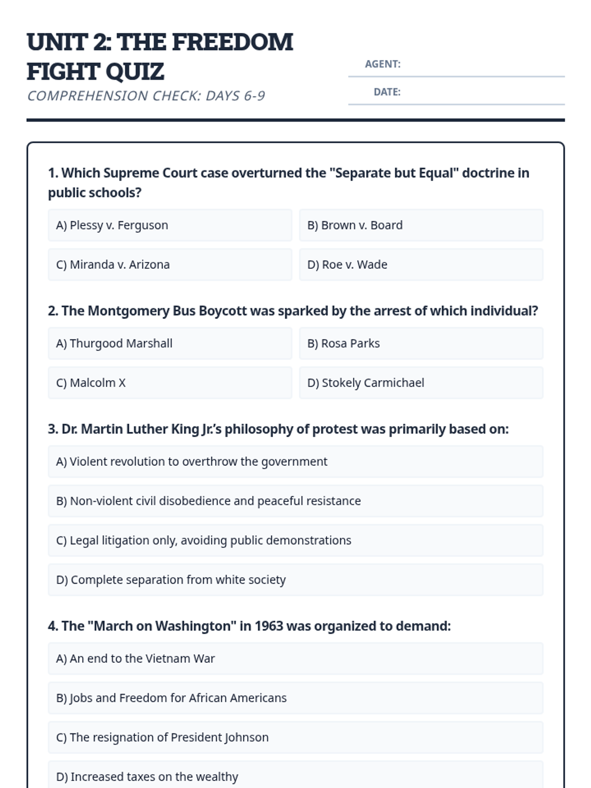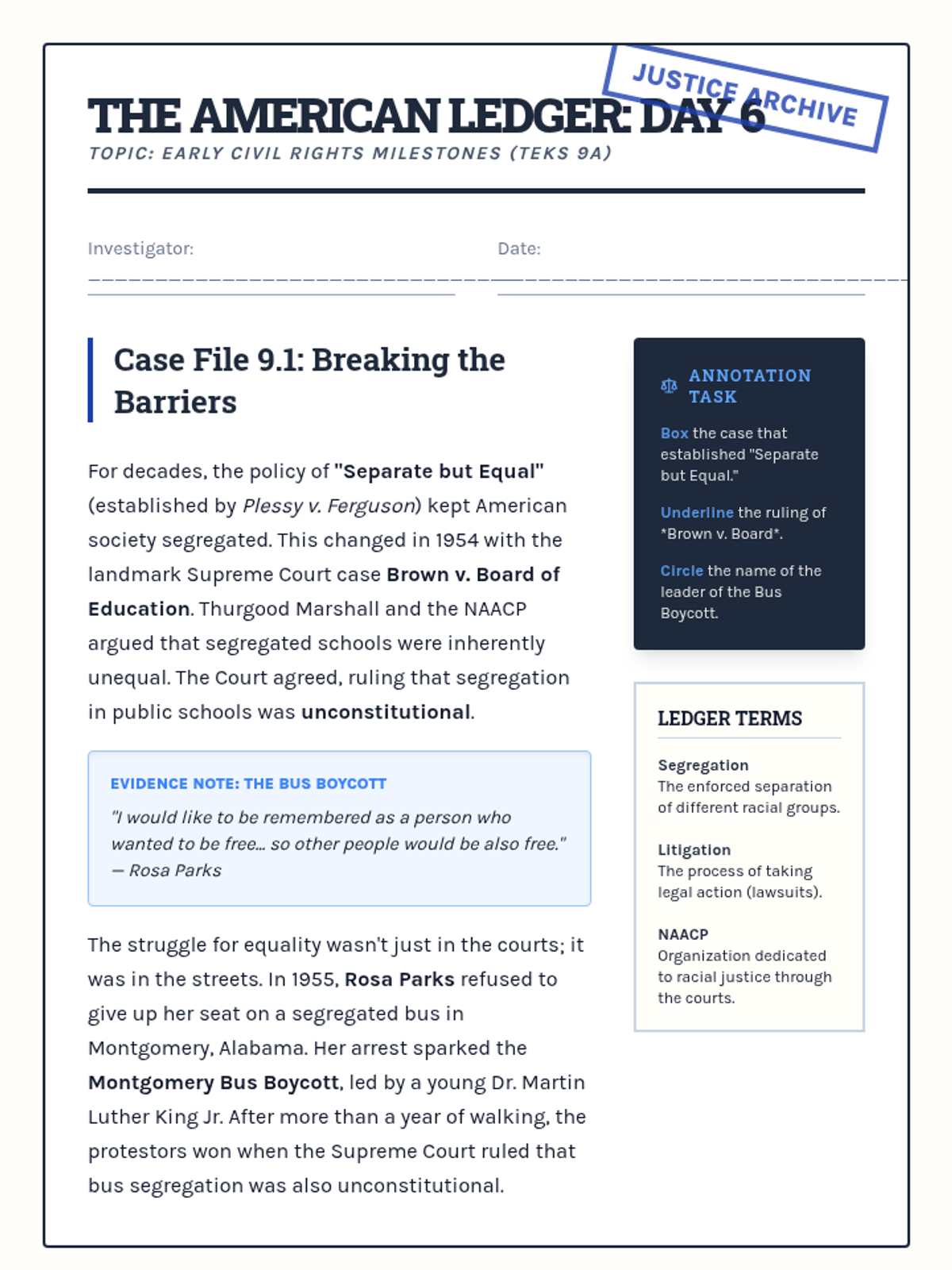 Examines the struggle for equality, from Brown v. Board to the legislative victories of the 1960s. Includes TEKS 9A, 9D, and 9F.