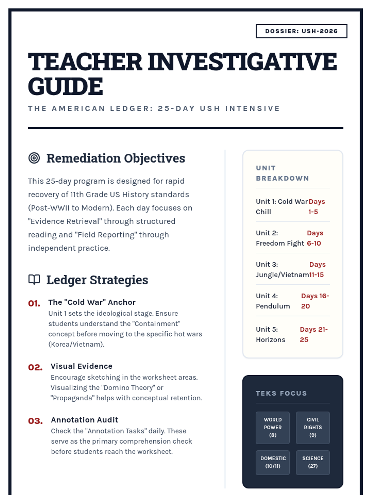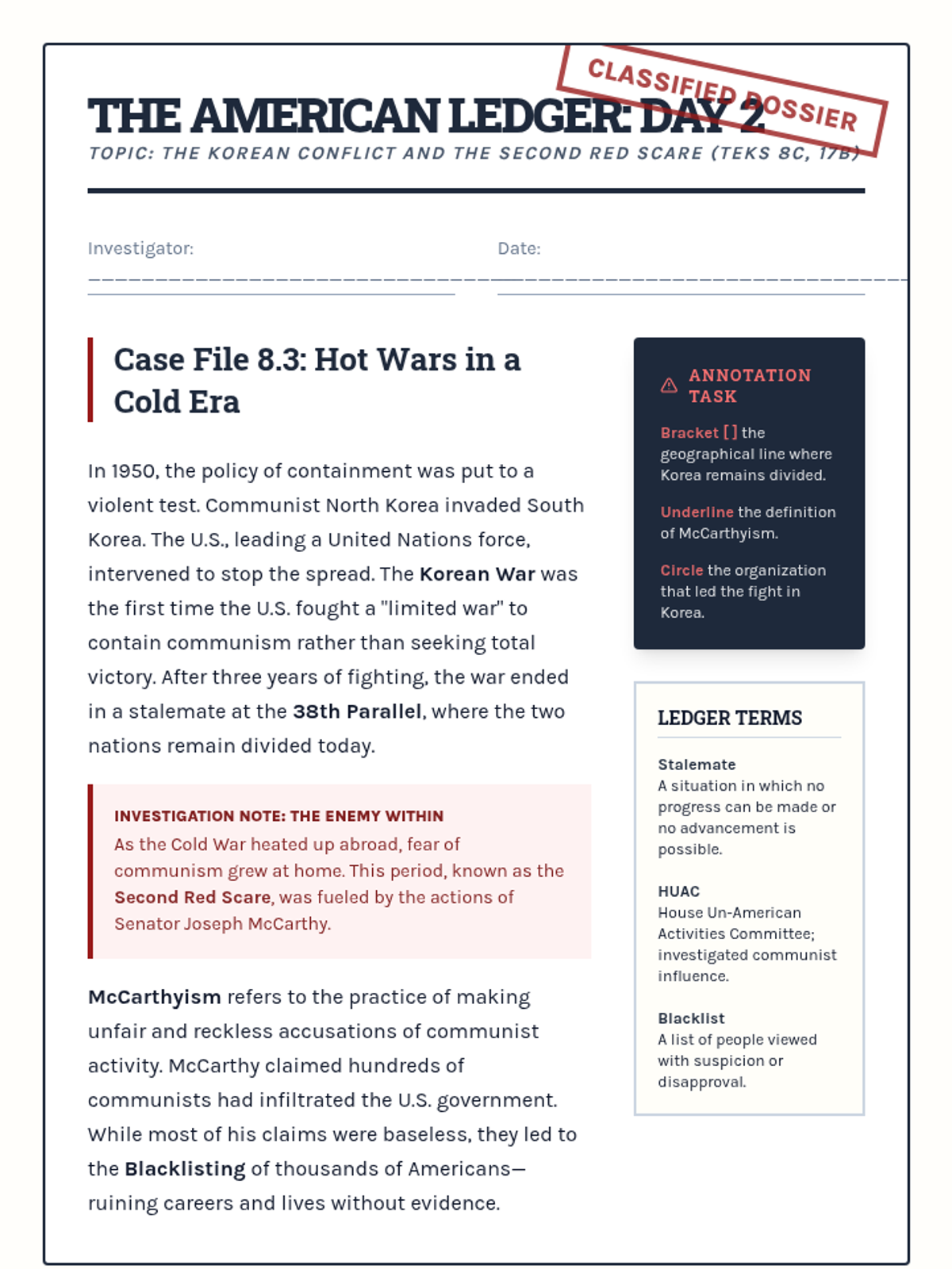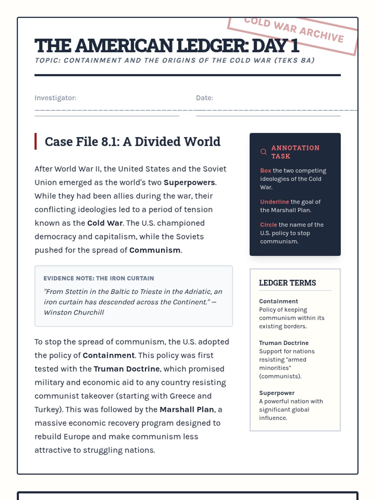 Covers the origins of the Cold War, containment policy, the Korean War, and the cultural landscape of the 1950s. Includes TEKS 8A, 8C, and 17B.