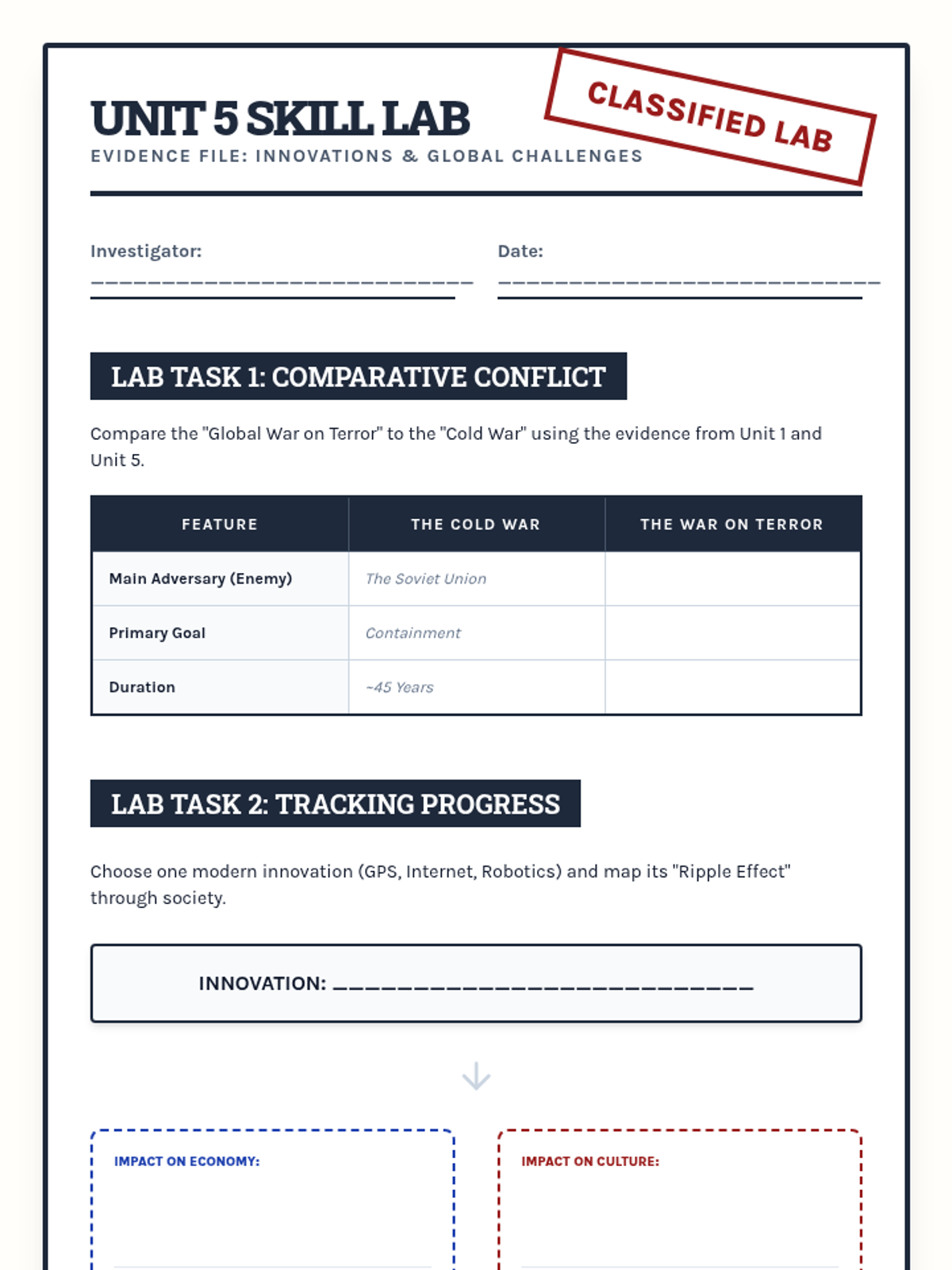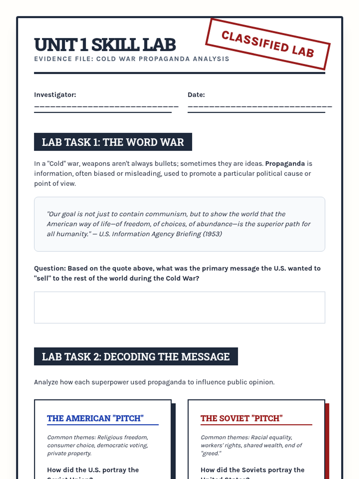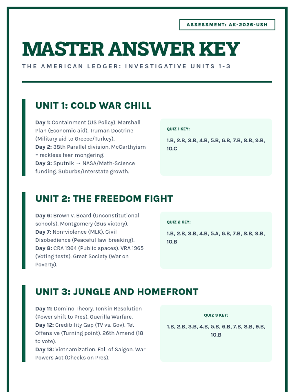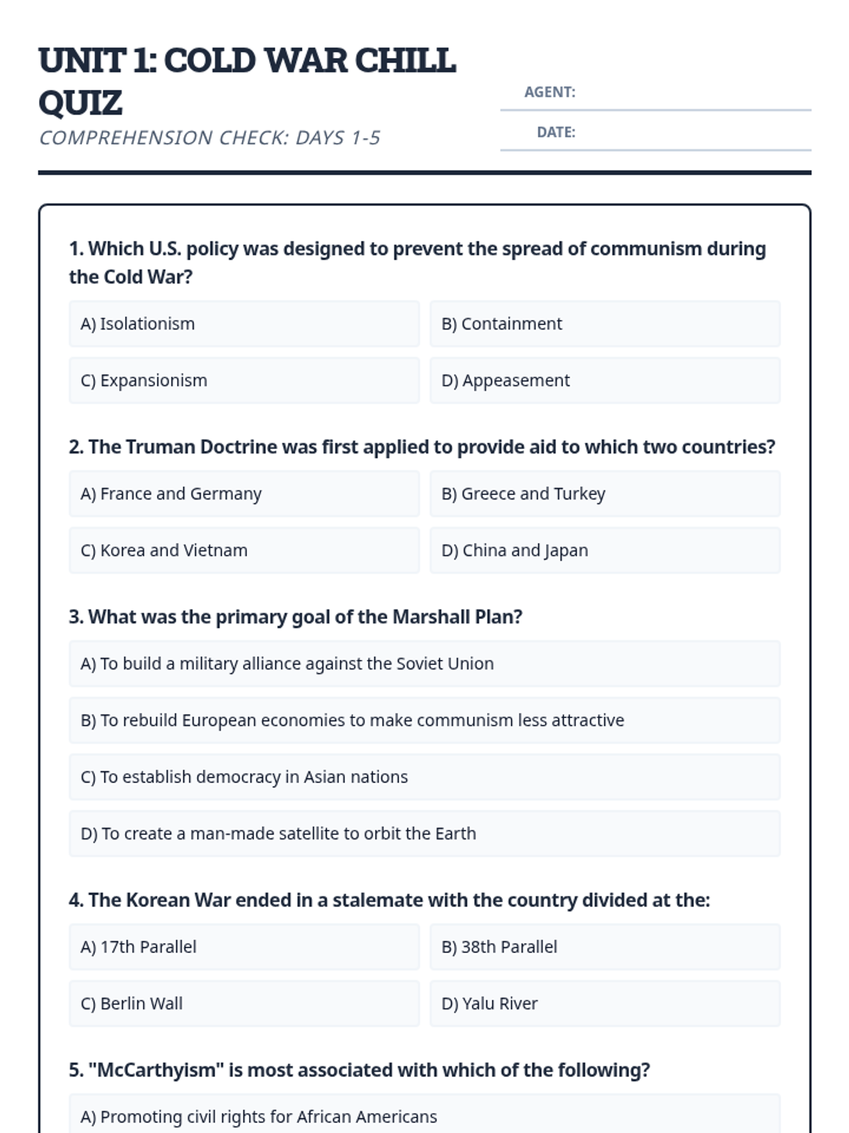 Covers the origins of the Cold War, containment policy, the Korean War, and the cultural landscape of the 1950s. Includes TEKS 8A, 8C, and 17B.