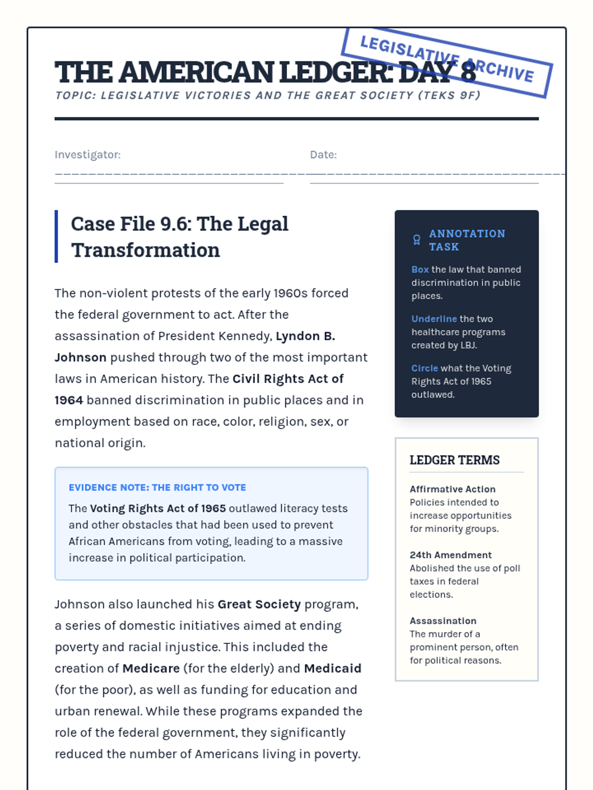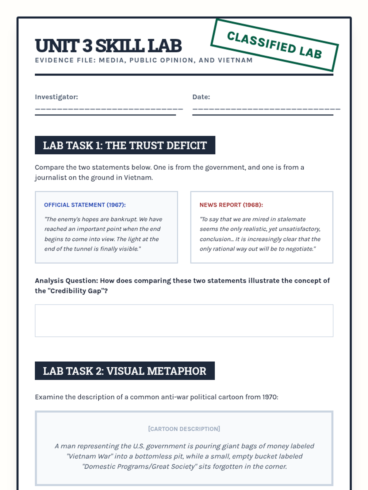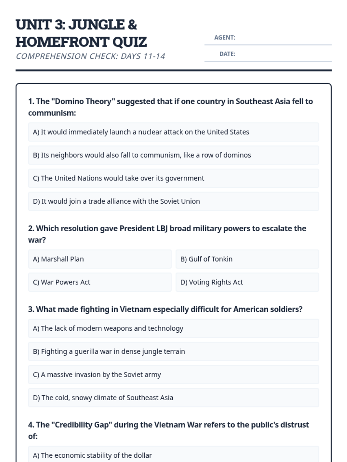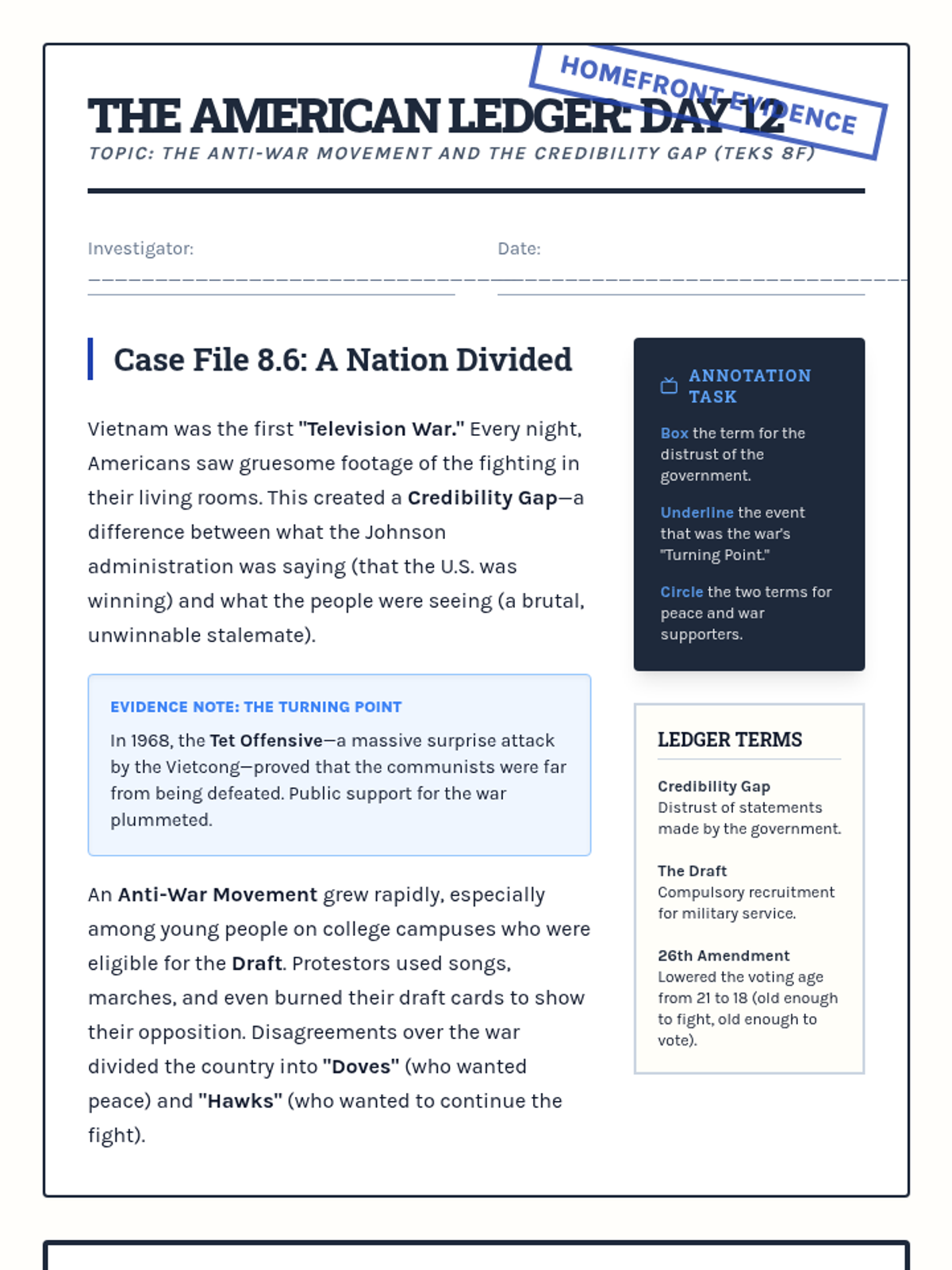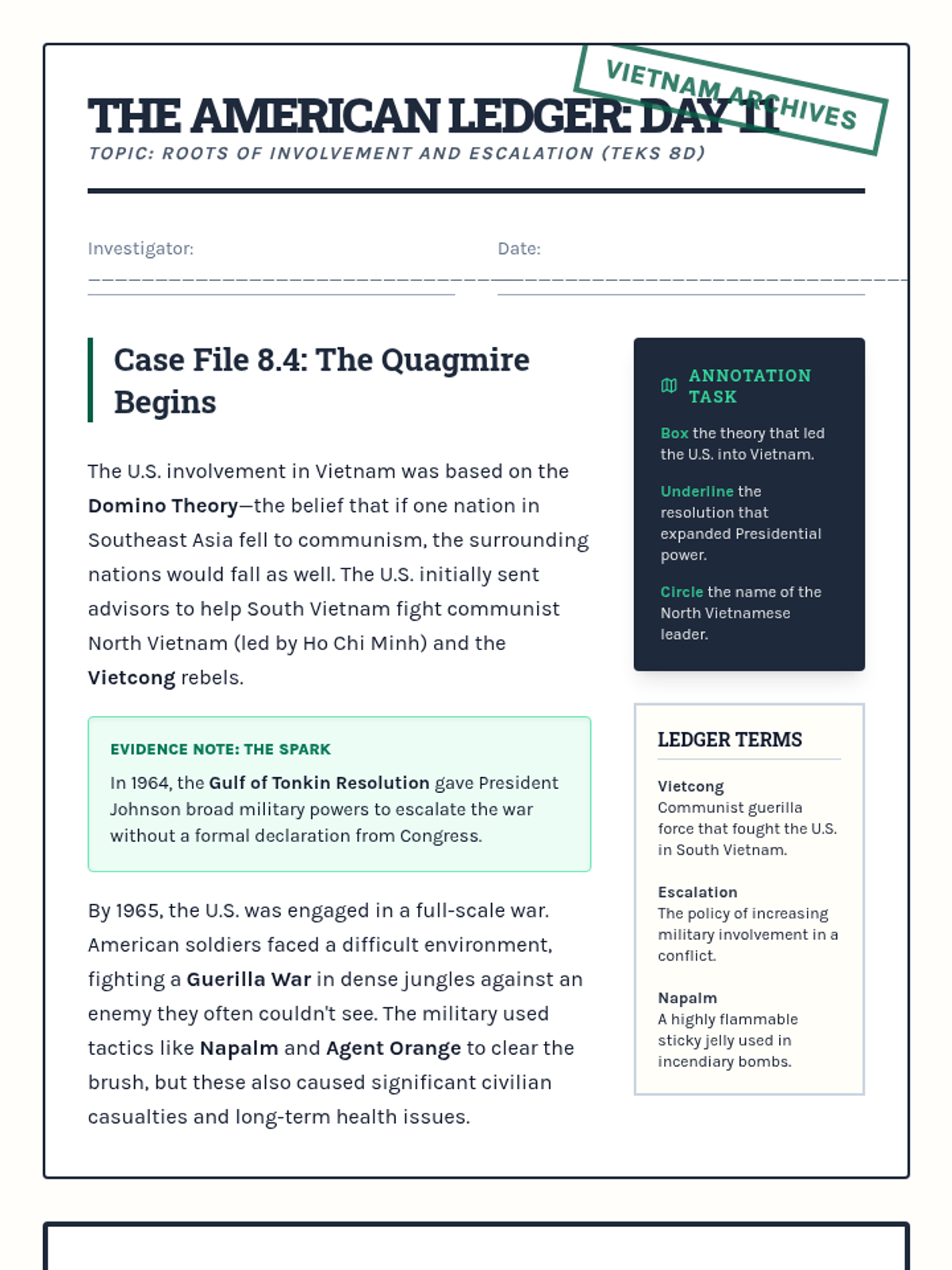 Explores the causes and effects of the Vietnam War, the anti-war movement, and the cultural shifts of the 1960s. Includes TEKS 8D, 8F, and 20A.
