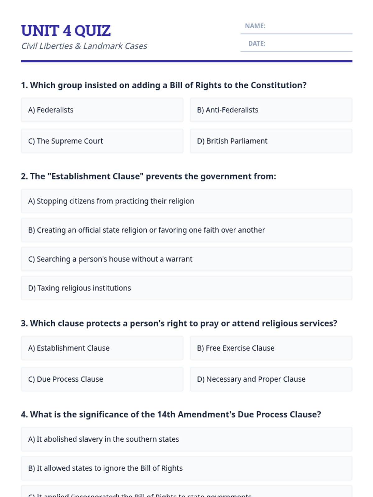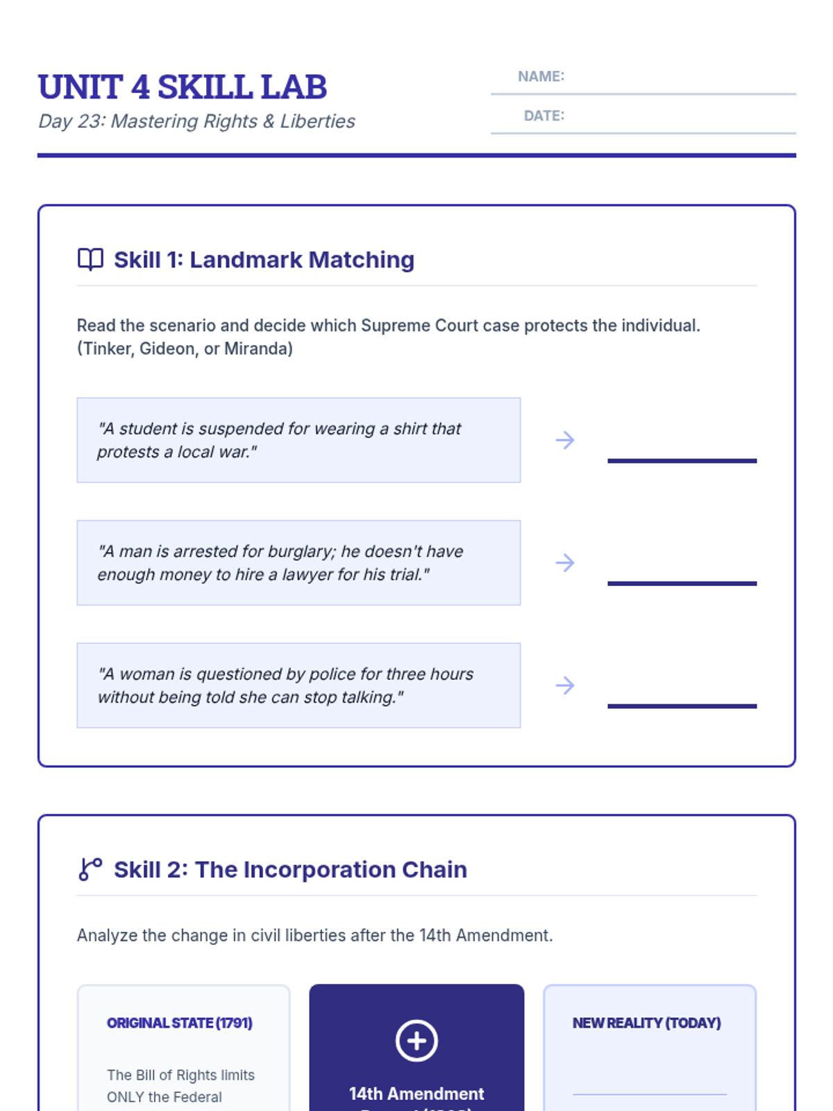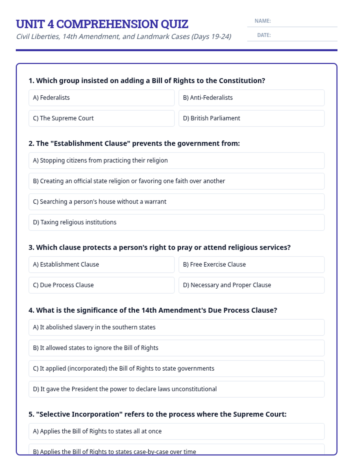 Examines individual rights, religious freedom, landmark Supreme Court cases, and the impact of the 14th Amendment on state government. Now Days 19-24.