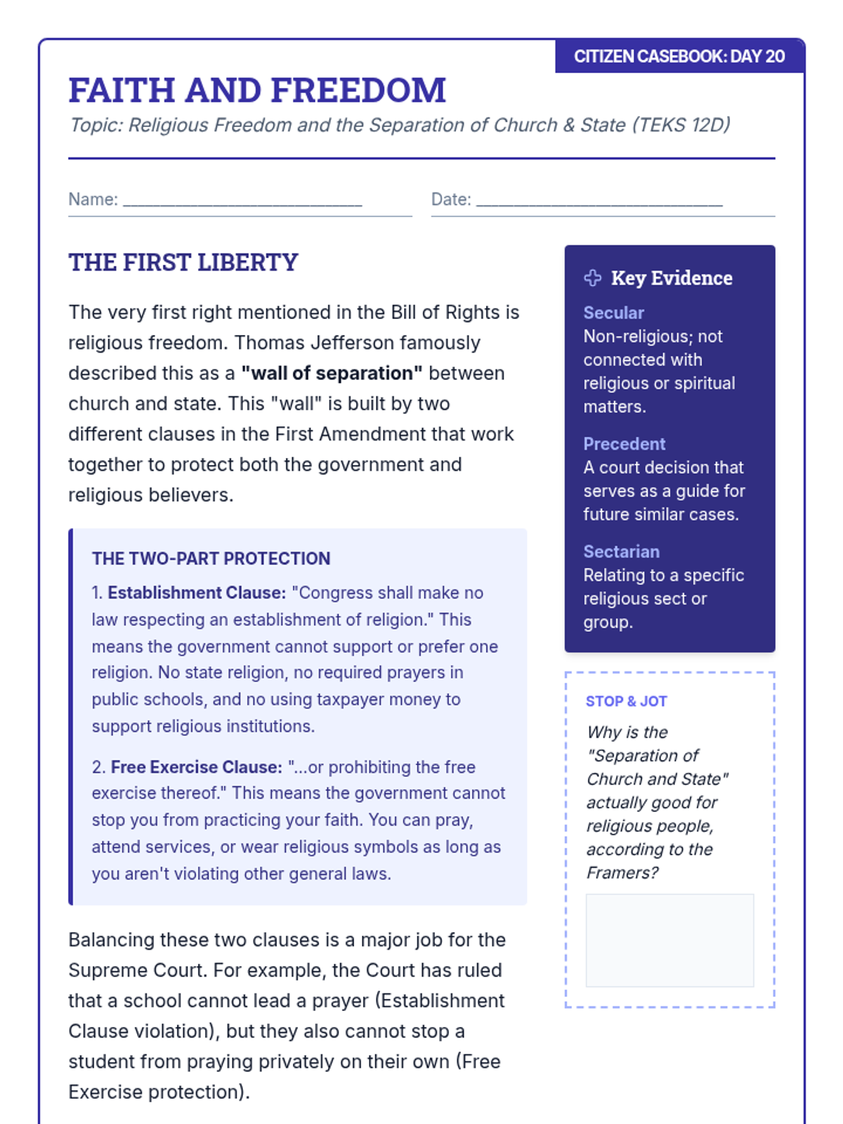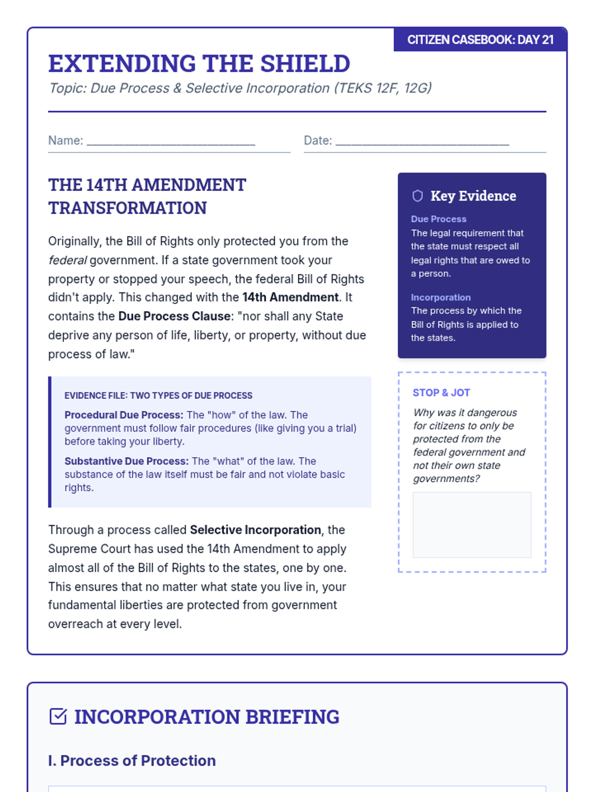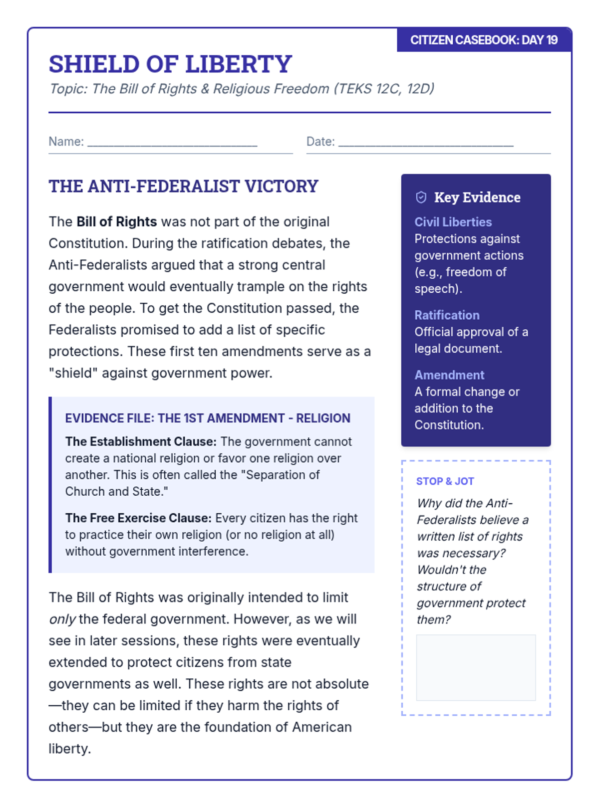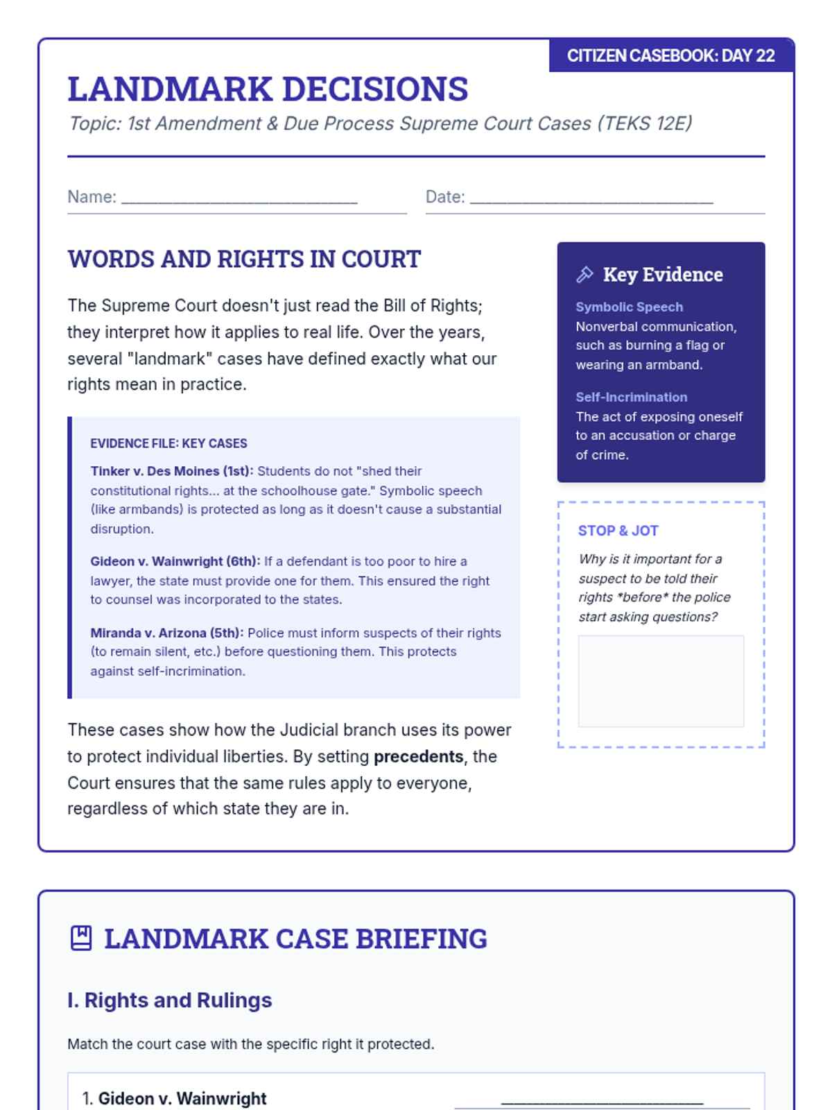 Examines individual rights, religious freedom, landmark Supreme Court cases, and the impact of the 14th Amendment on state government. Now Days 19-24.