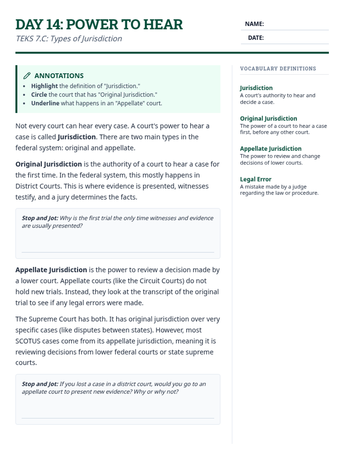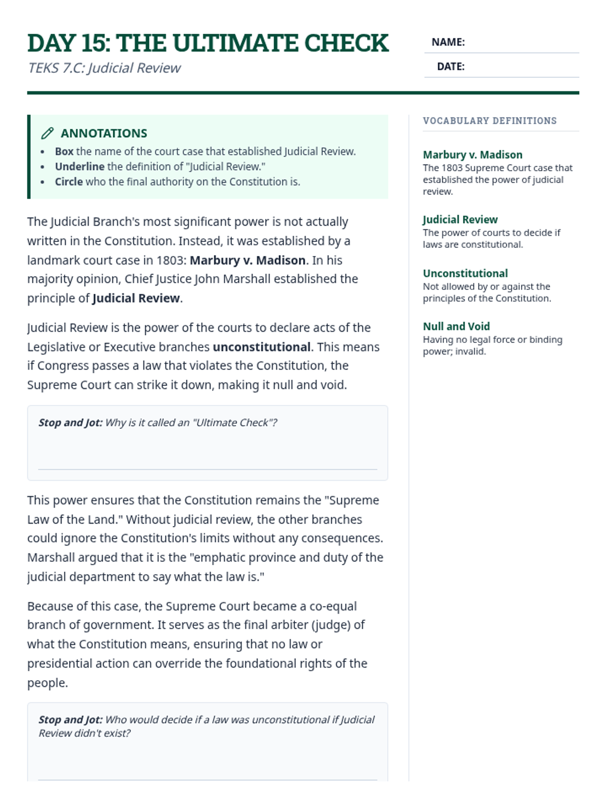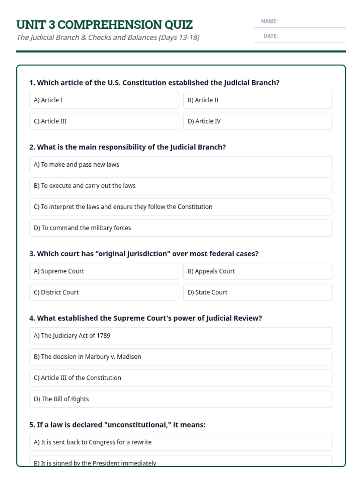 Explores the structure of the federal government with a focus on the Judicial branch, judicial review, and the system of checks and balances. Now Days 13-18.