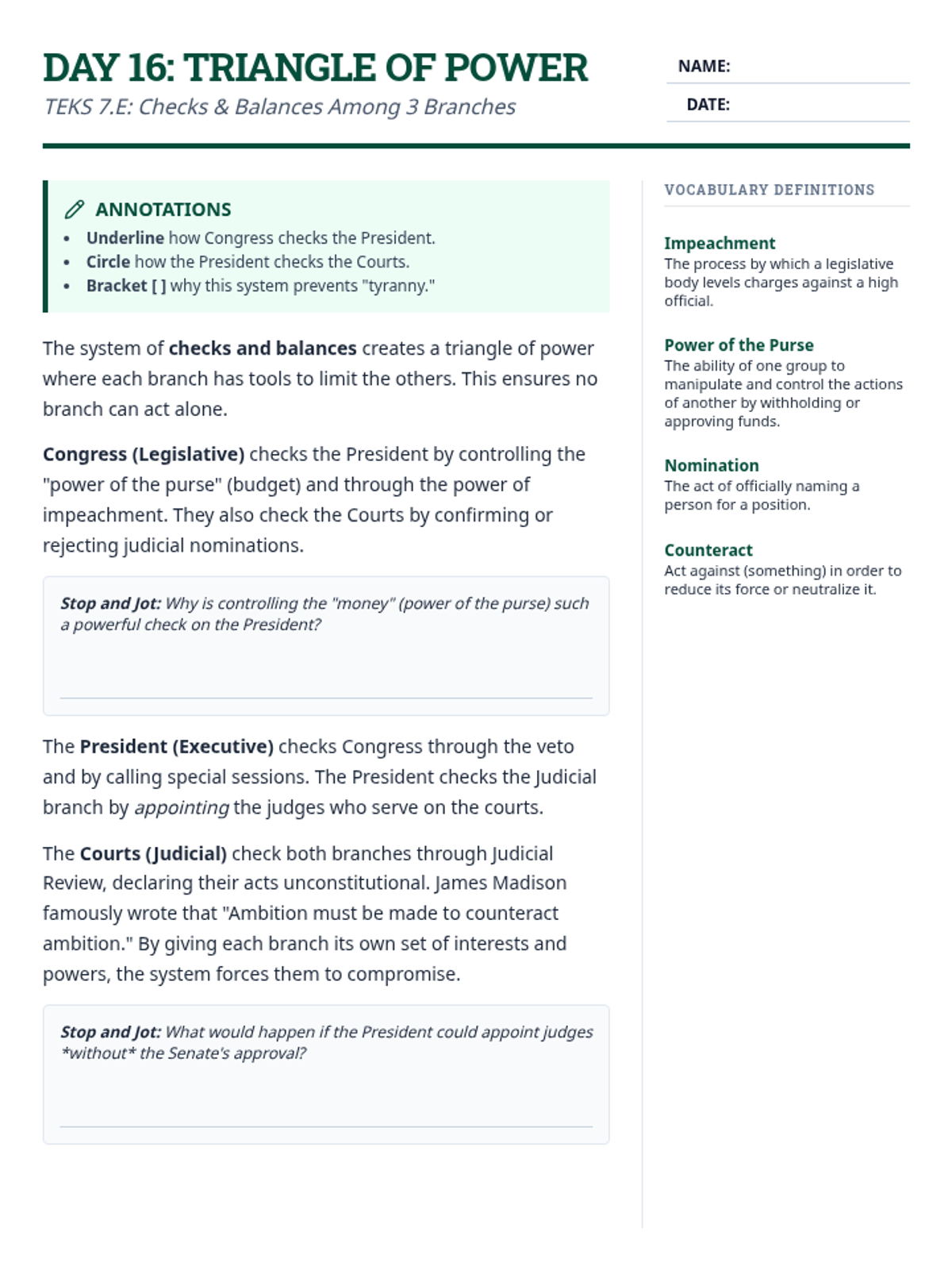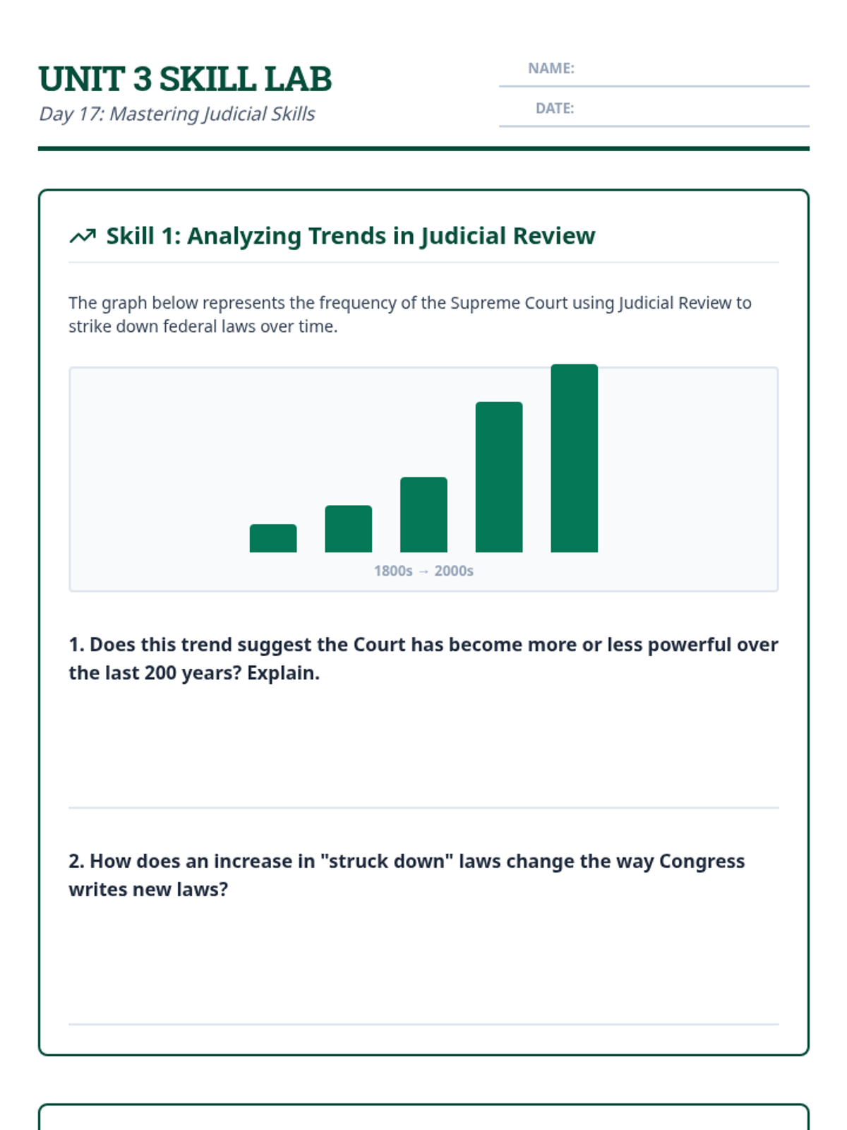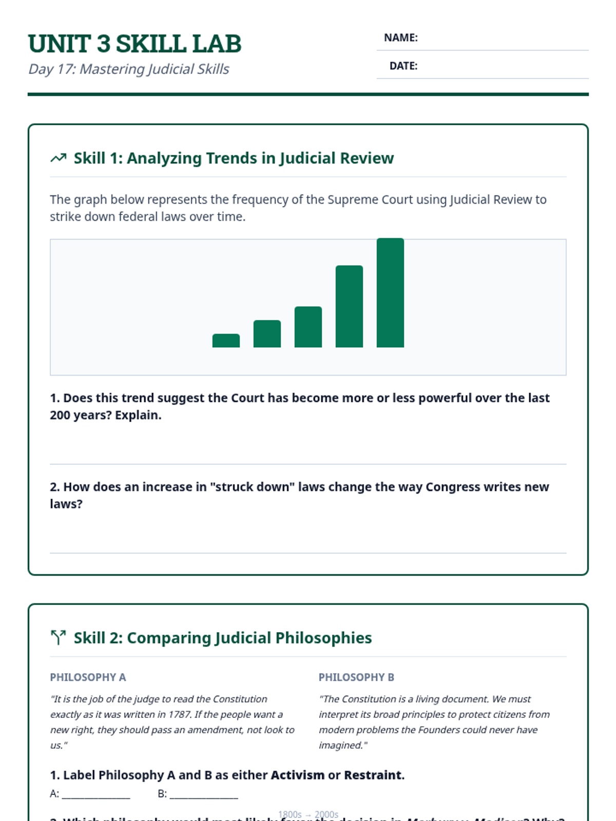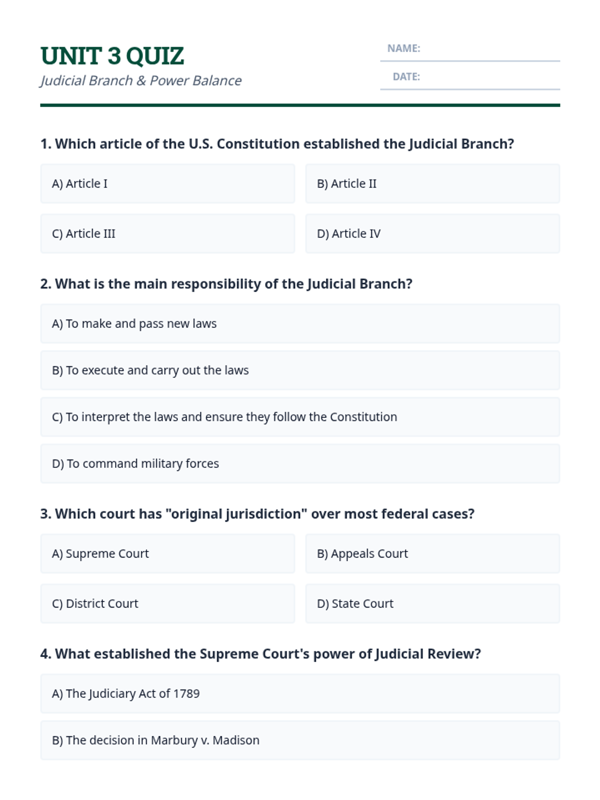 Explores the structure of the federal government with a focus on the Judicial branch, judicial review, and the system of checks and balances. Now Days 13-18.