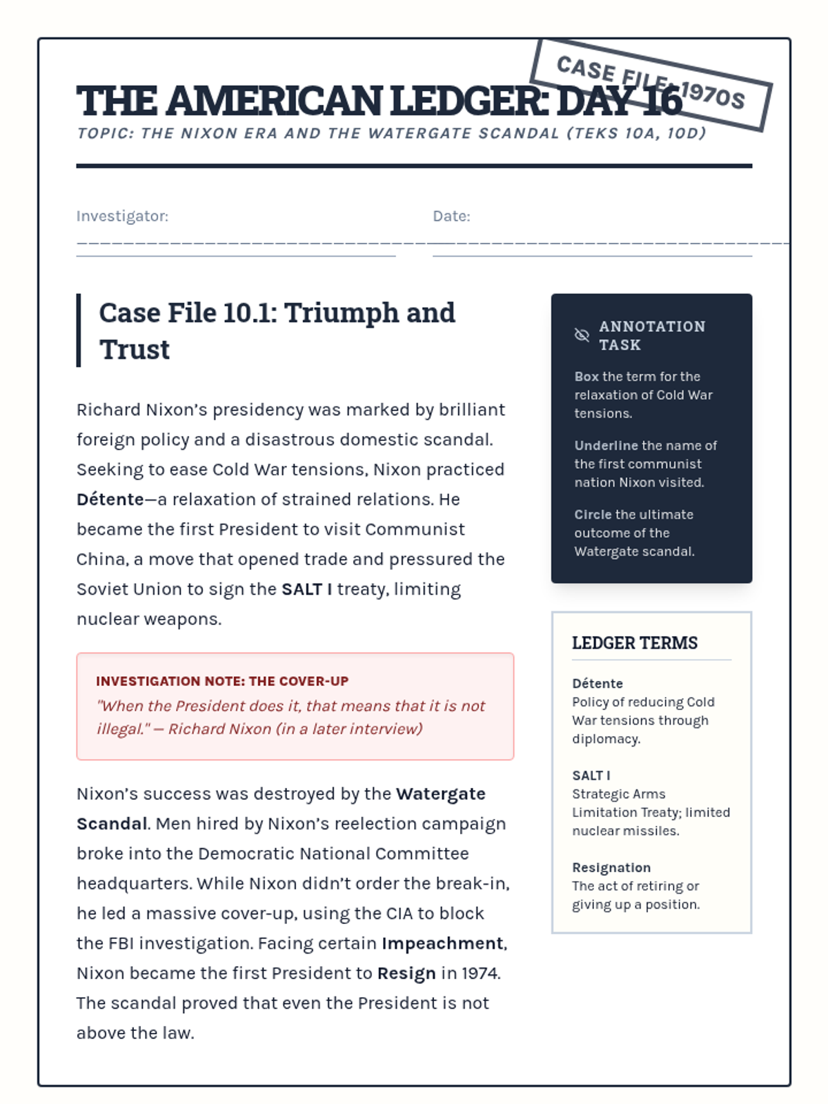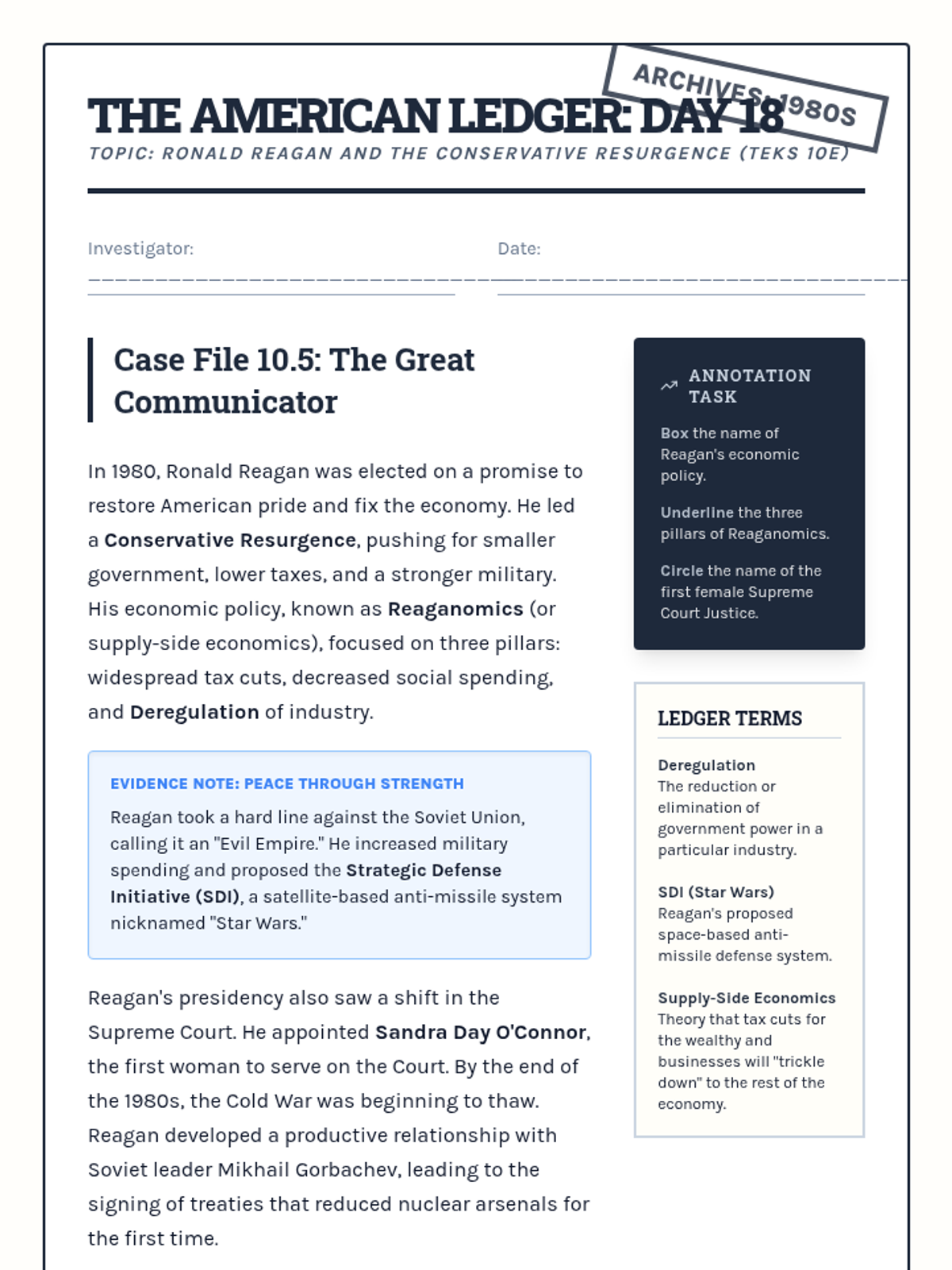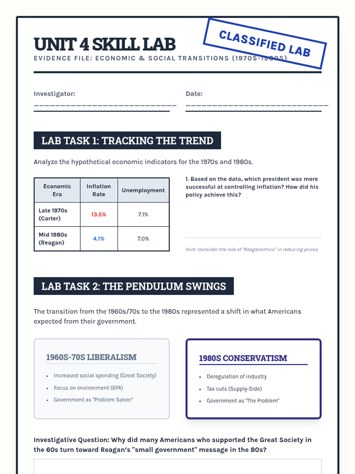 Covers the transition from the Nixon era through the Reagan revolution, focusing on economic shifts and the end of the Cold War. Includes TEKS 10A, 10B, and 10E.