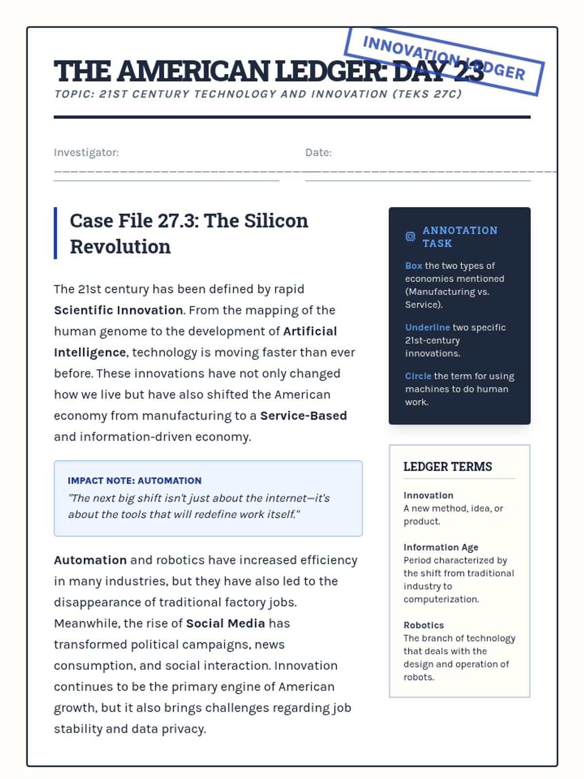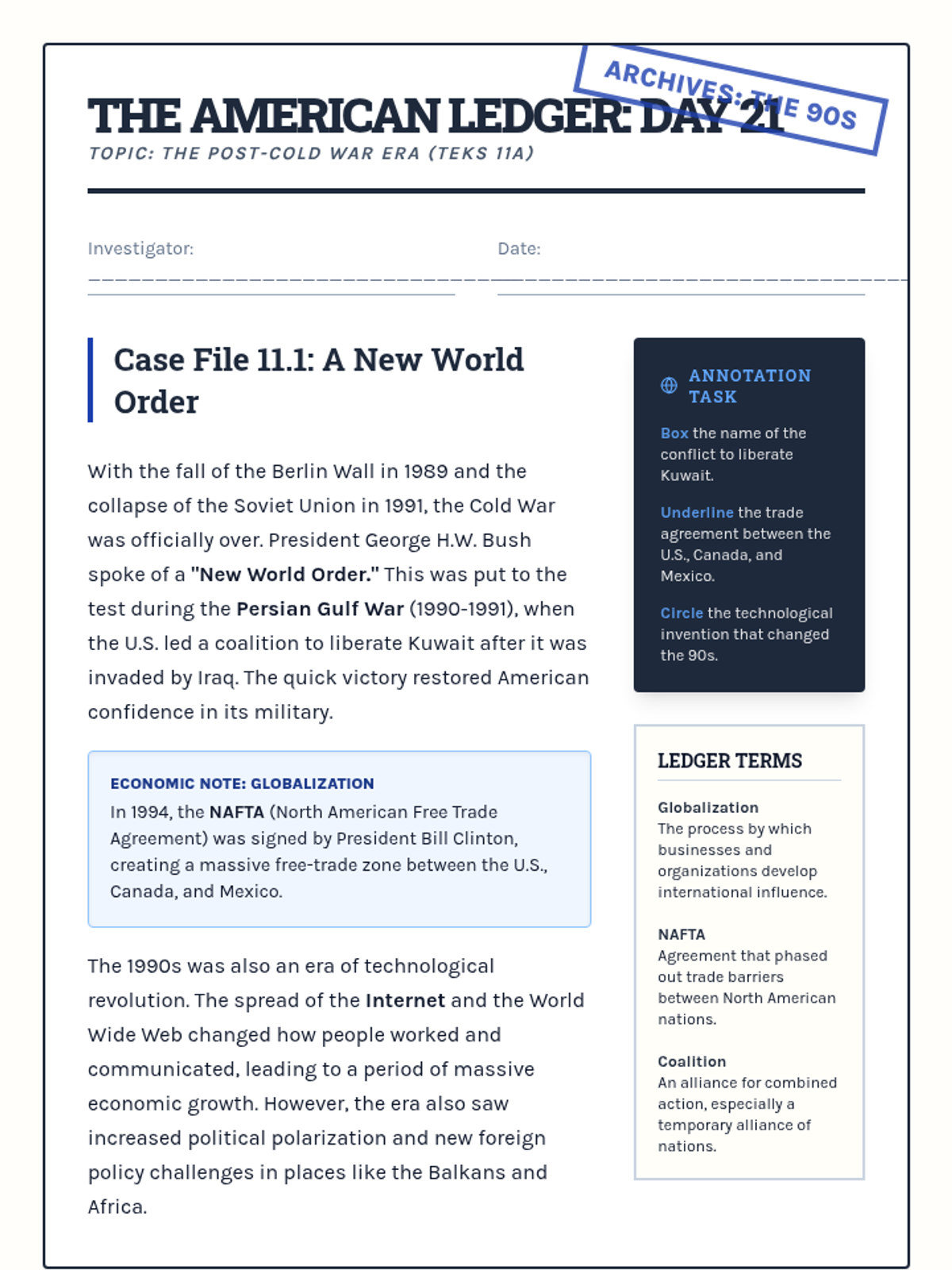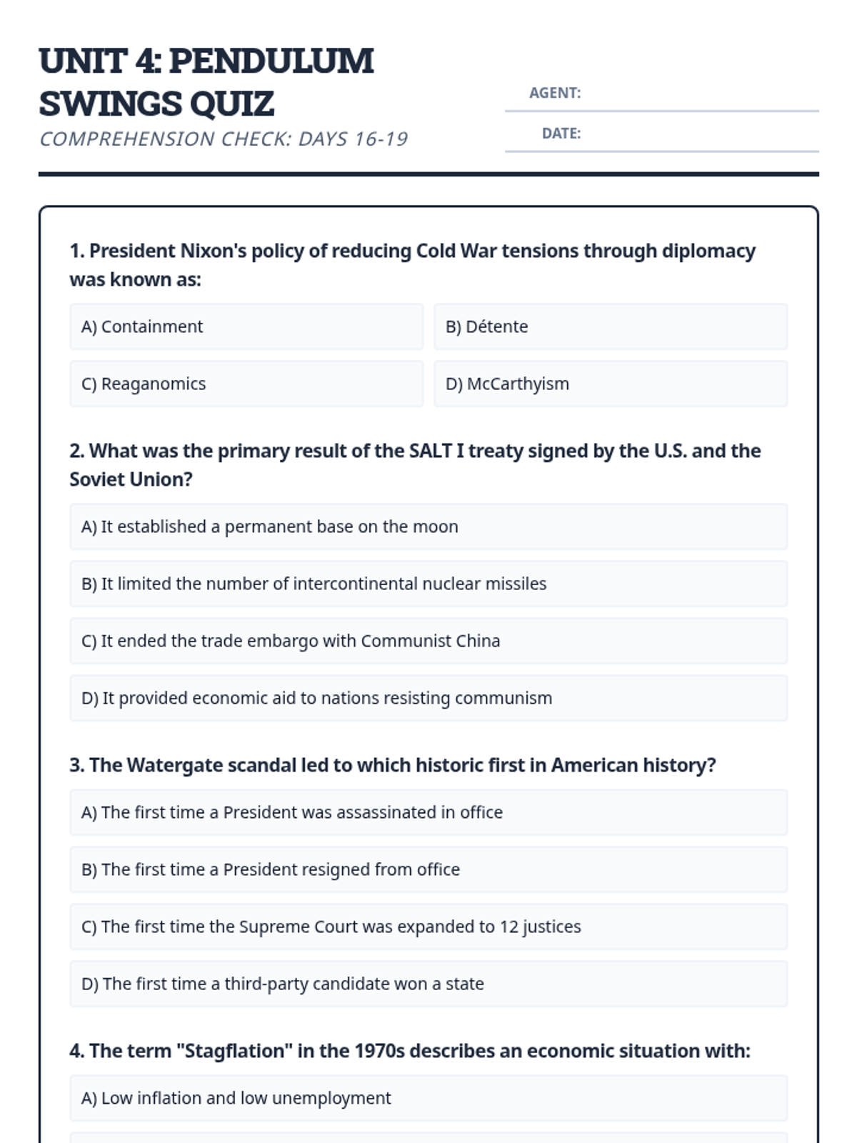 Covers the transition from the Nixon era through the Reagan revolution, focusing on economic shifts and the end of the Cold War. Includes TEKS 10A, 10B, and 10E.