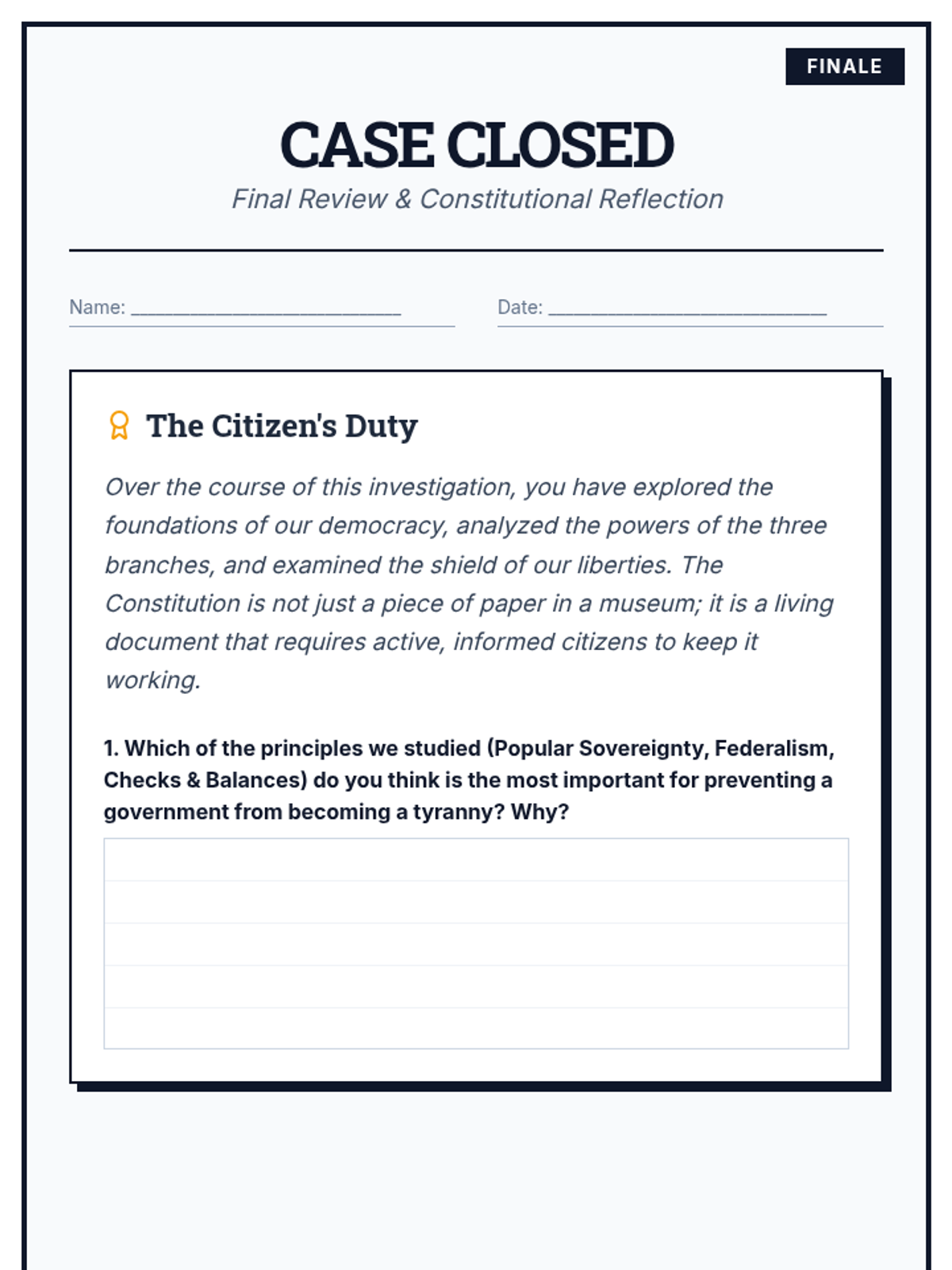 The final day of the 25-day remediation program, featuring a comprehensive review of all constitutional concepts and a final reflection on civil liberties.