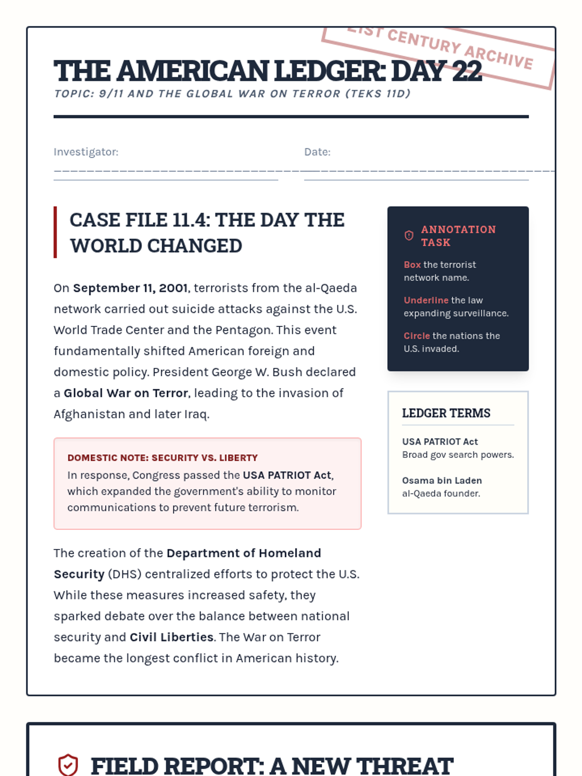Examines the post-Cold War era, 9/11, the War on Terror, and the impact of technology in the 21st century. Includes TEKS 11A, 11D, and 27C.