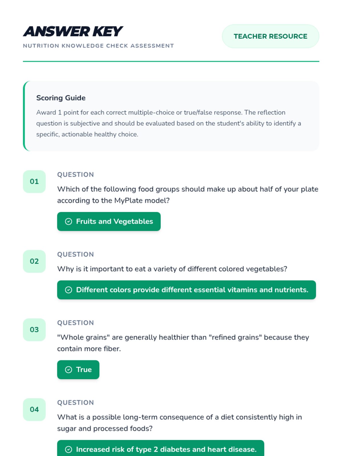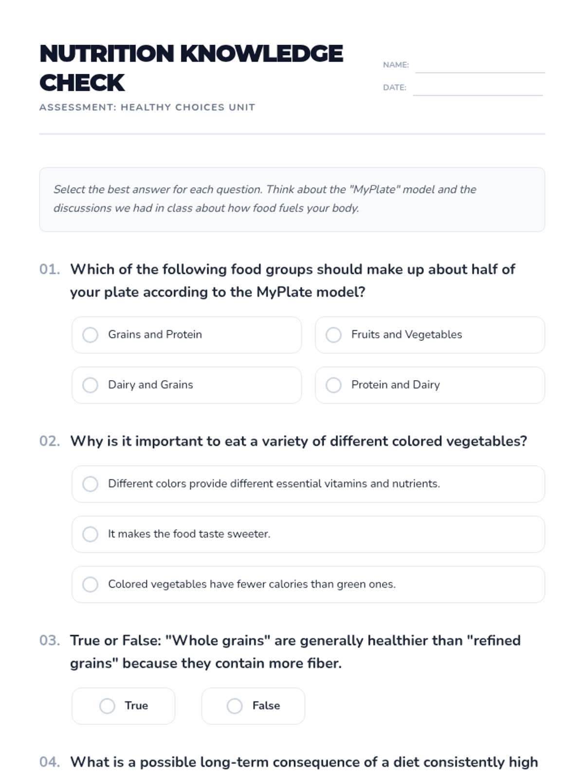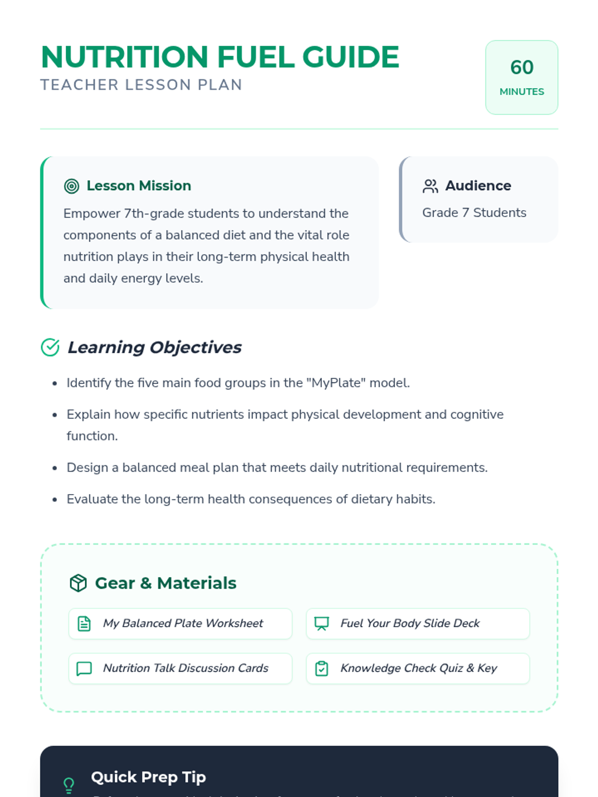 This lesson introduces 7th-grade students to the importance of nutrition and making healthy dietary choices. Students explore the concept of a balanced diet using the food plate model and discuss the impact of nutrition on physical health and long-term well-being.