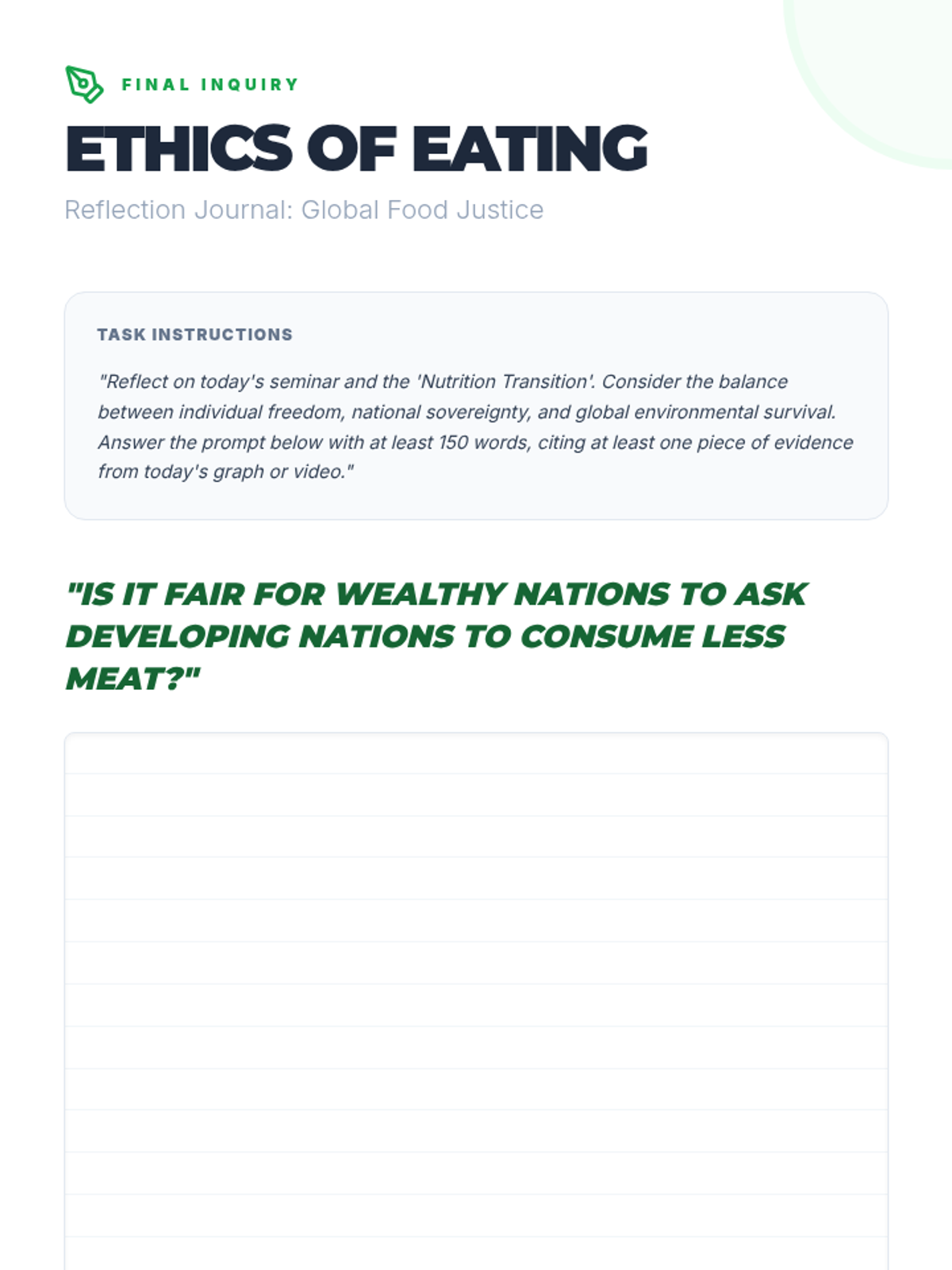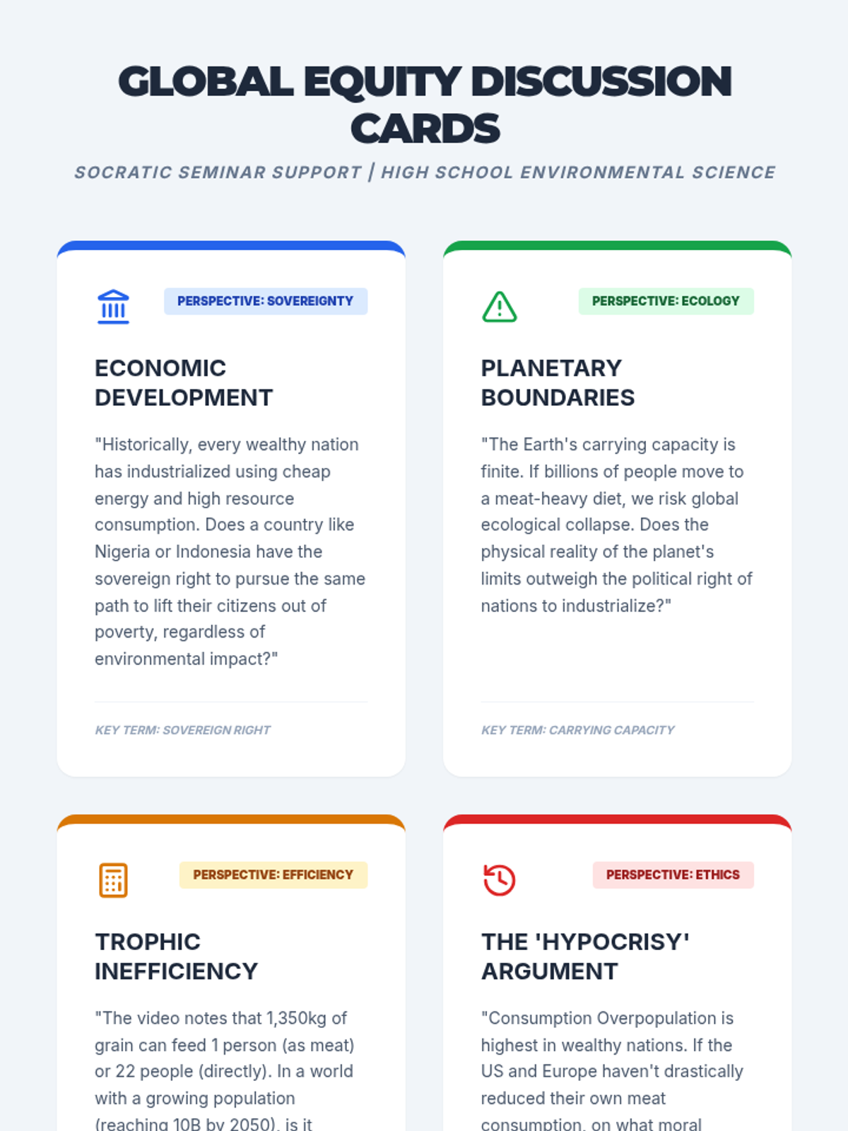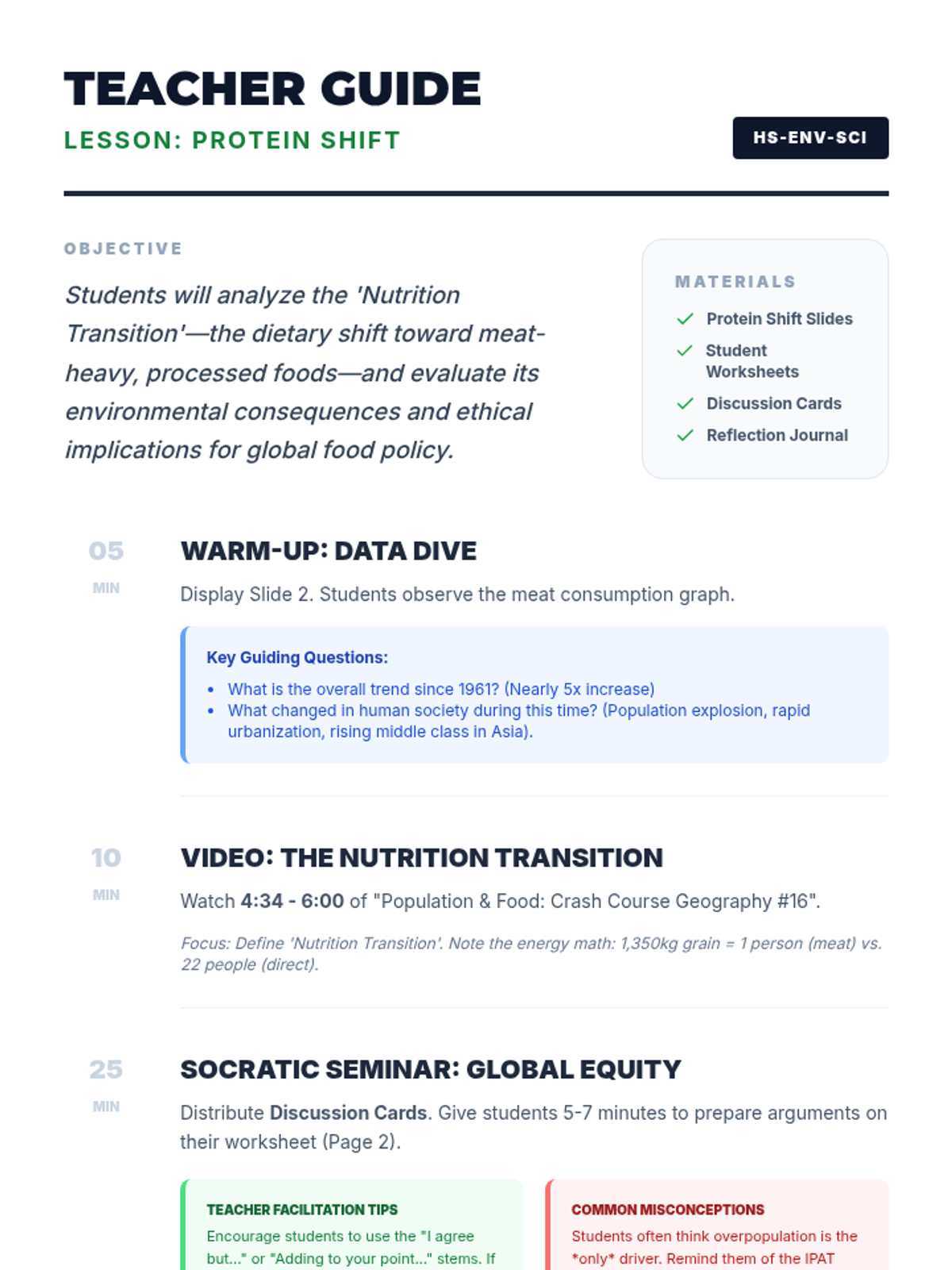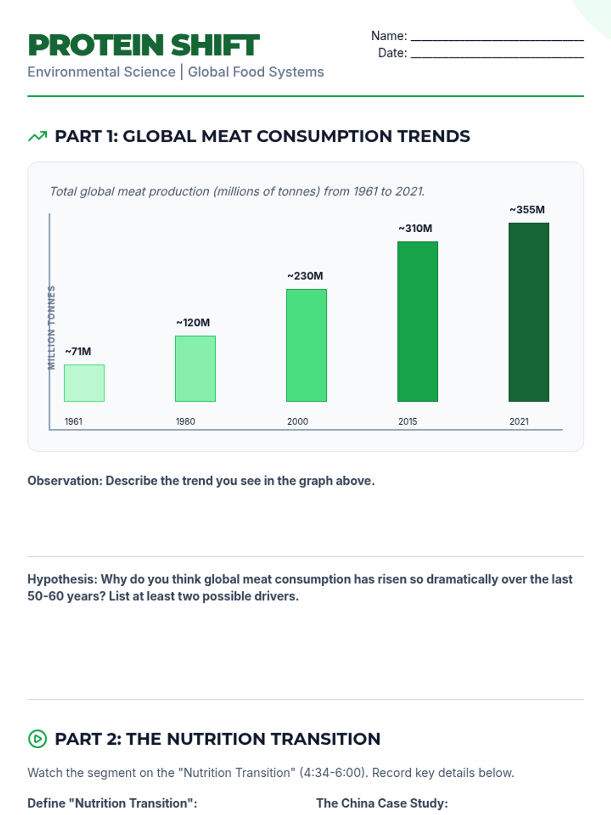 A high school environmental science lesson exploring the 'Nutrition Transition'—the global shift toward meat-heavy diets as wealth increases—and its environmental and ethical implications. Students analyze consumption data, watch a case study on China, and engage in a Socratic Seminar on global food equity.