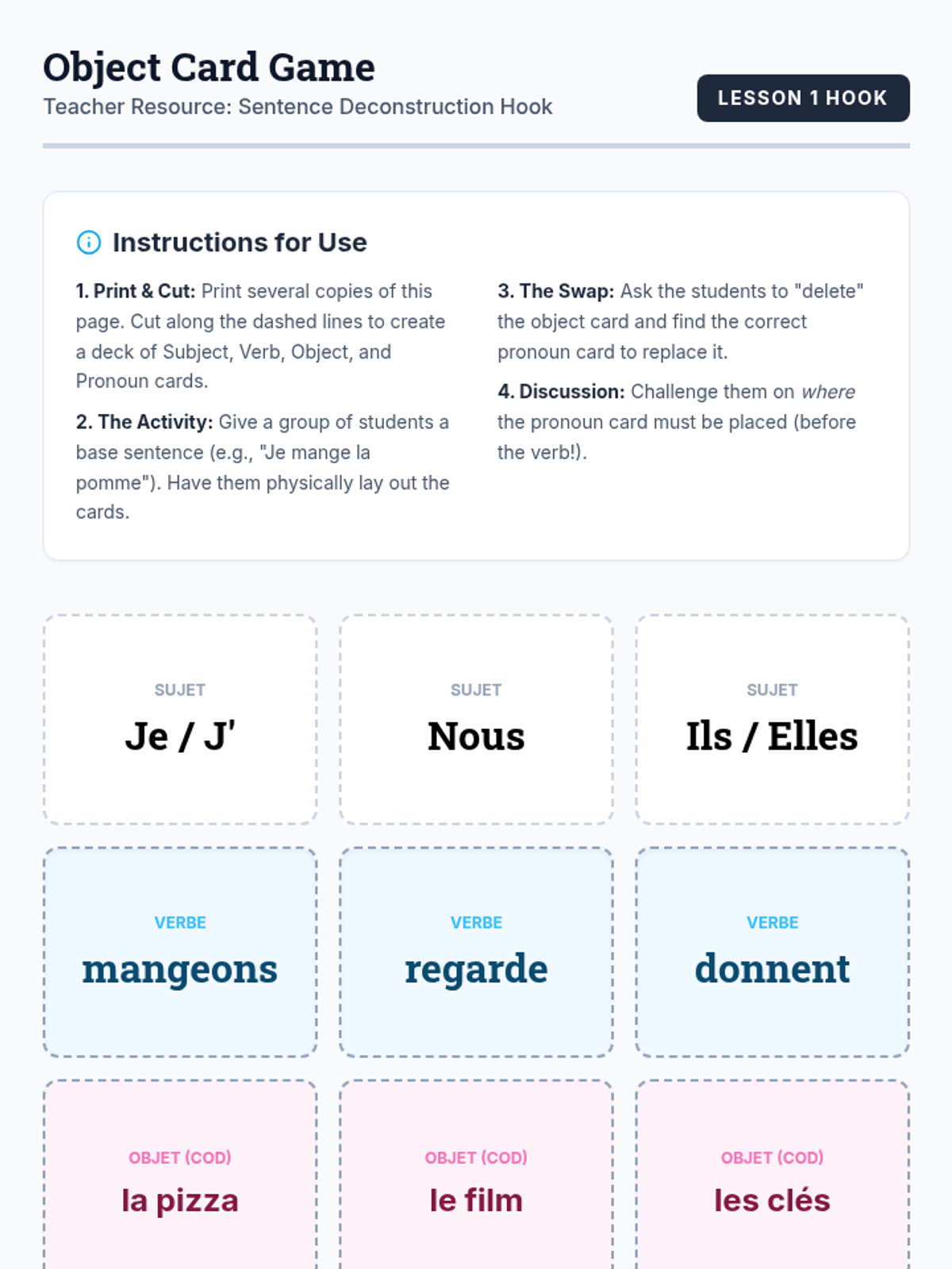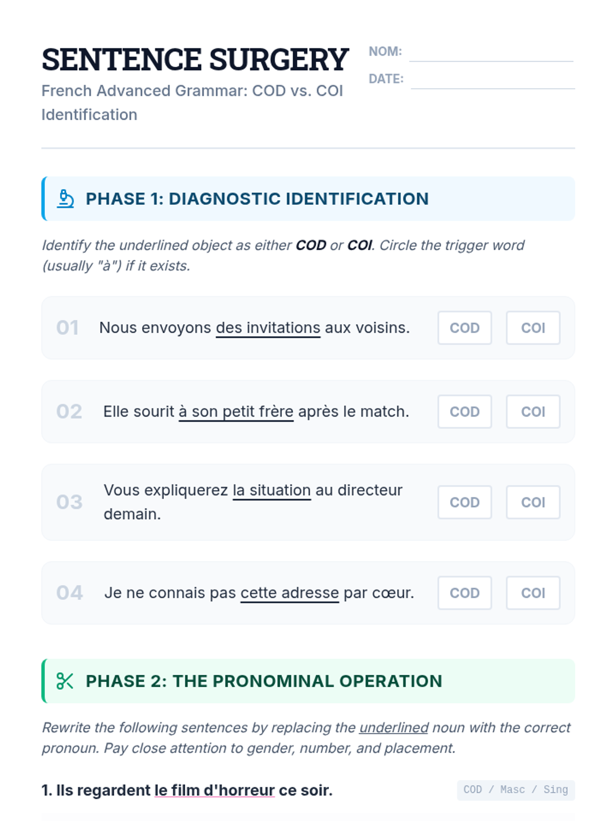 Students clarify the grammatical distinction between COD (Direct Object) and COI (Indirect Object) through sentence analysis and practice single pronoun replacement.