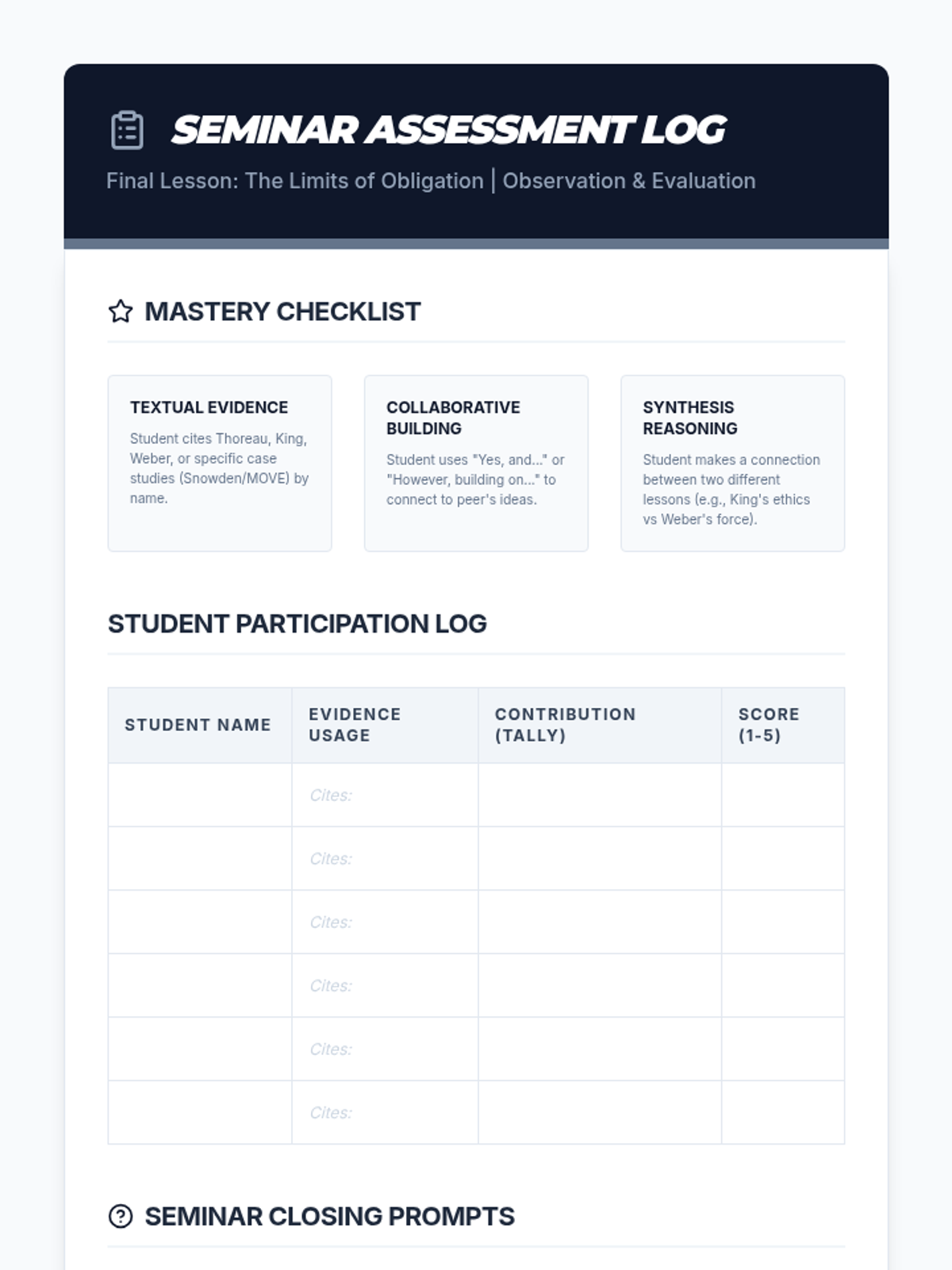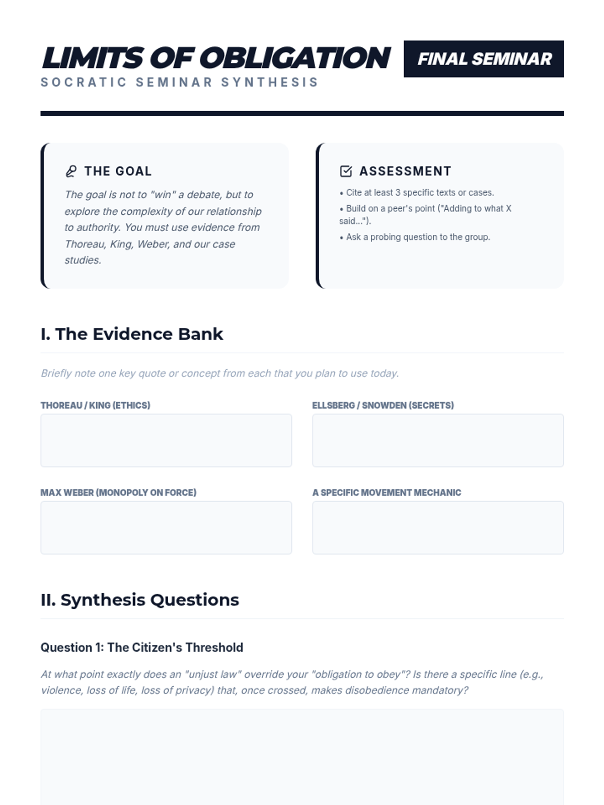 A culminating Socratic Seminar where students synthesize the sequence's themes to discuss the limits of a citizen's obligation to the law.