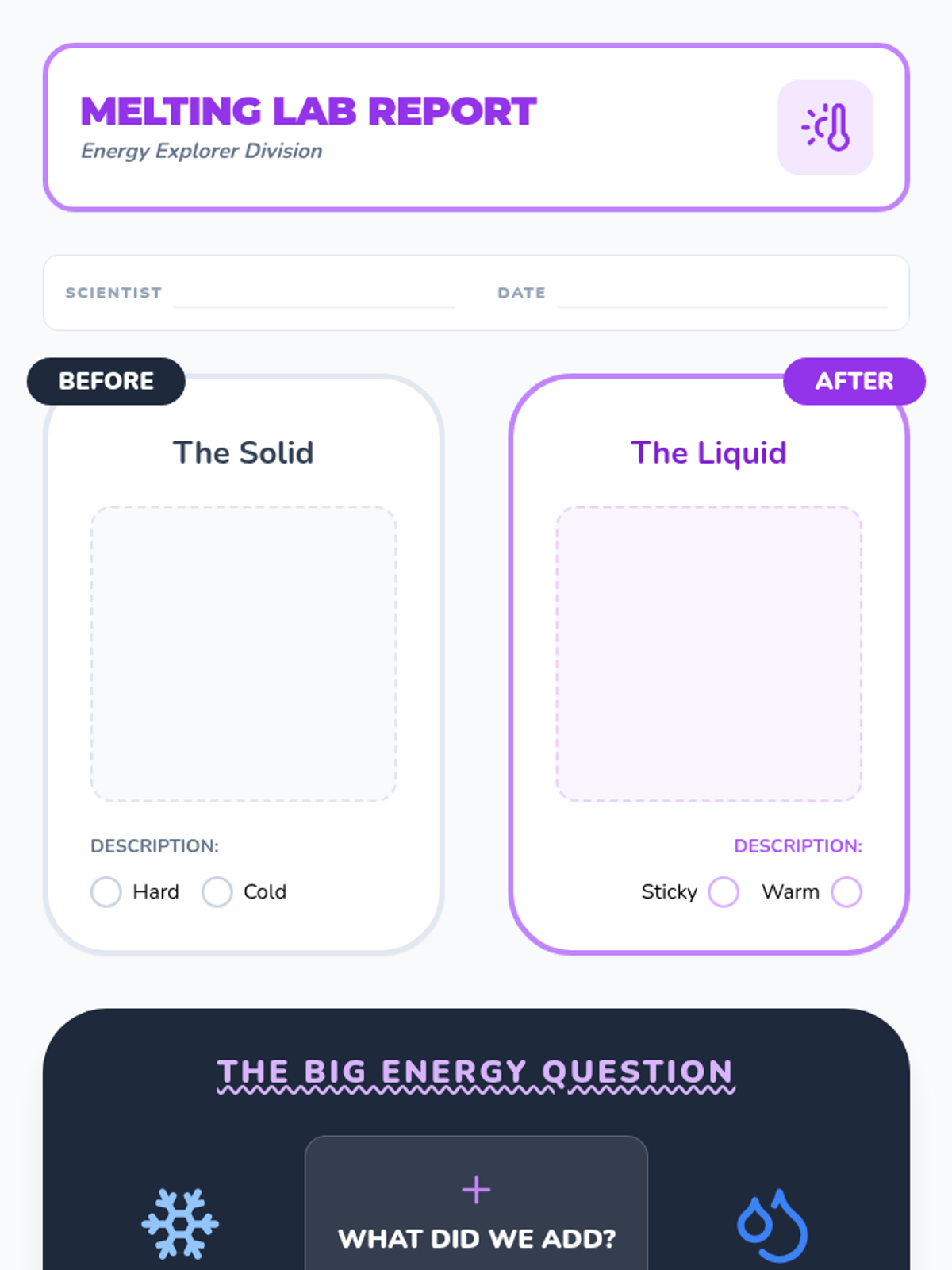Students observe how adding heat energy changes solids to liquids (melting).
