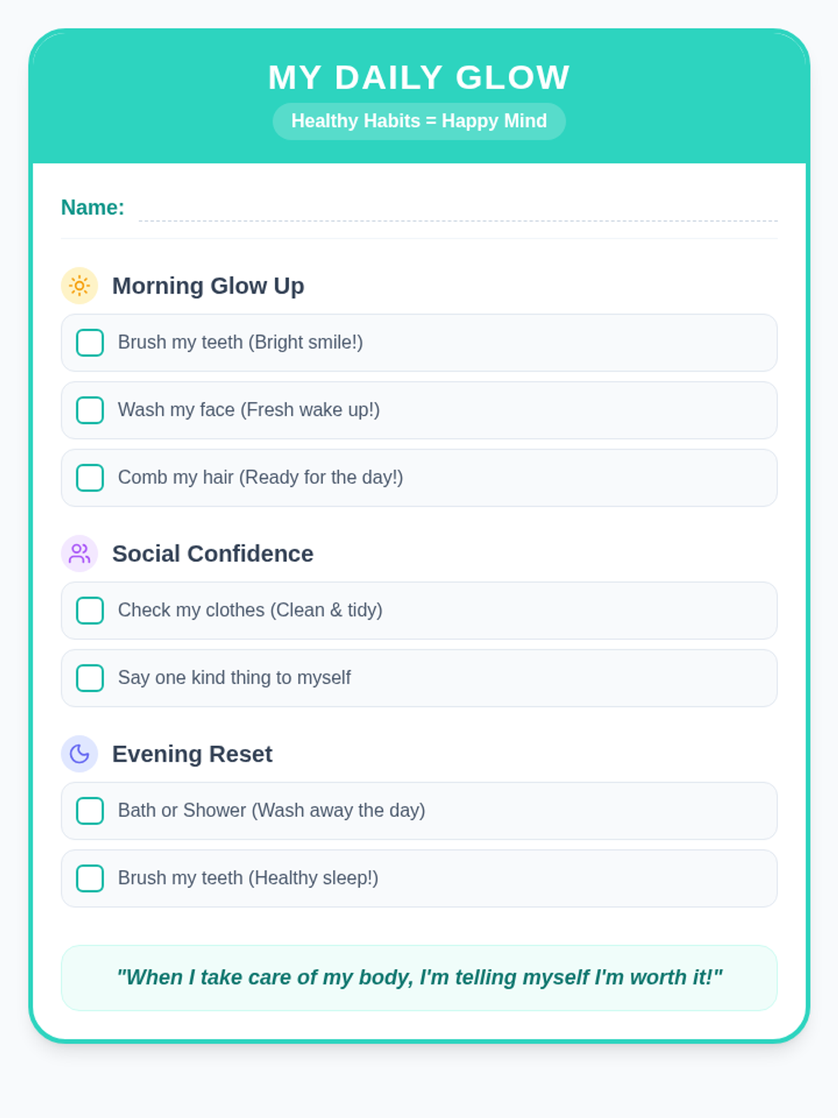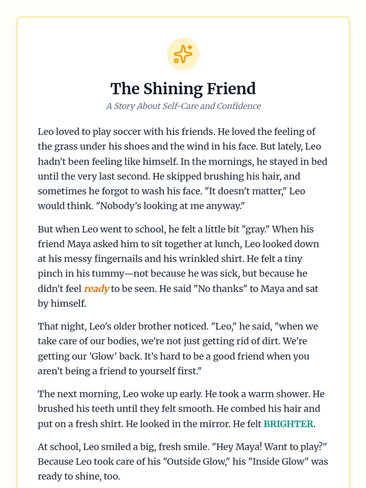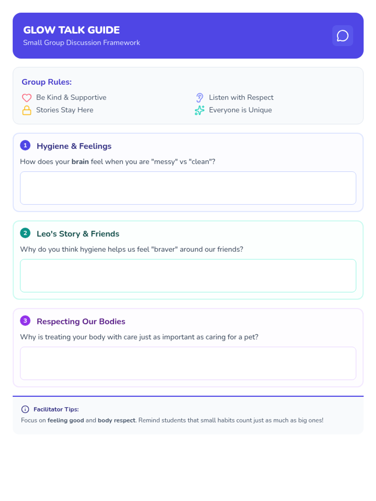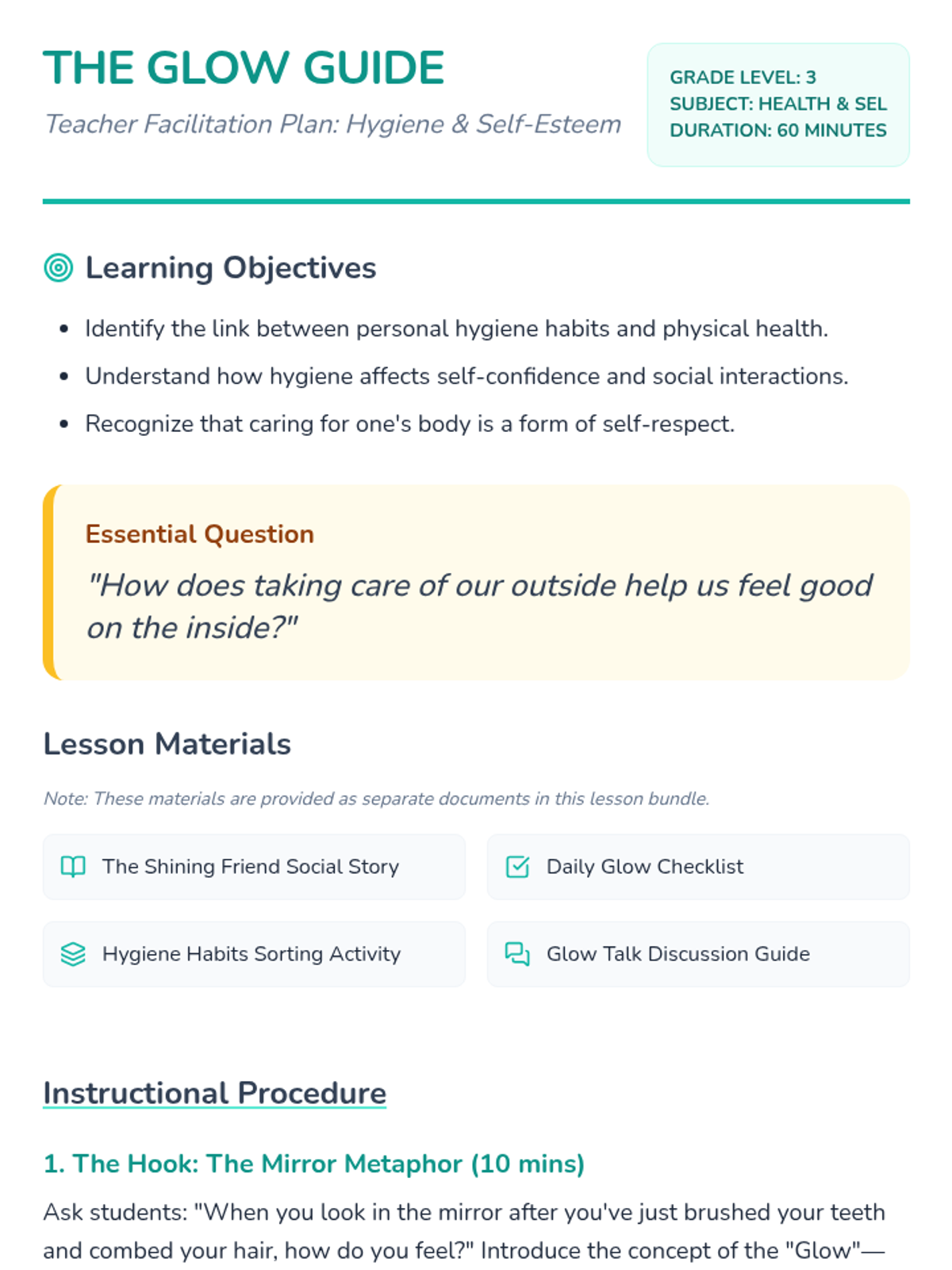 A holistic health lesson for 3rd graders exploring the connection between personal hygiene habits and their social-emotional well-being, focusing on friendship and self-esteem.