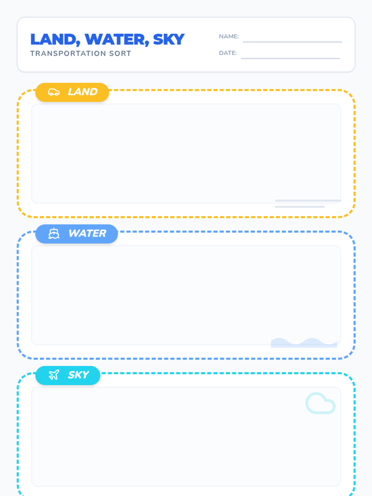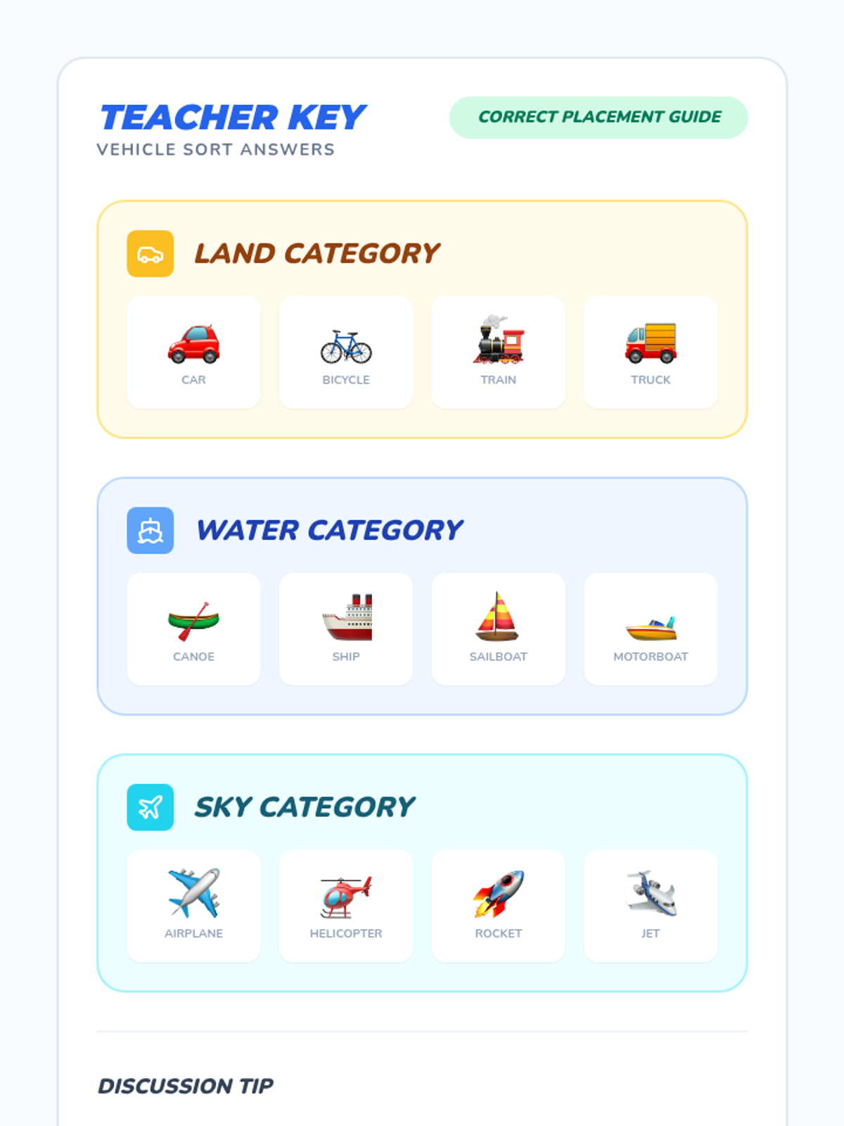 A Kindergarten lesson focused on categorizing transportation into land, water, and air modes through video observation and a hands-on sorting activity.