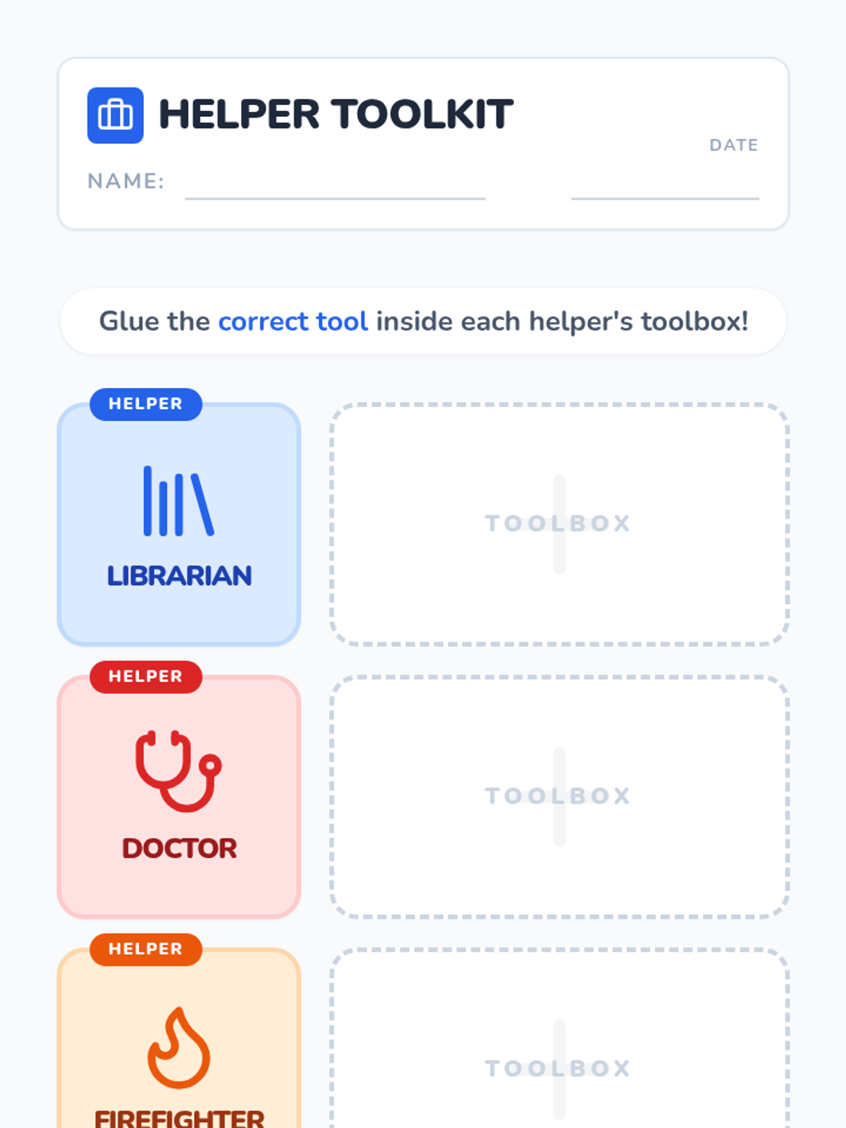 A fun, interactive lesson for Pre-K and Kindergarten students to identify community helpers and the tools they use to help others. Includes a song-based video, a guessing game, and a hands-on matching activity.