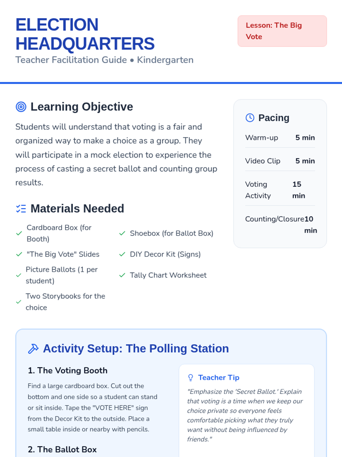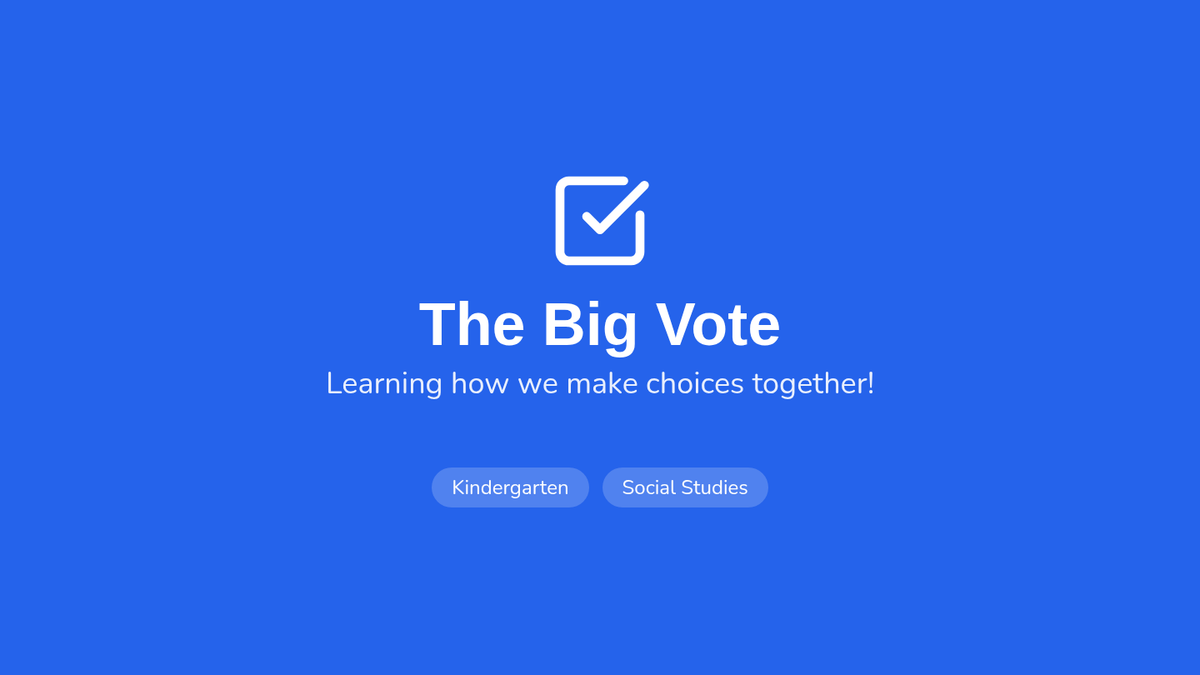A hands-on introduction to democracy for Kindergarten students, teaching the concept of voting as a fair way to make group decisions through a classroom storybook election.