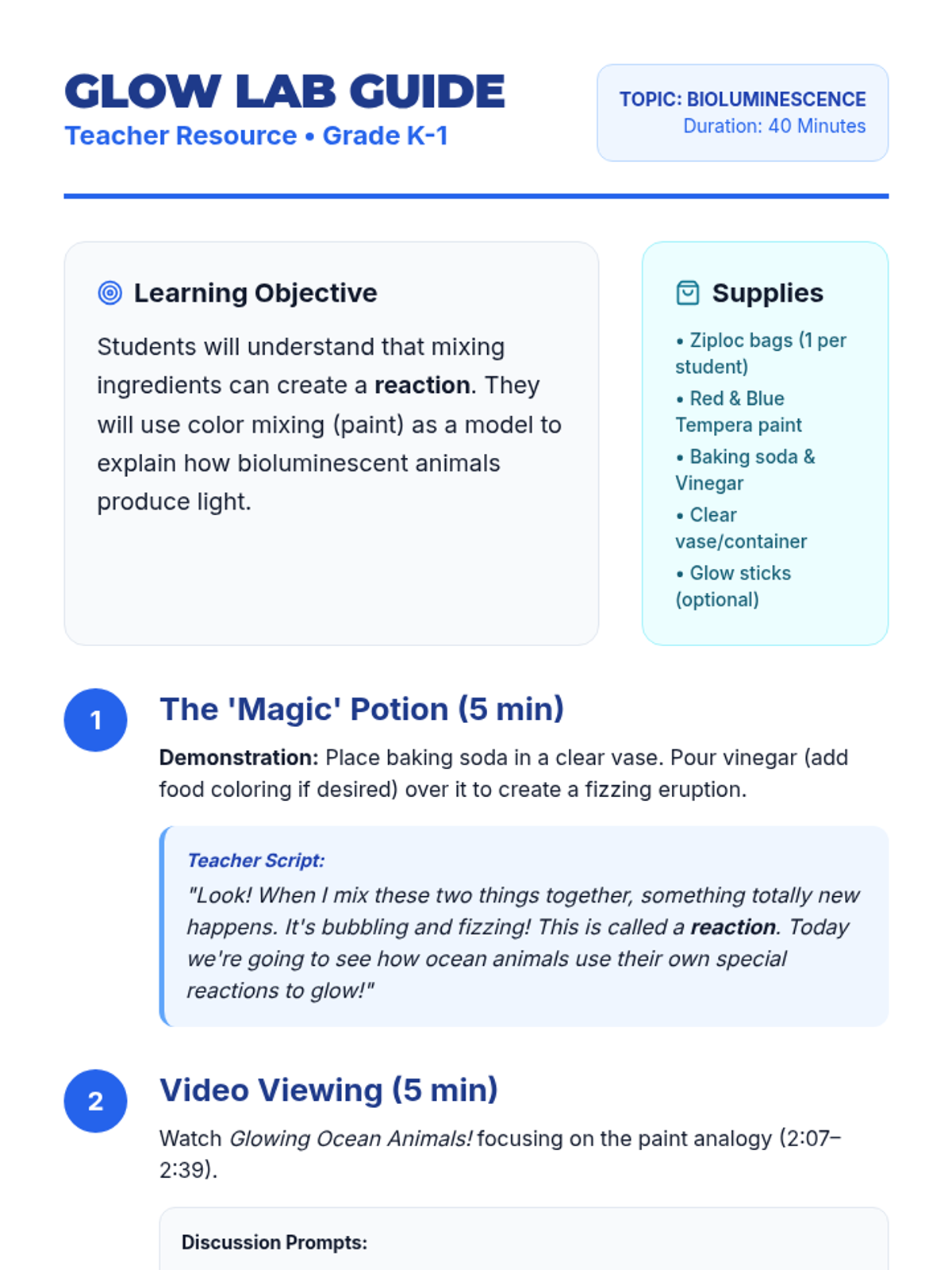 A Kindergarten/1st Grade science lesson exploring bioluminescence through chemical reactions and color mixing analogies. Includes a hands-on paint mixing activity to model how animals create light.
