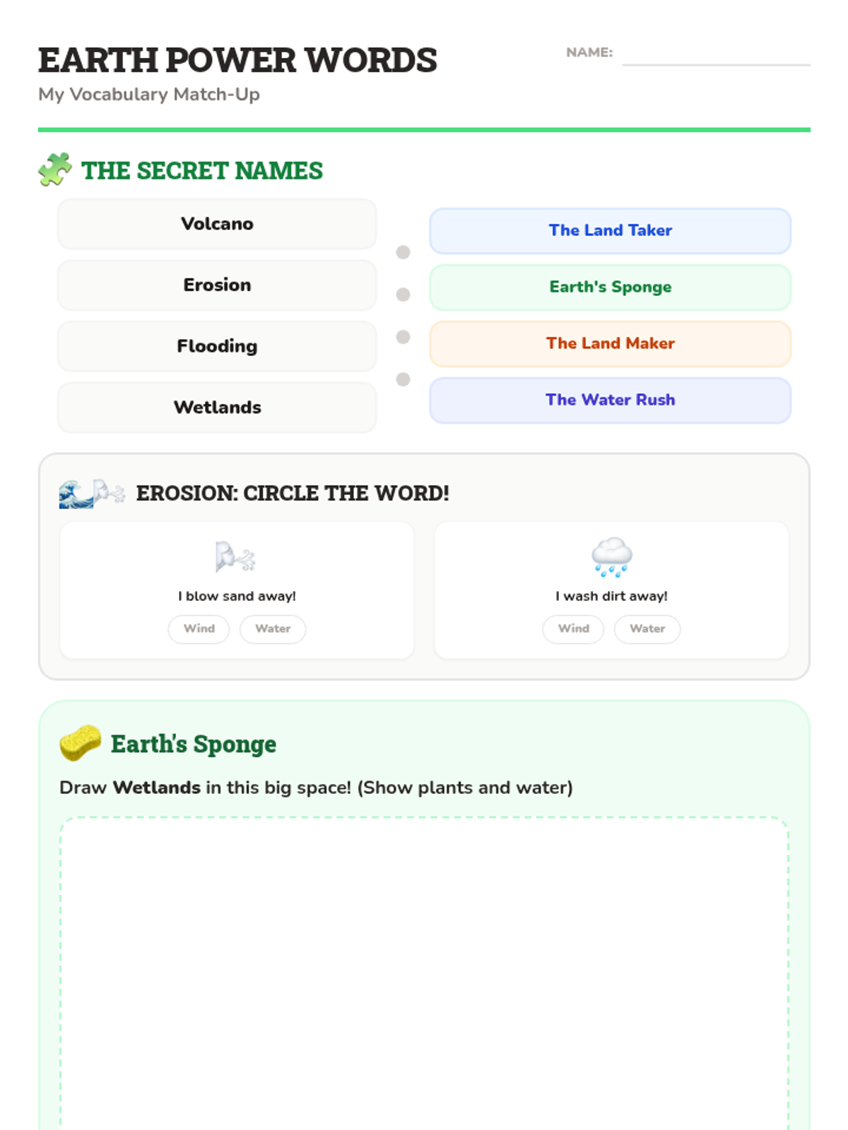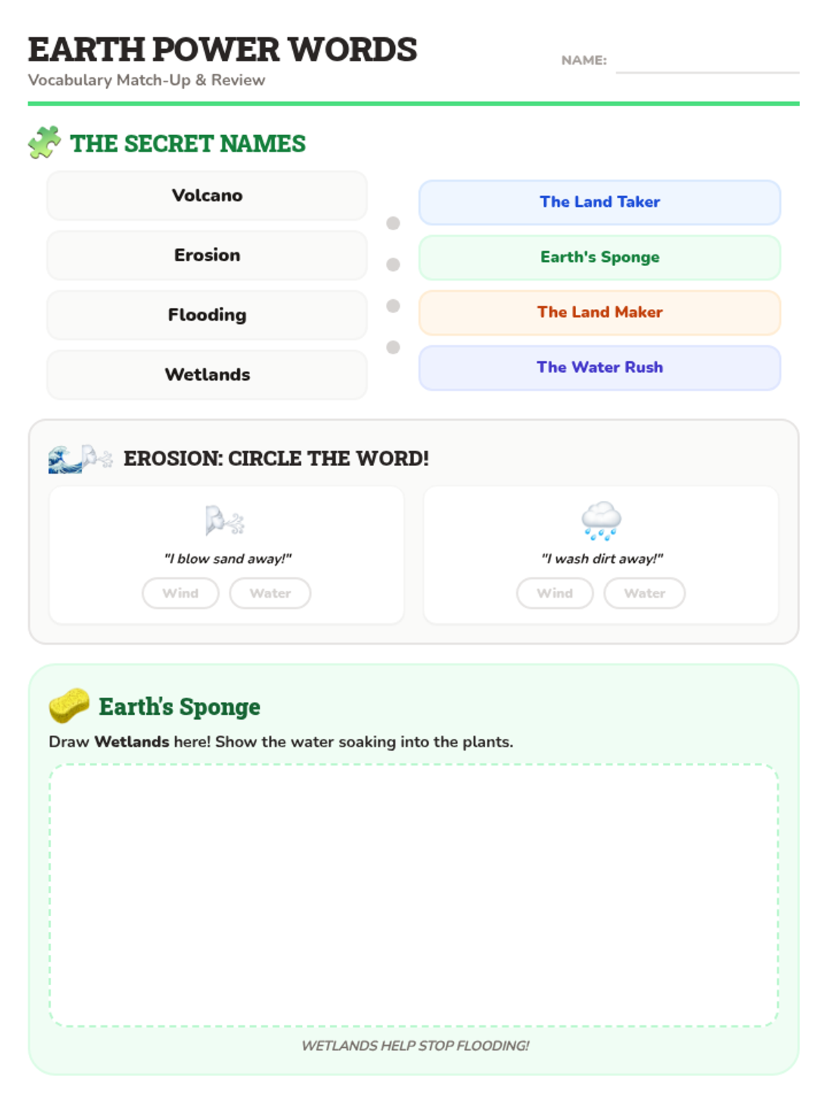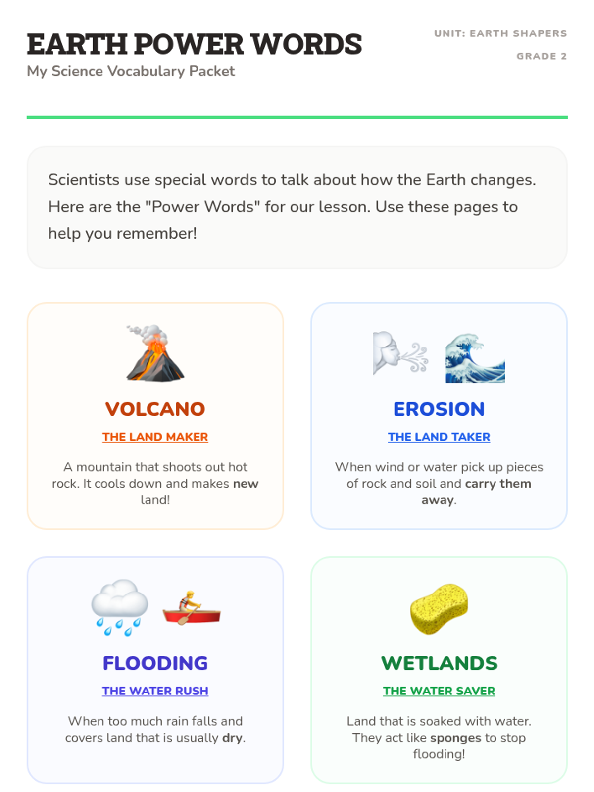 A vocabulary-focused lesson for 2nd graders to review key Earth science terms like volcano, erosion, flooding, and wetlands, using simple analogies and visual aids.
