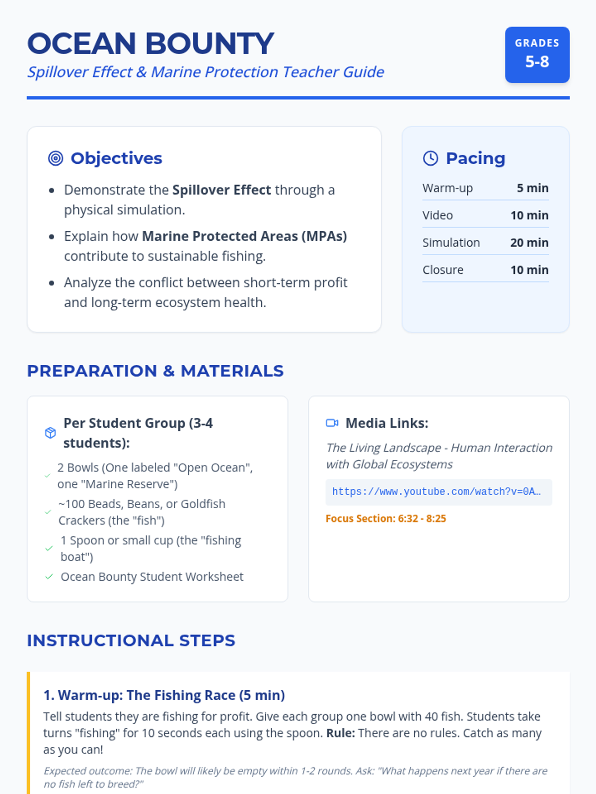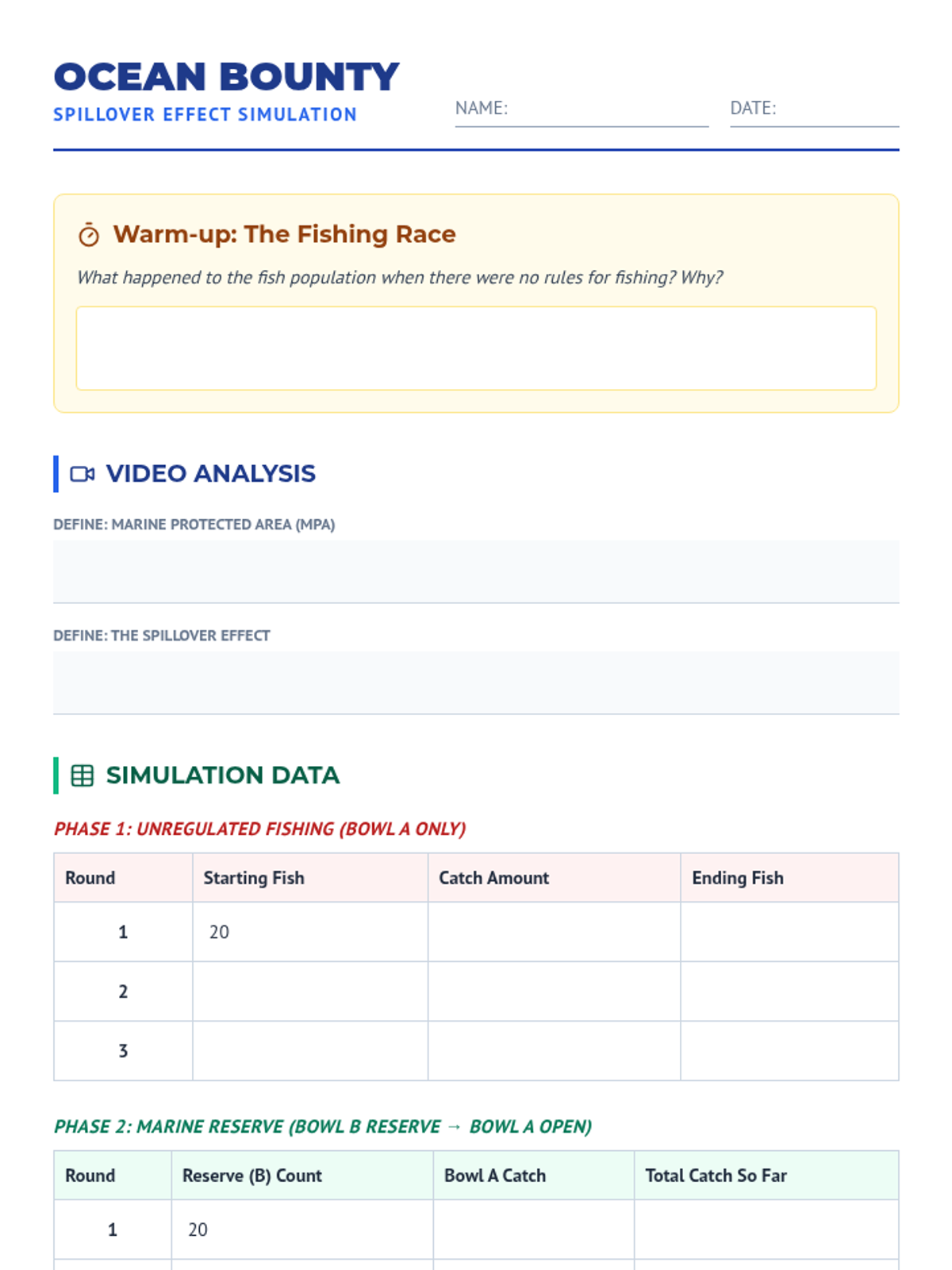 Students will explore the 'Spillover Effect' and the impact of Marine Protected Areas (MPAs) through a hands-on simulation, video analysis of the Galápagos Marine Reserve, and reflective writing.