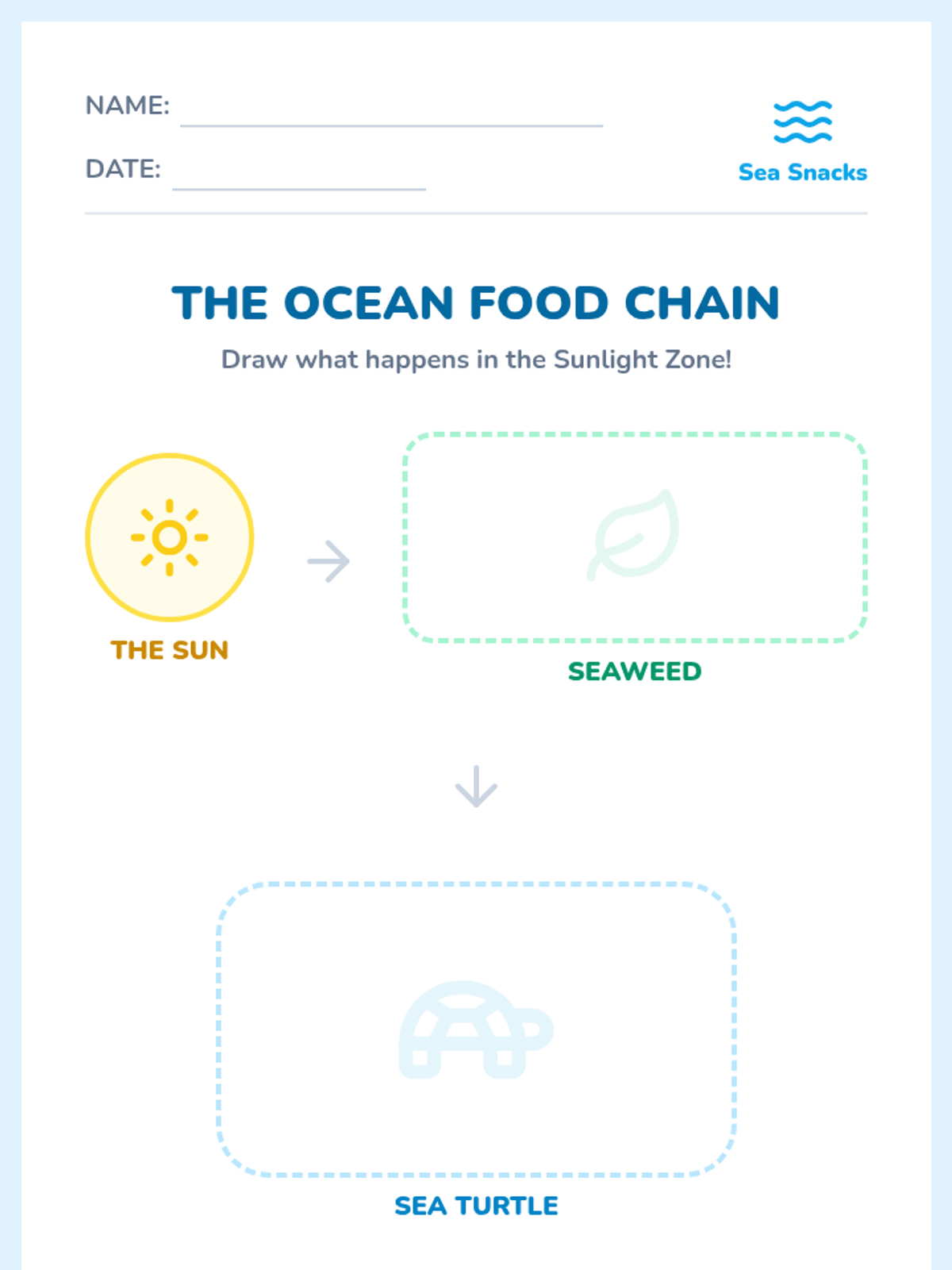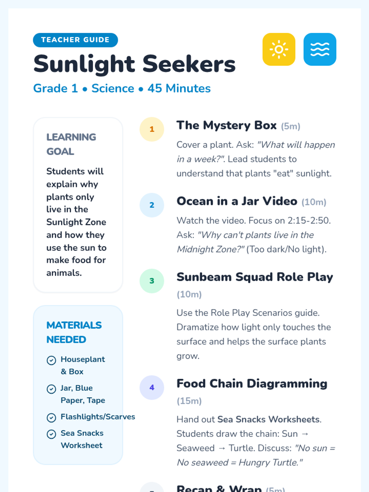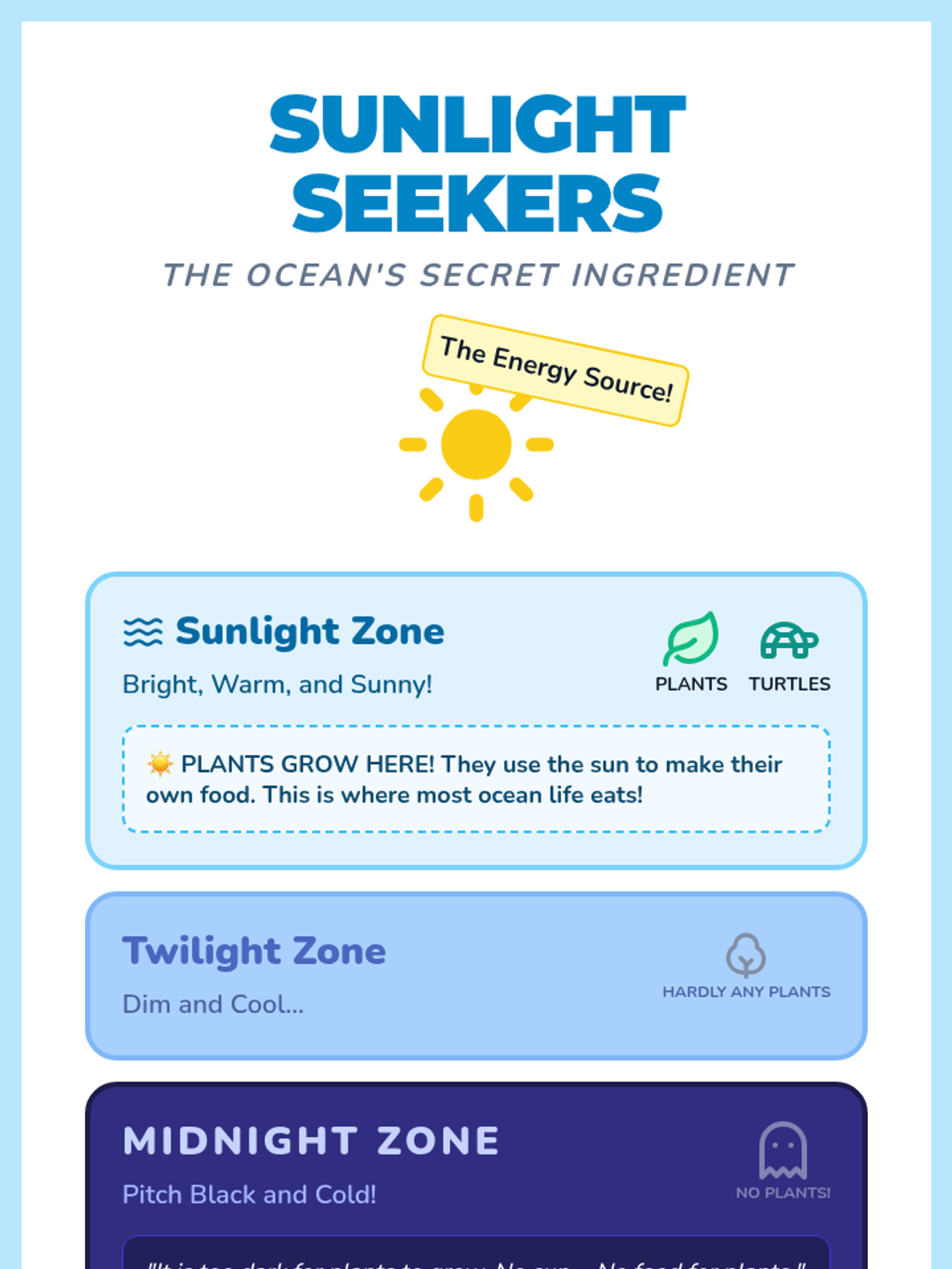 A 1st-grade science lesson exploring why plants only grow in the sunlight zone of the ocean and how the sun powers the entire marine food chain.