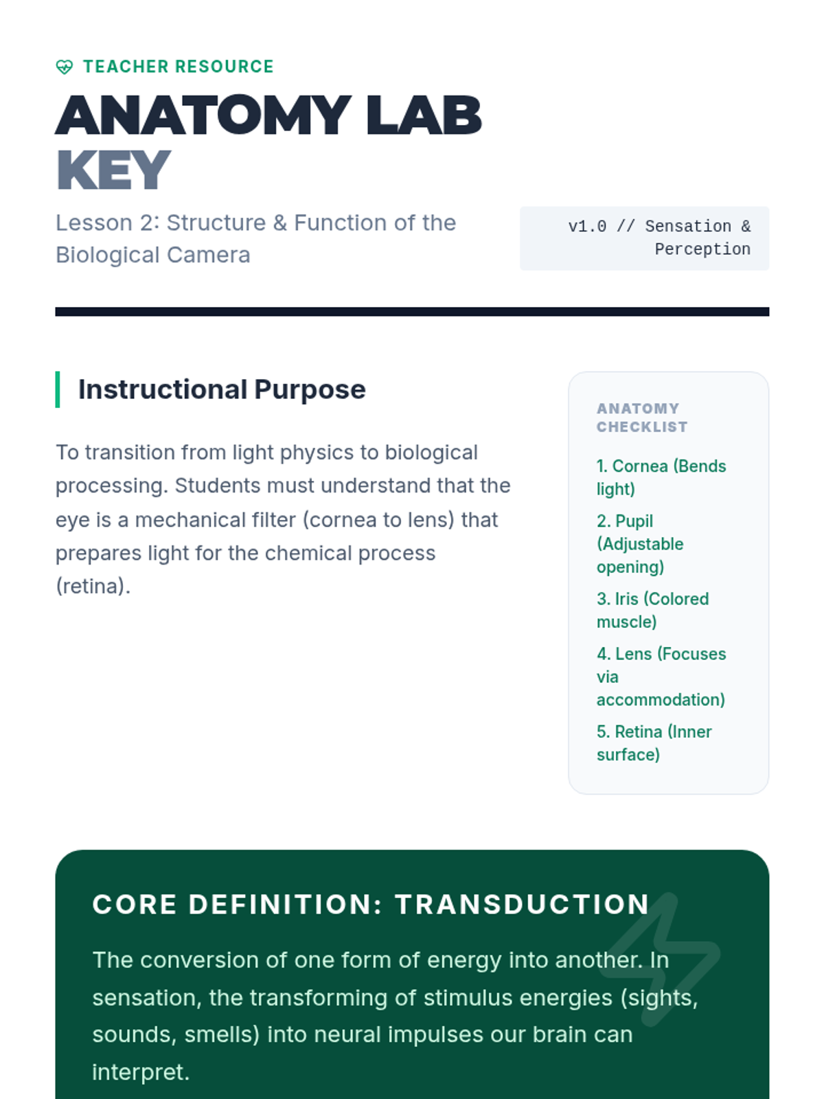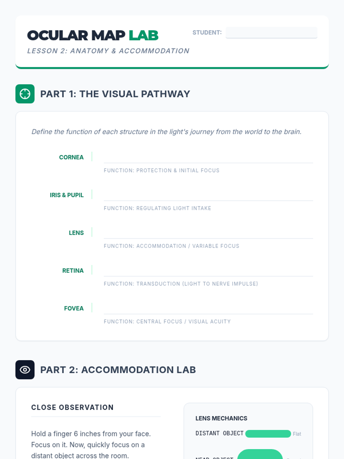 This lesson focuses on the path of light through the cornea, pupil, lens, and retina. Students label anatomical diagrams and simulate the process of accommodation using lenses. The session emphasizes the inversion of images on the retina and the role of the fovea in visual acuity.