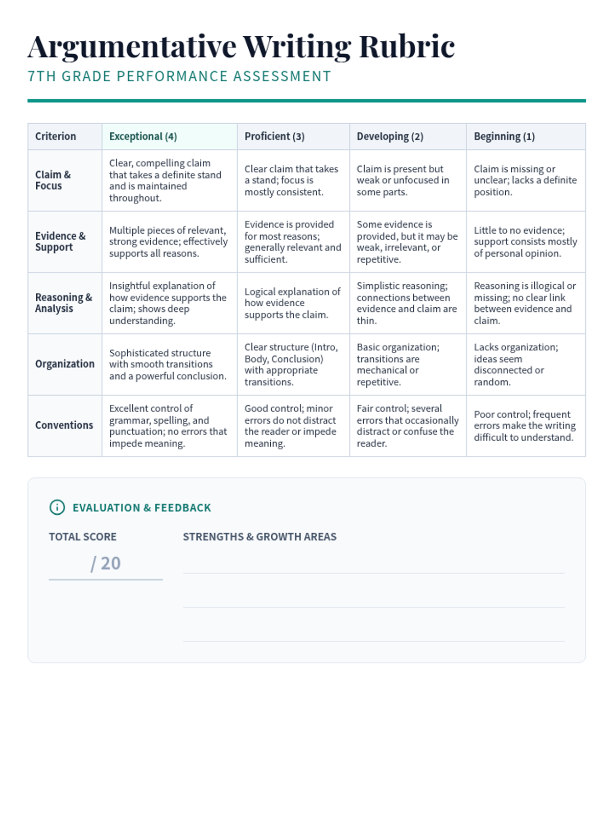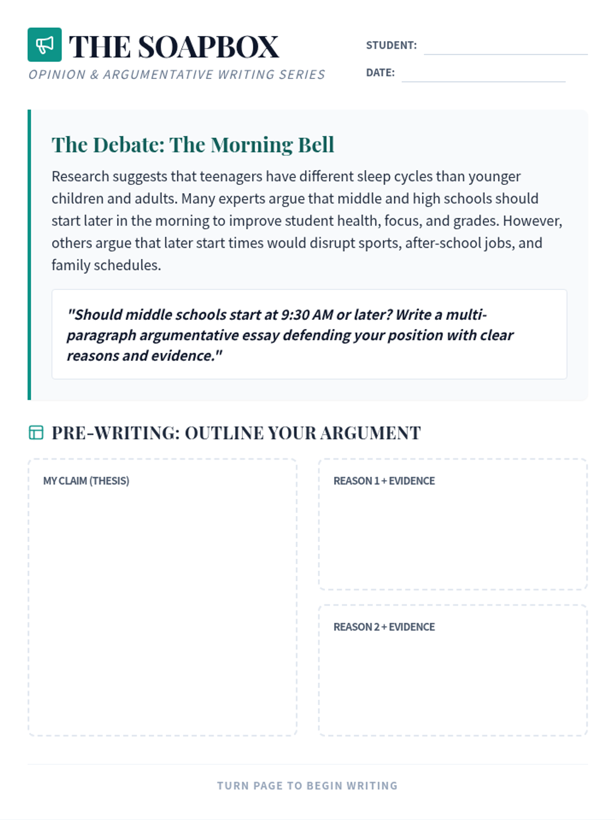 A focused writing lesson where students craft an argumentative essay about school start times, using a structured prompt and a clear rubric for evaluation.