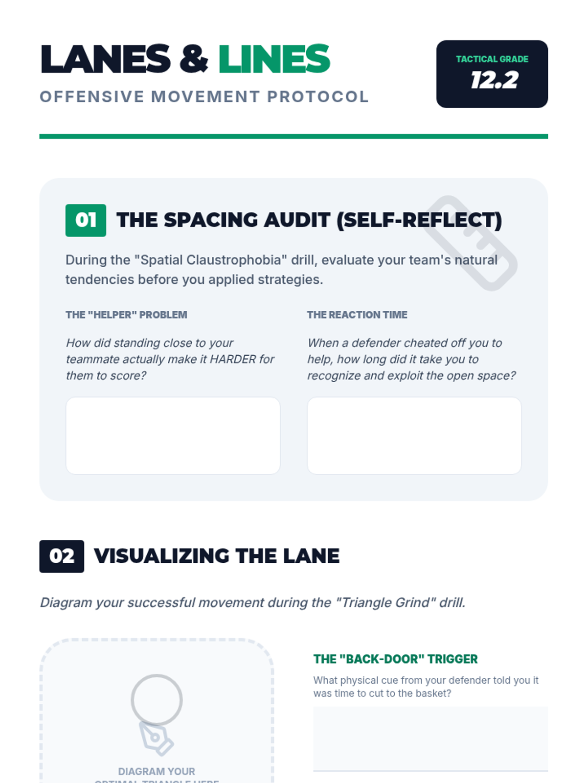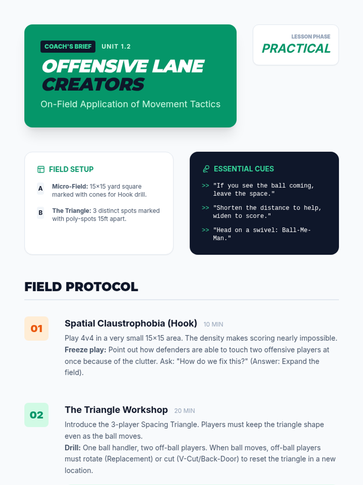 Focuses on 'off-ball' movement to manipulate defenders and open lanes. Students practice V-cuts and triangular spacing in small-sided games to experience how movement affects spatial availability.