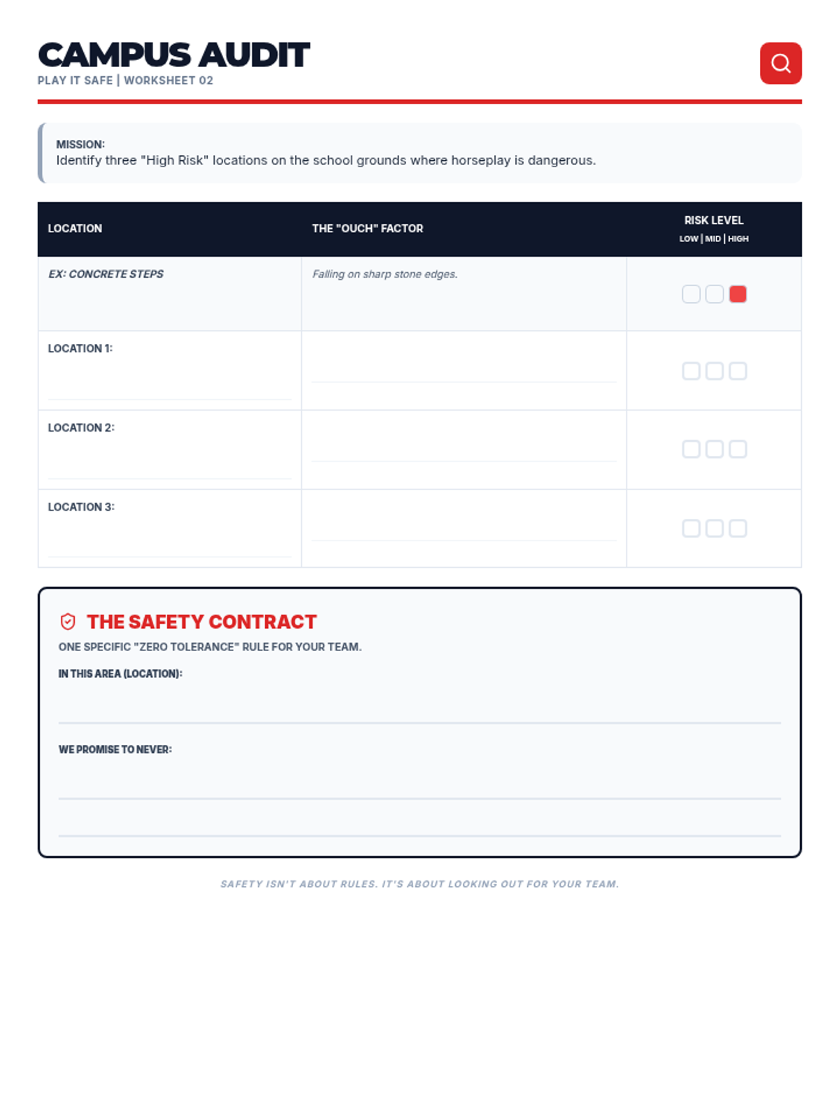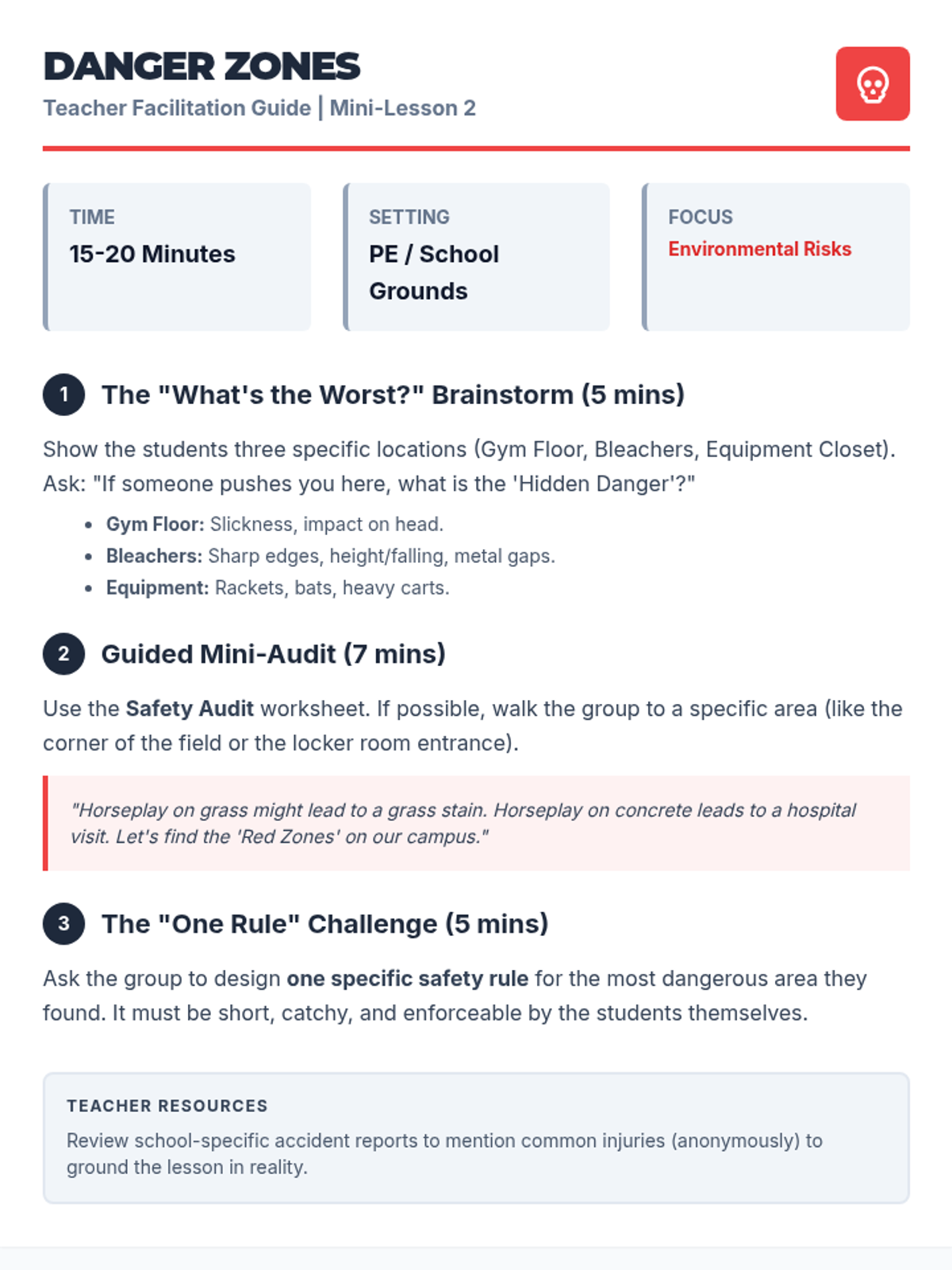 Identifies high-risk areas in PE and school grounds where hard surfaces and equipment turn horseplay into serious danger.