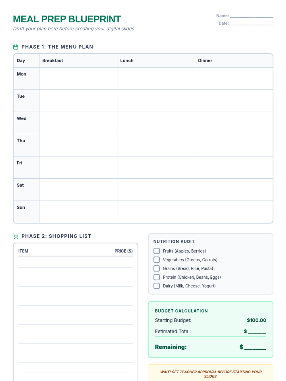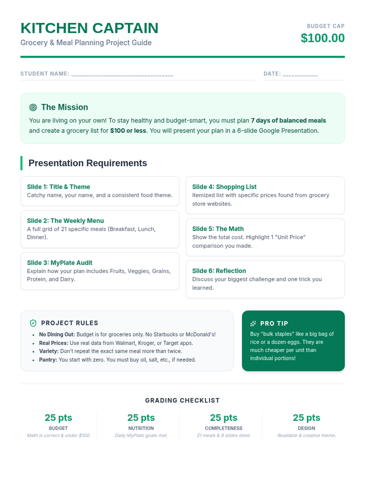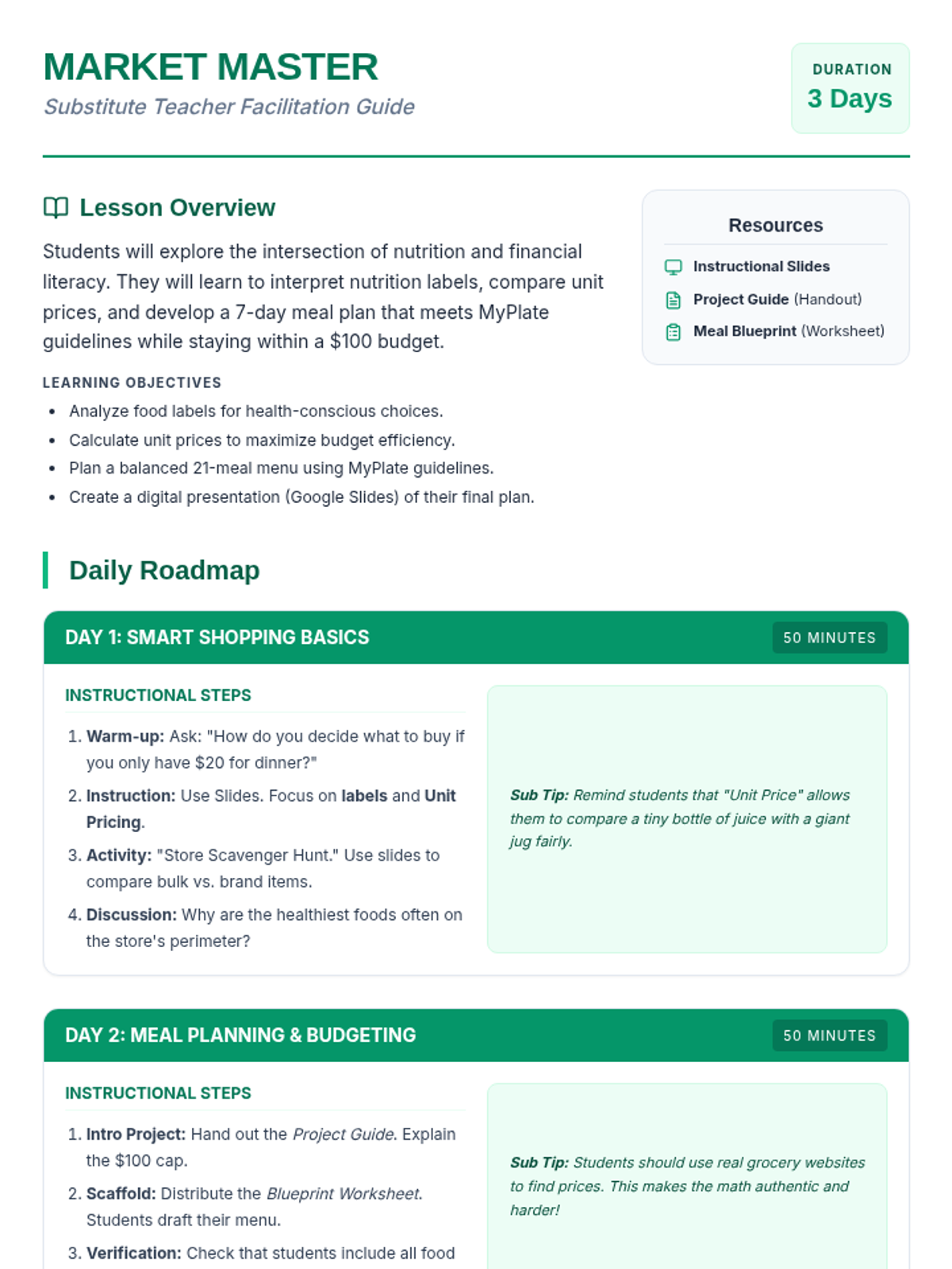 A comprehensive 3-day health lesson teaching students how to balance nutritional needs with a budget through meal planning and smart grocery shopping.