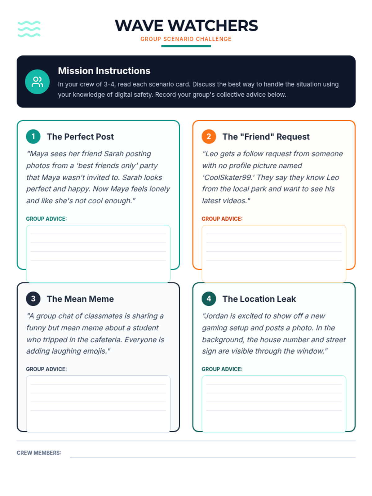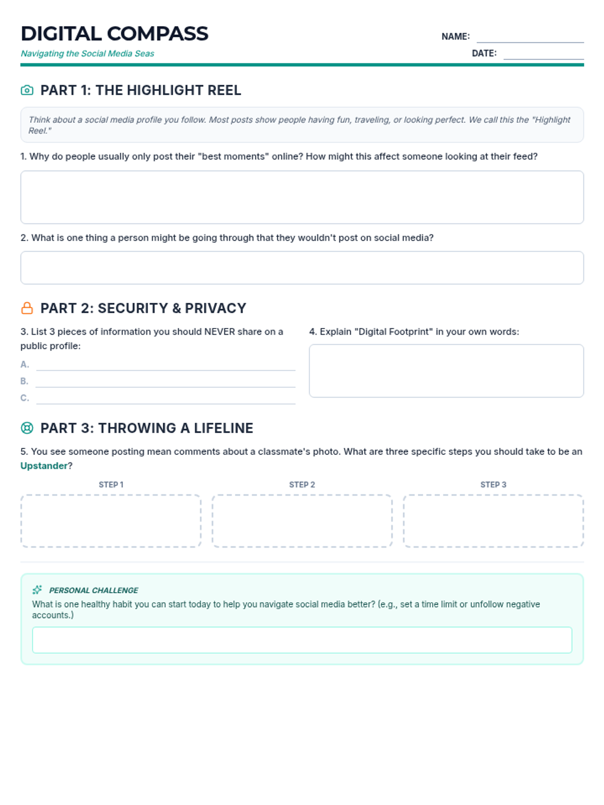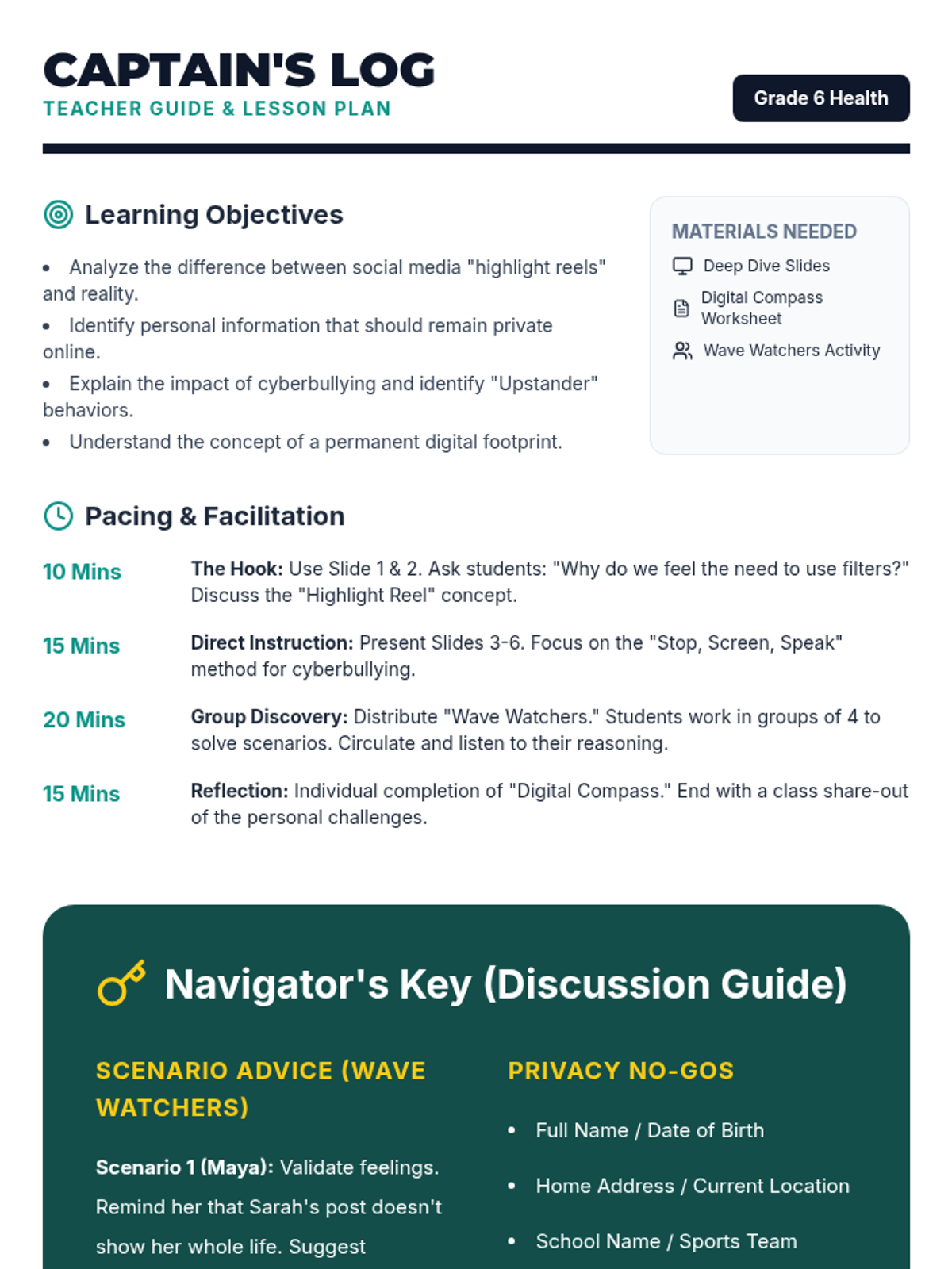 A 6th-grade health lesson exploring the impact of social media on self-esteem, privacy, and cyberbullying through an oceanic exploration theme. Students will learn to navigate the 'digital depths' safely and confidently.