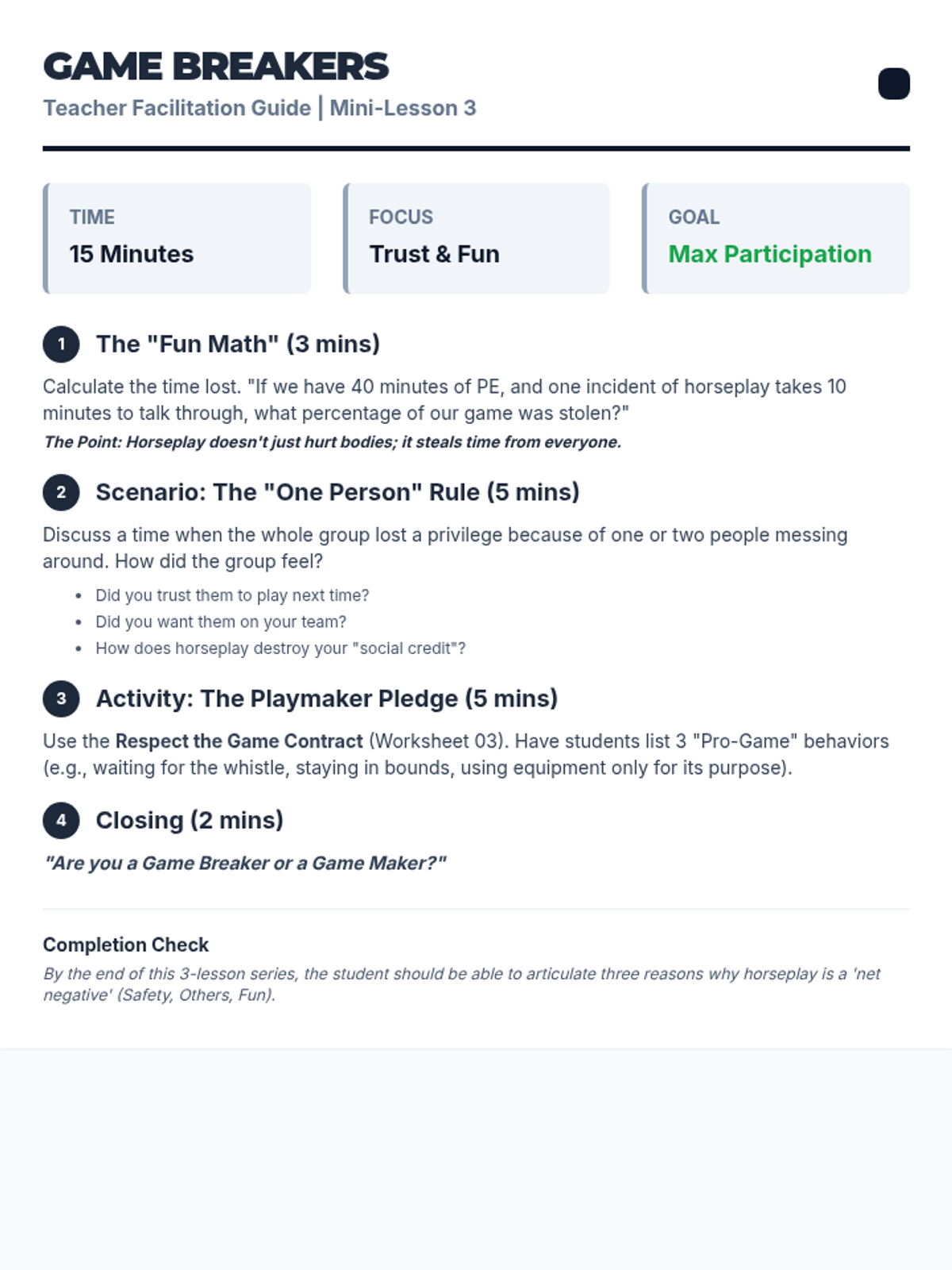 A high-energy PE lesson focusing on the Physical and Social pillars, emphasizing how movement and teamwork support mental well-being.