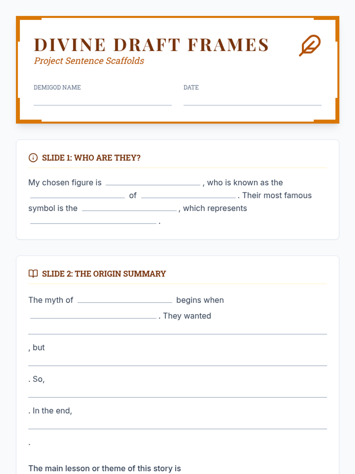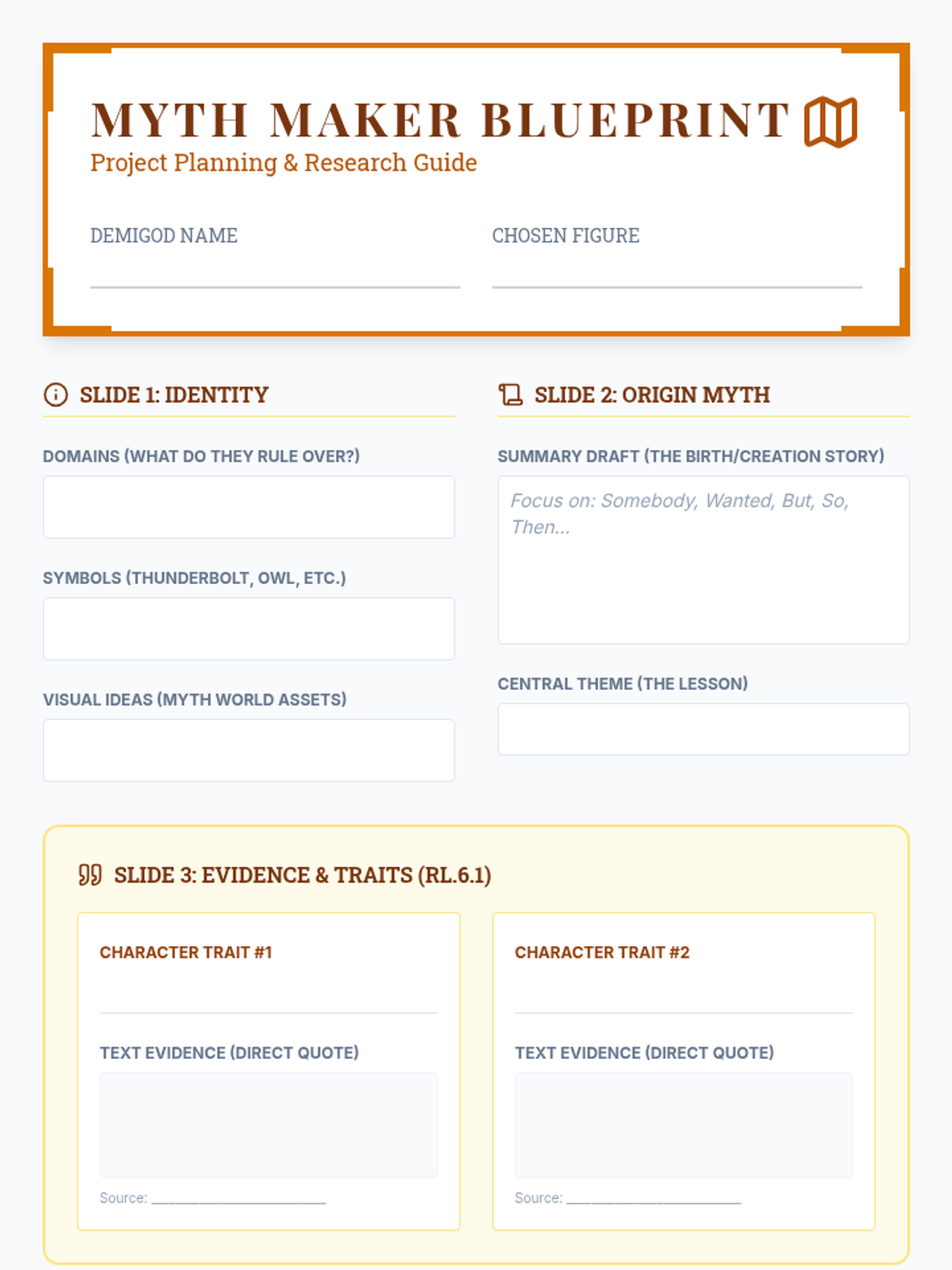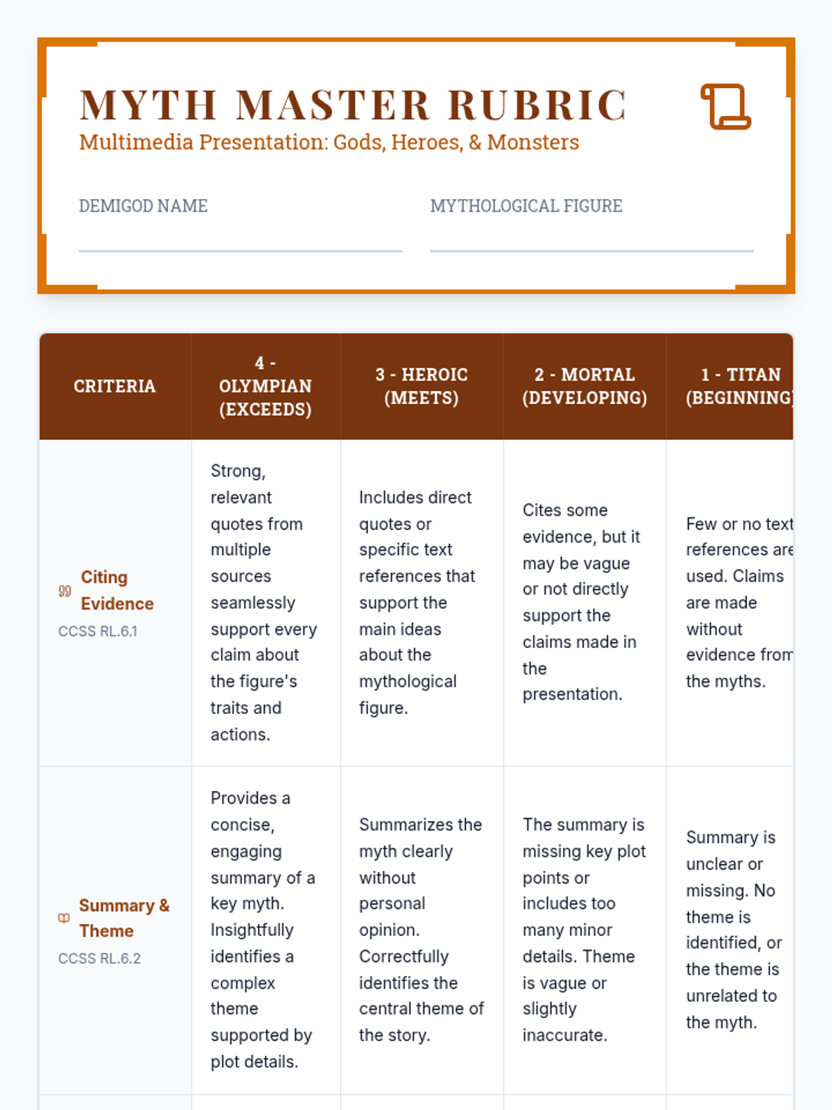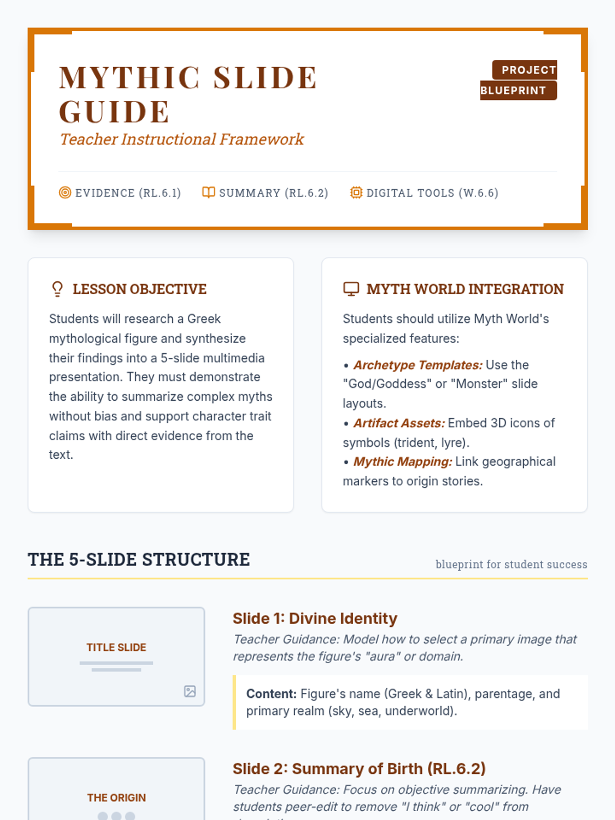 A comprehensive project where students research a Greek mythological figure and create a multimedia presentation demonstrating their understanding of text evidence, summarization, and digital storytelling.