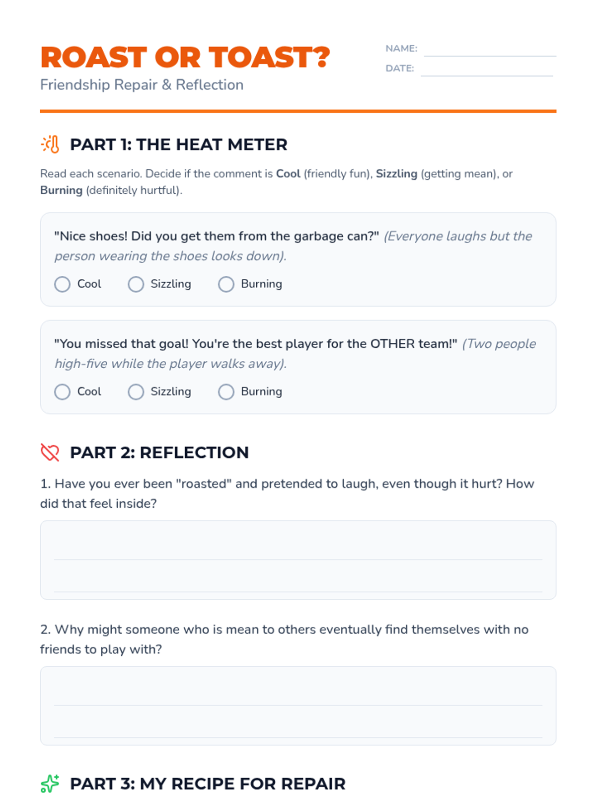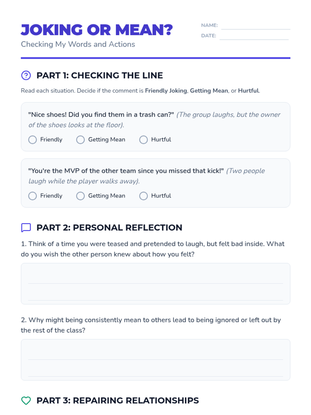 A 30-minute SEL lesson for 4th graders on distinguishing between playful joking and hurtful behavior, understanding personal boundaries, and repairing social harm.