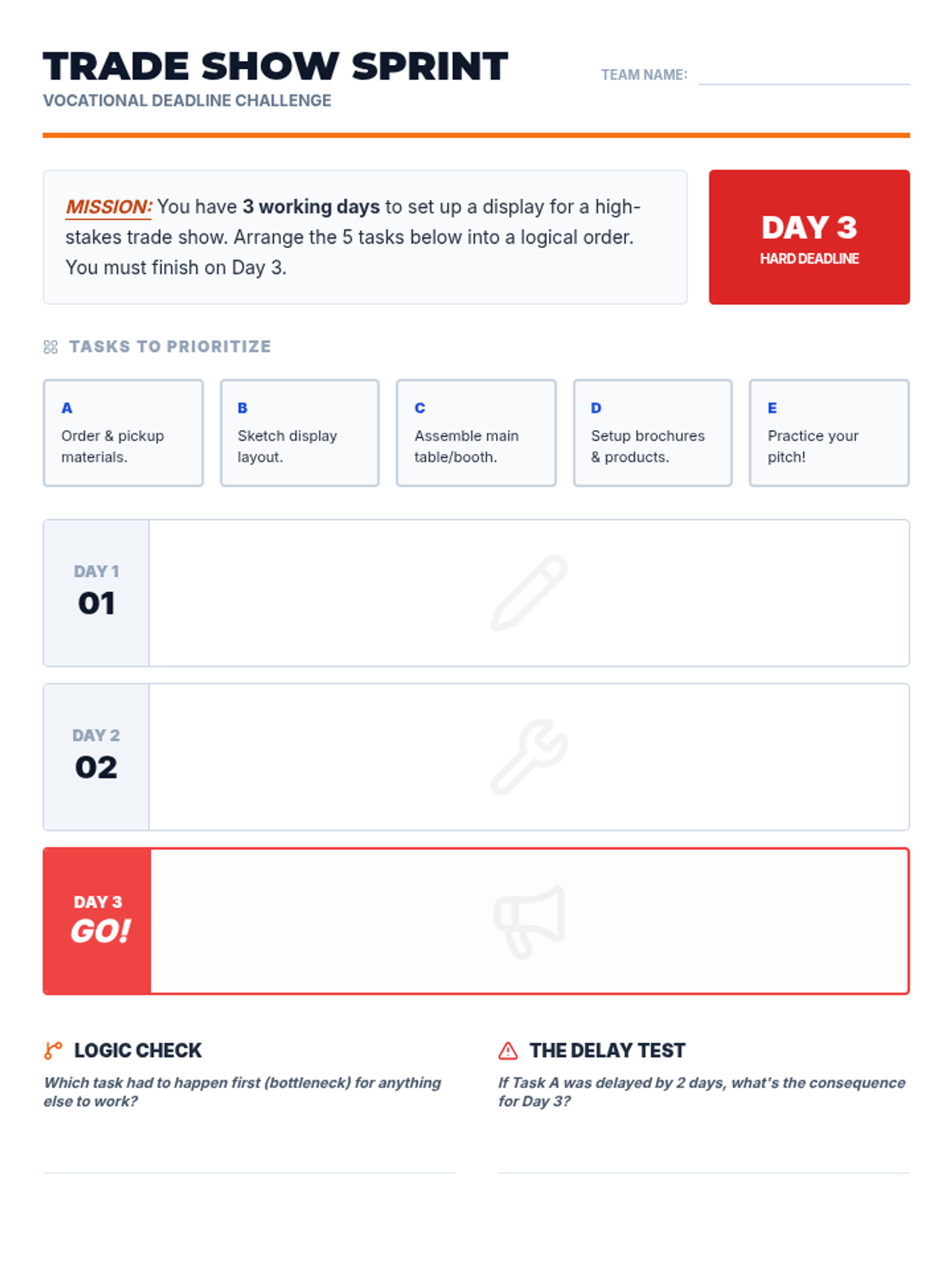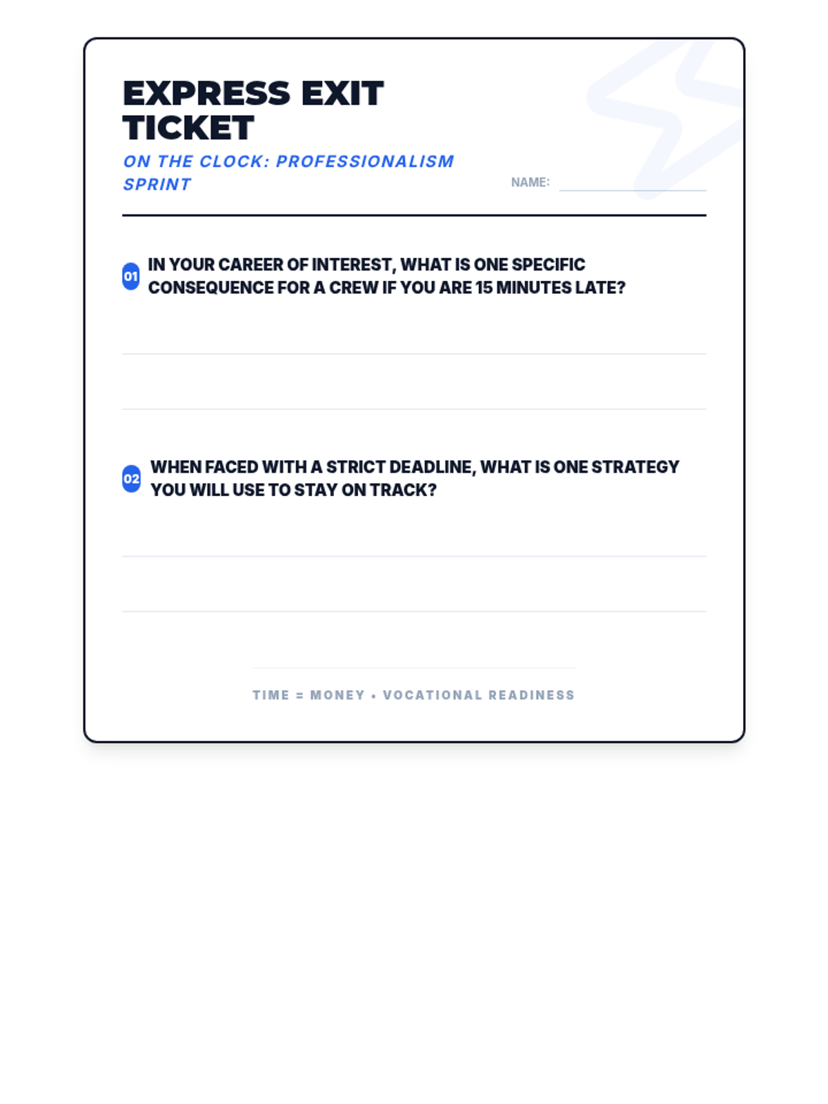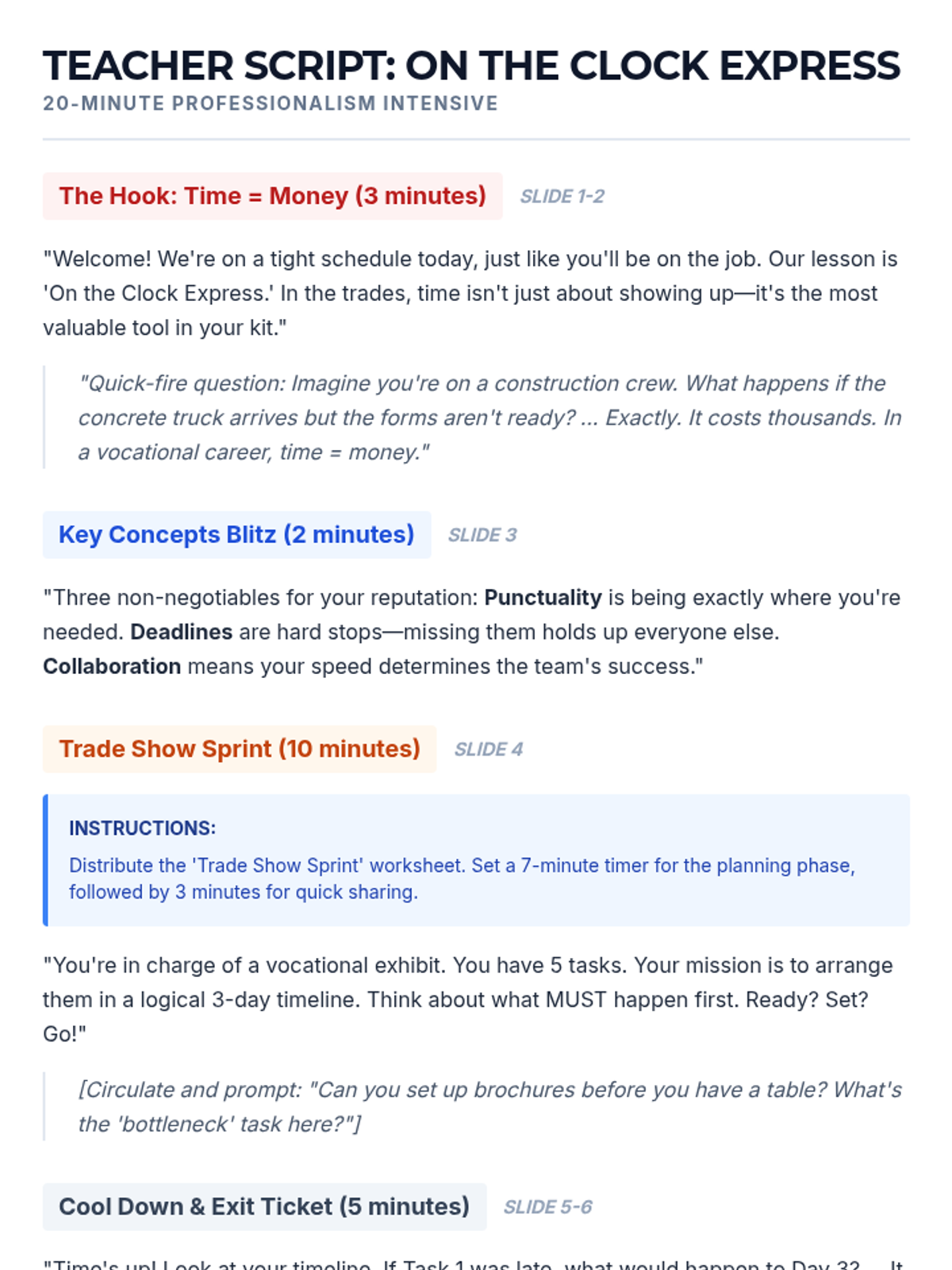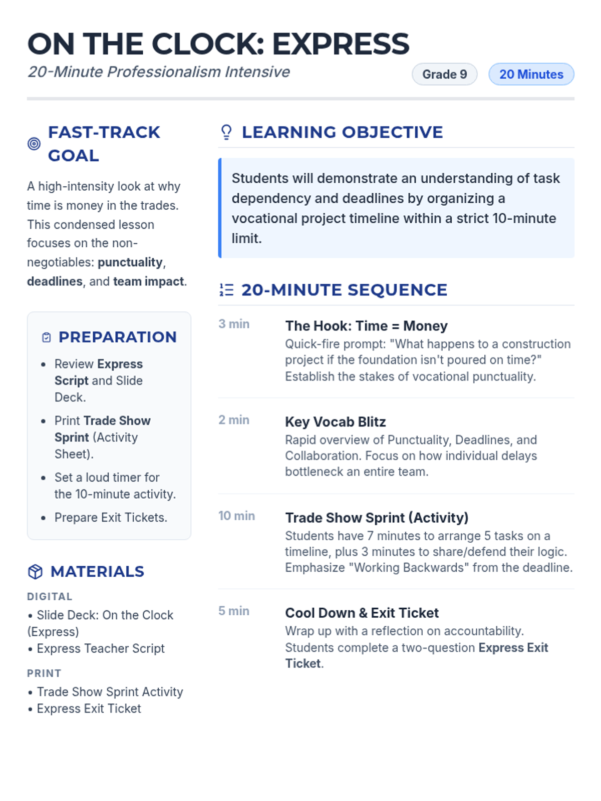 A high-intensity, 20-minute 'Express' lesson for 9th-grade vocational readiness. Students explore the high-stakes impact of time management, punctuality, and deadlines in trade careers through a fast-paced project timeline challenge.
