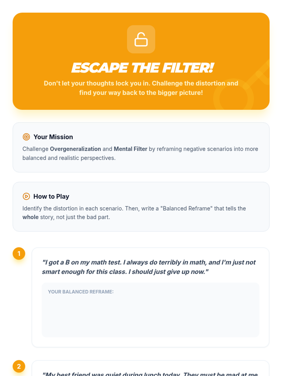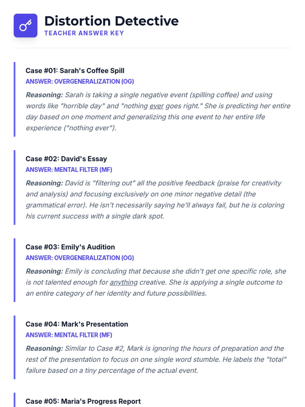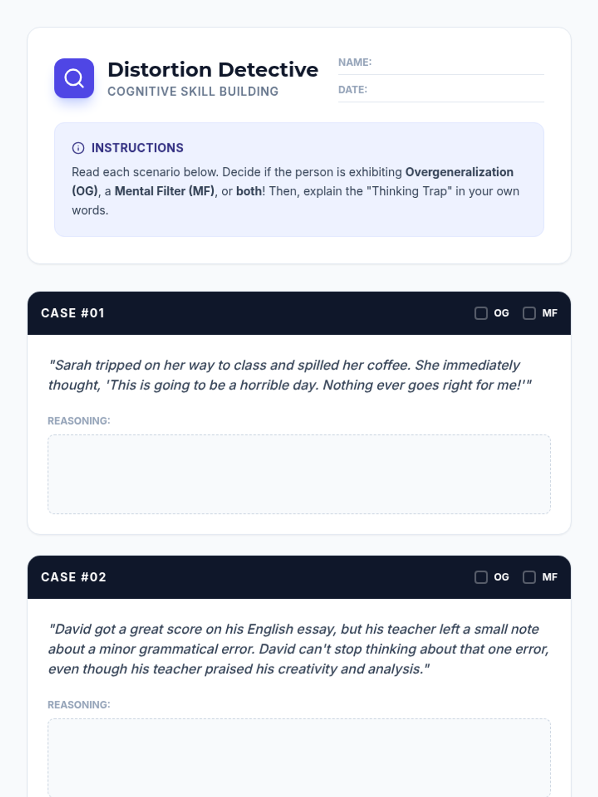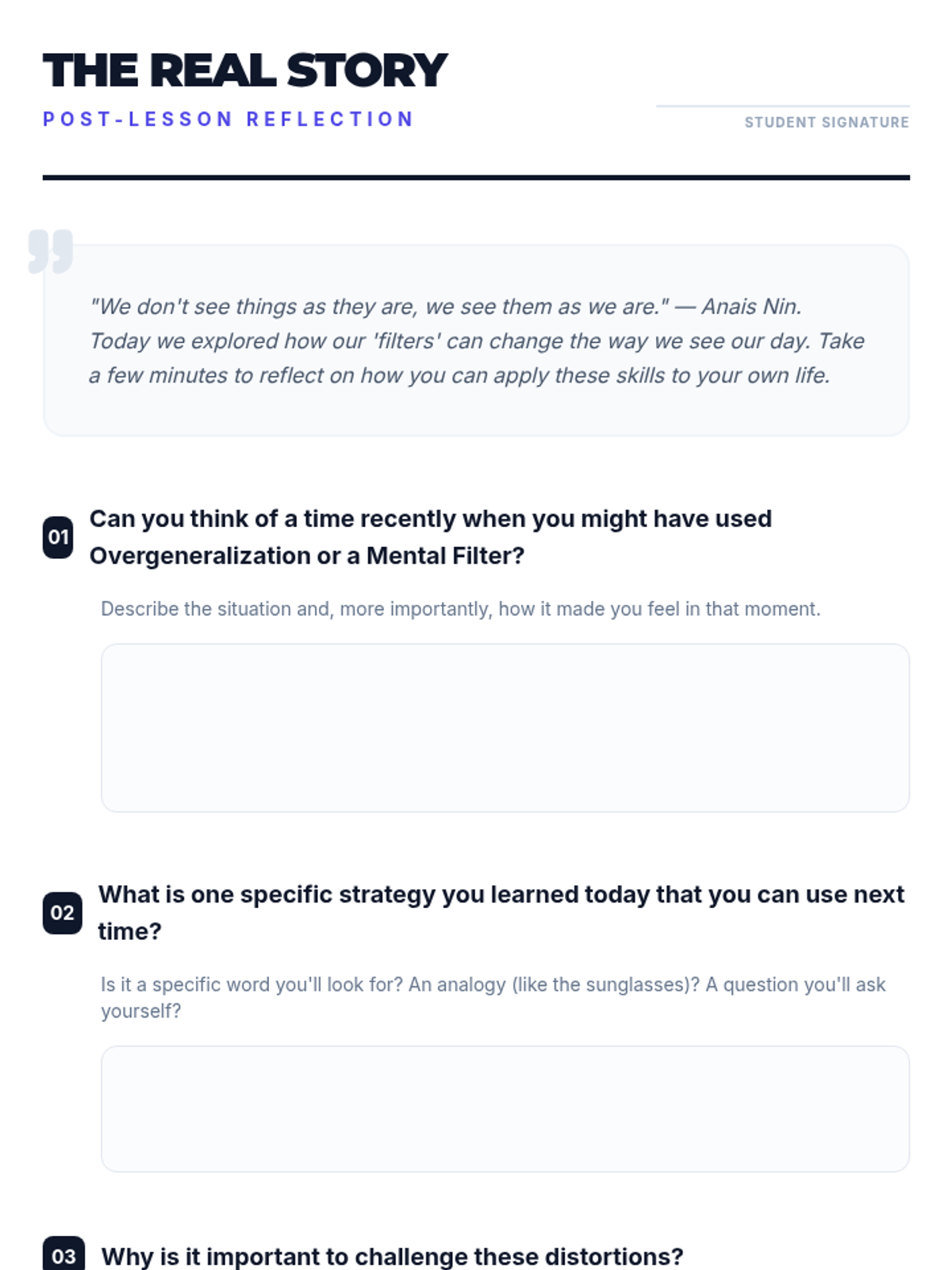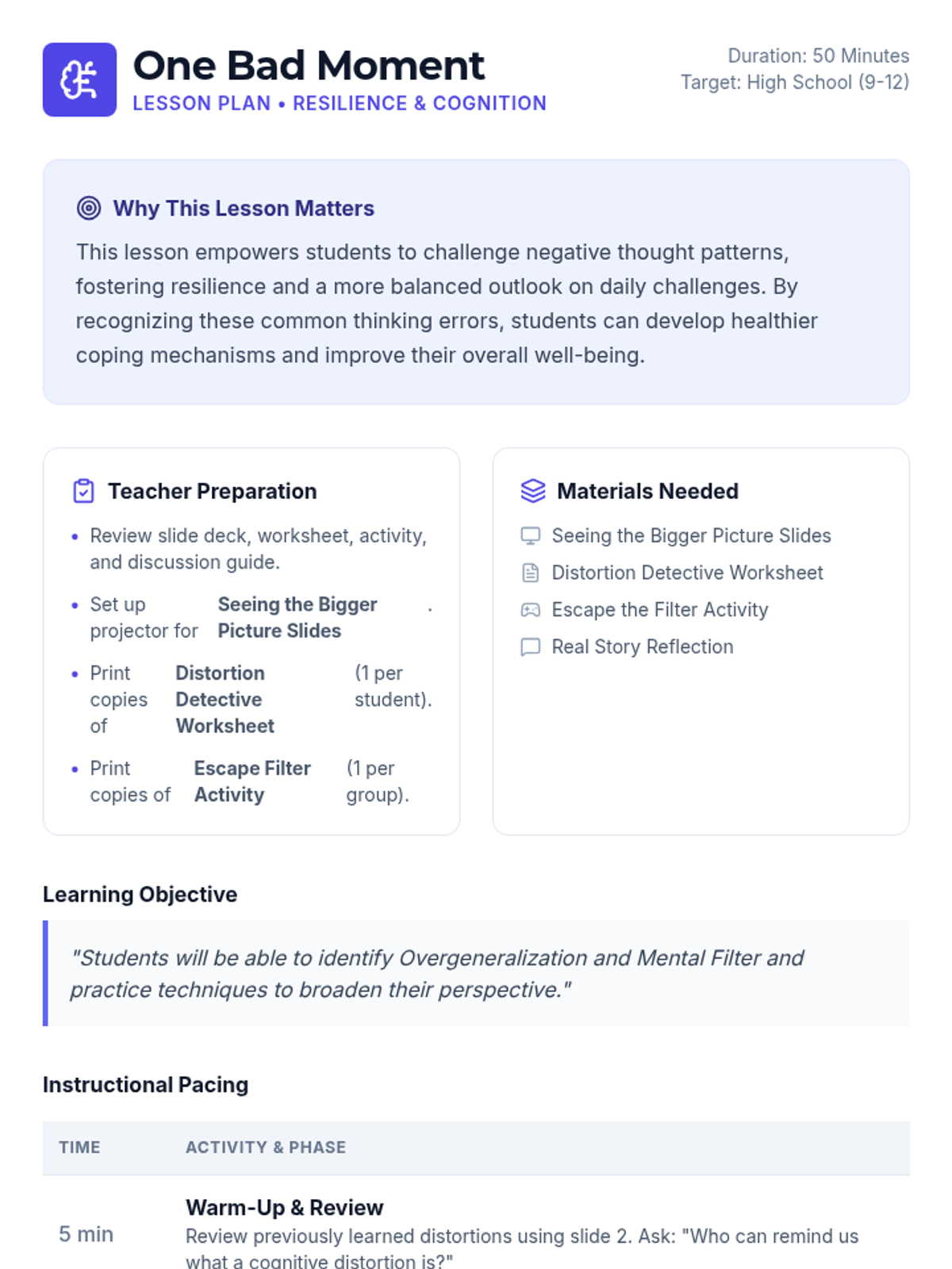 This lesson helps high school students identify and challenge cognitive distortions like Overgeneralization and Mental Filter, fostering resilience and a balanced perspective.