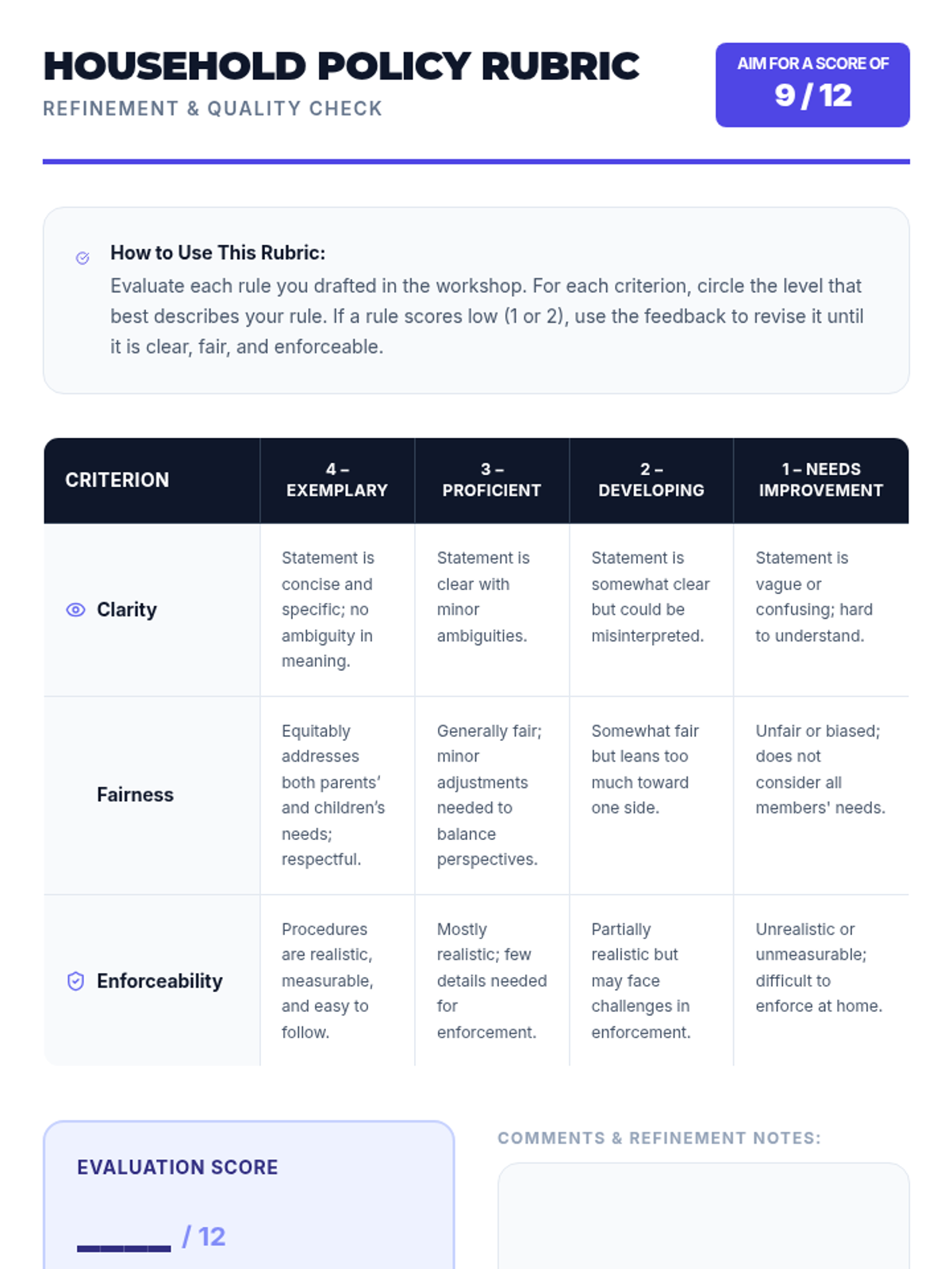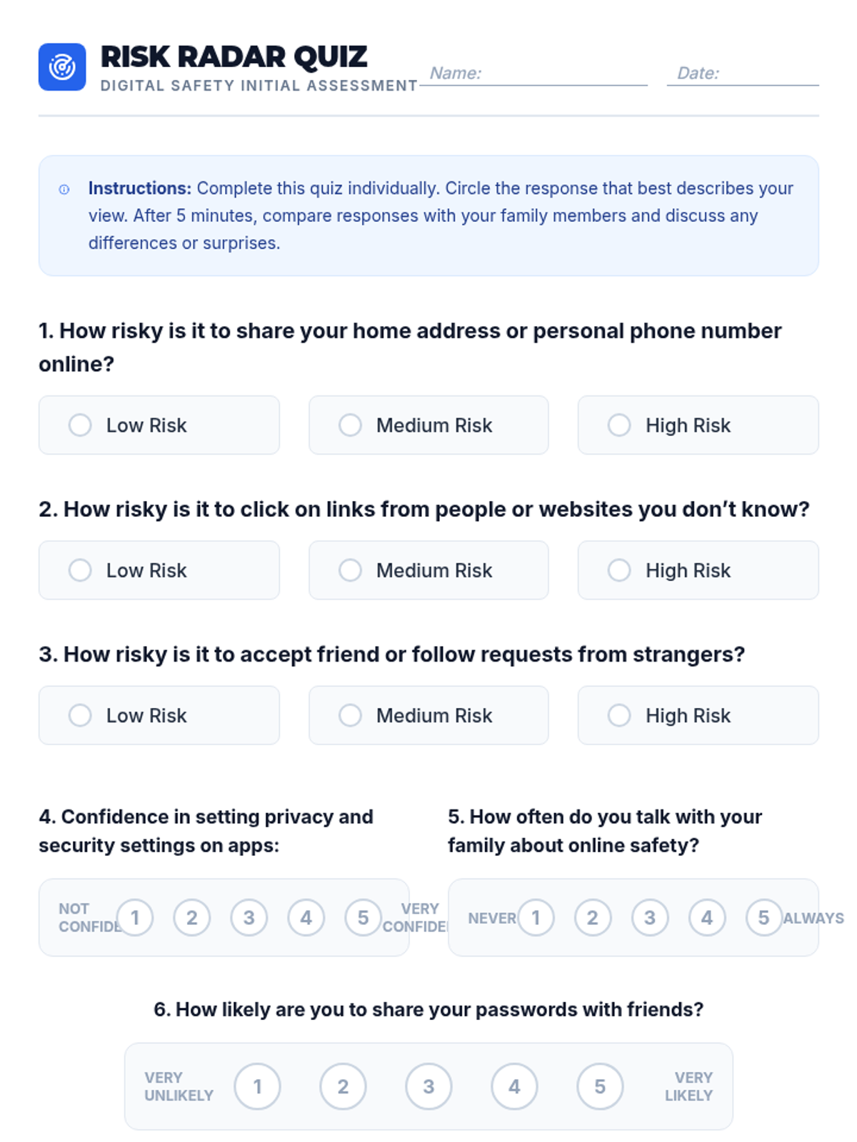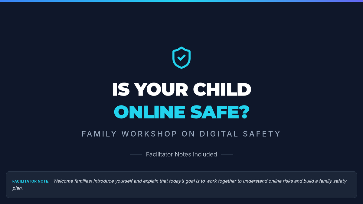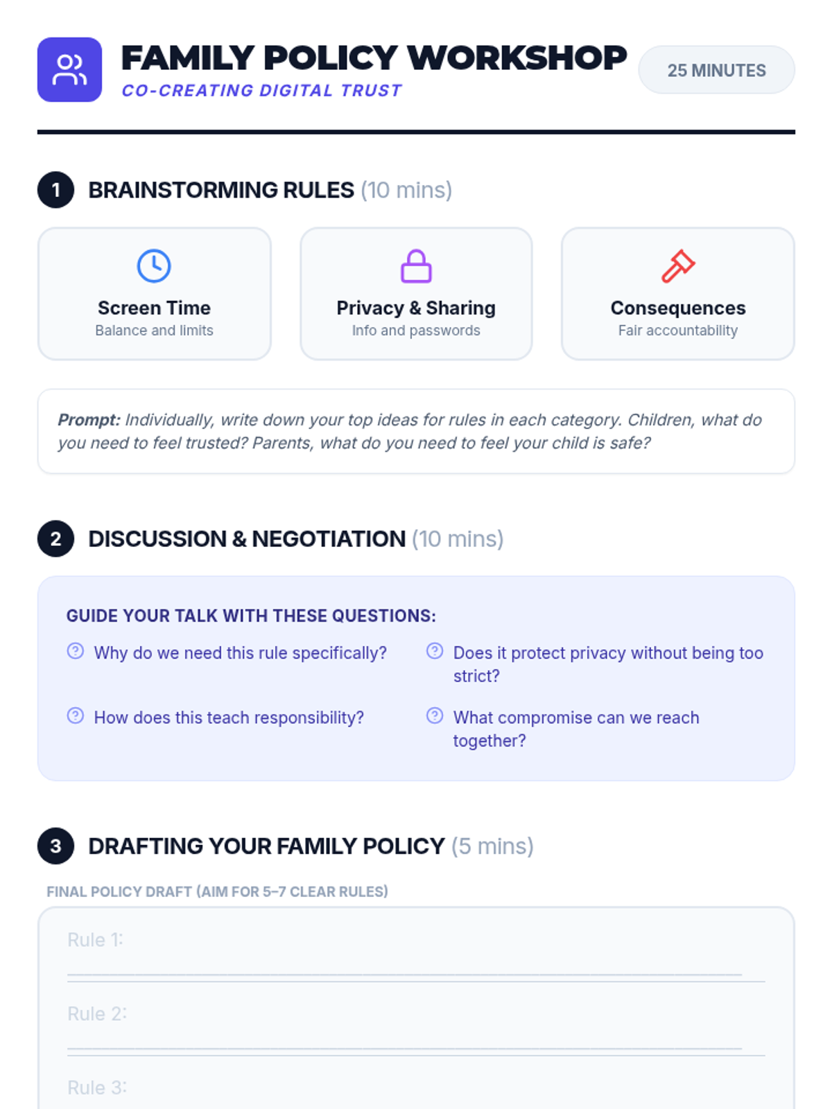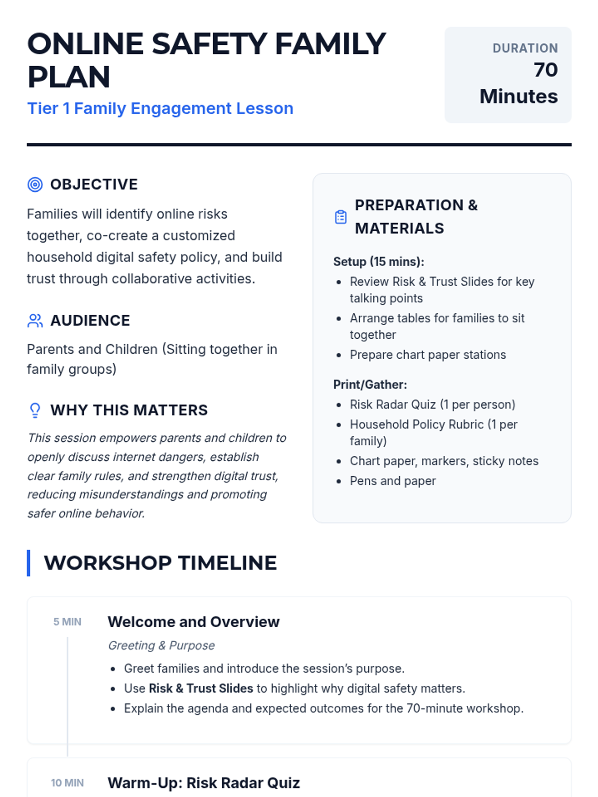 A 70-minute interactive workshop for parents and children to assess online risks, establish household tech policies, and build digital trust through collaborative activities.