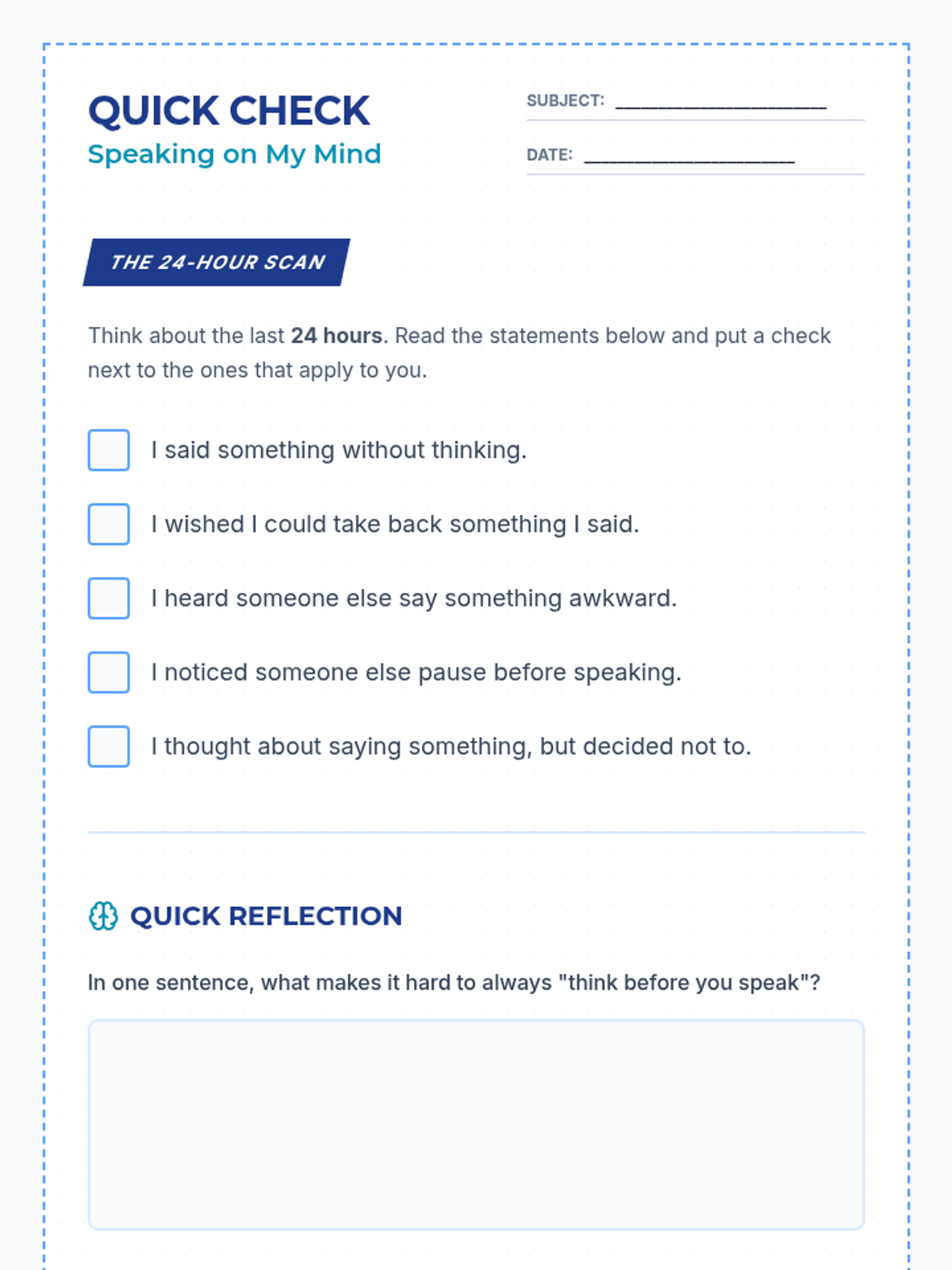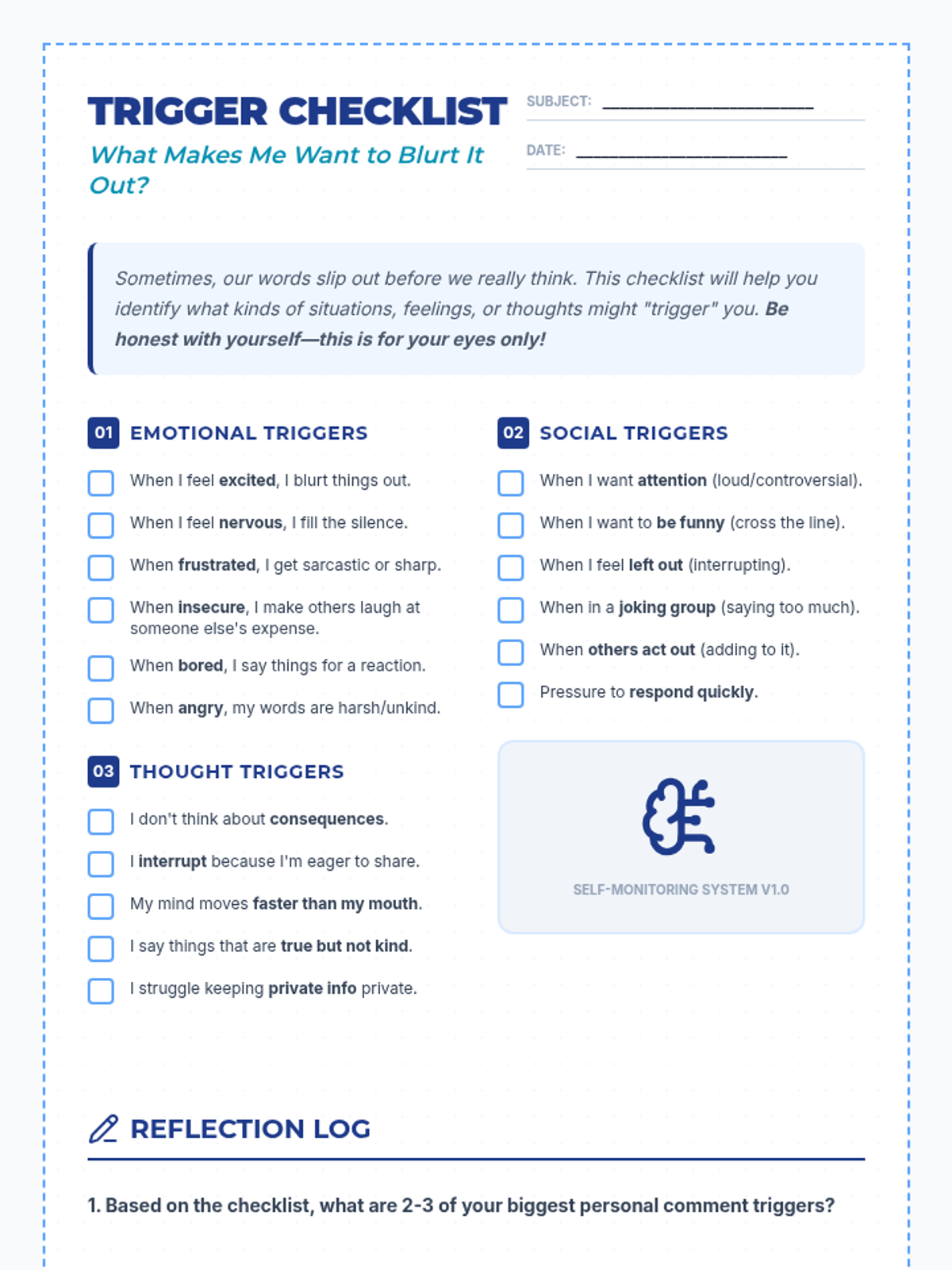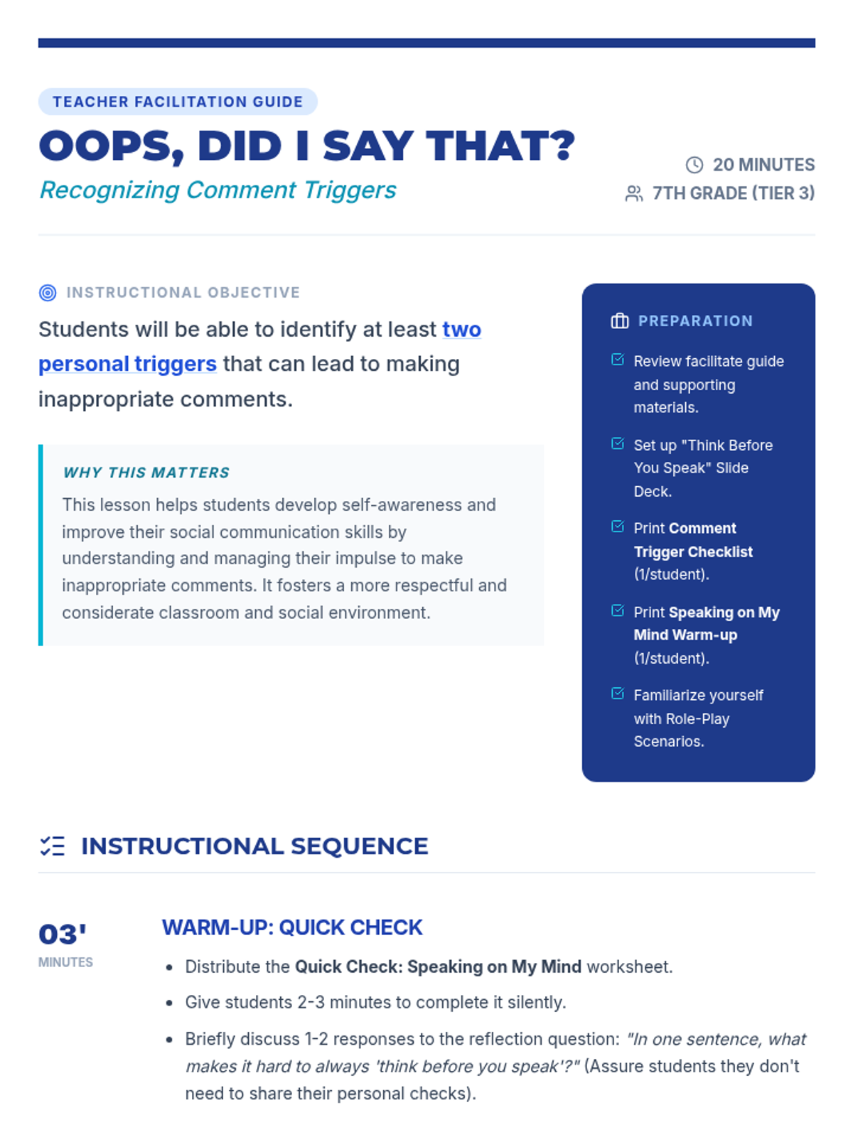 A 20-minute Tier 3 lesson for 7th graders focused on identifying personal triggers for inappropriate comments and developing social filters.