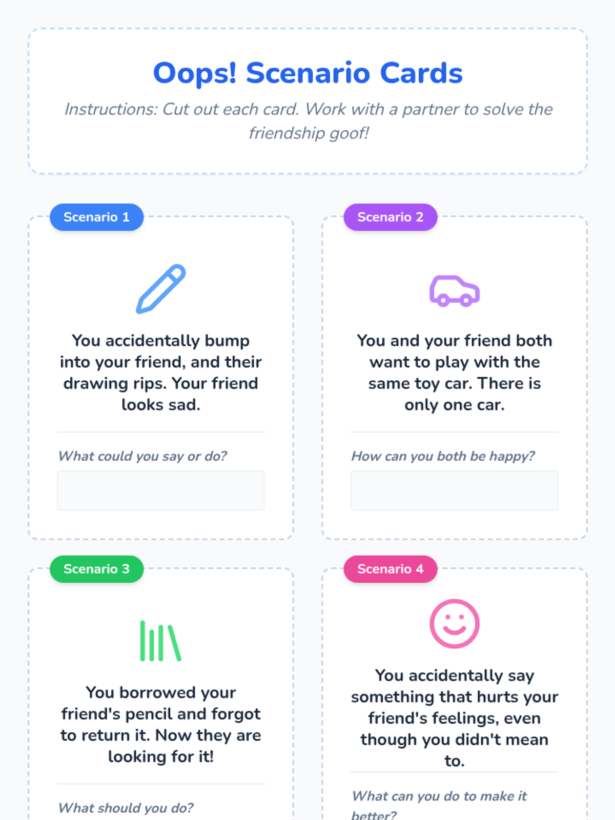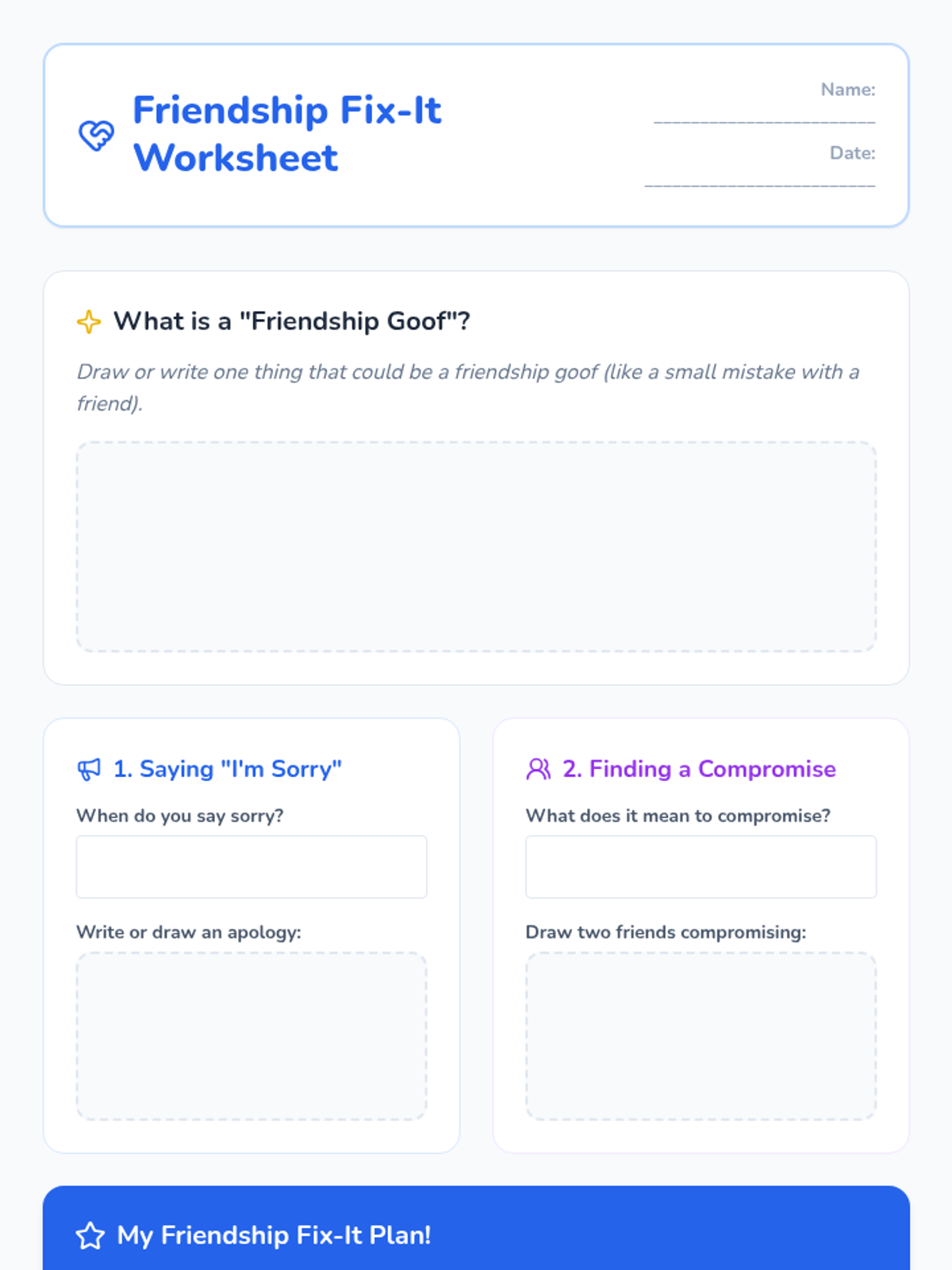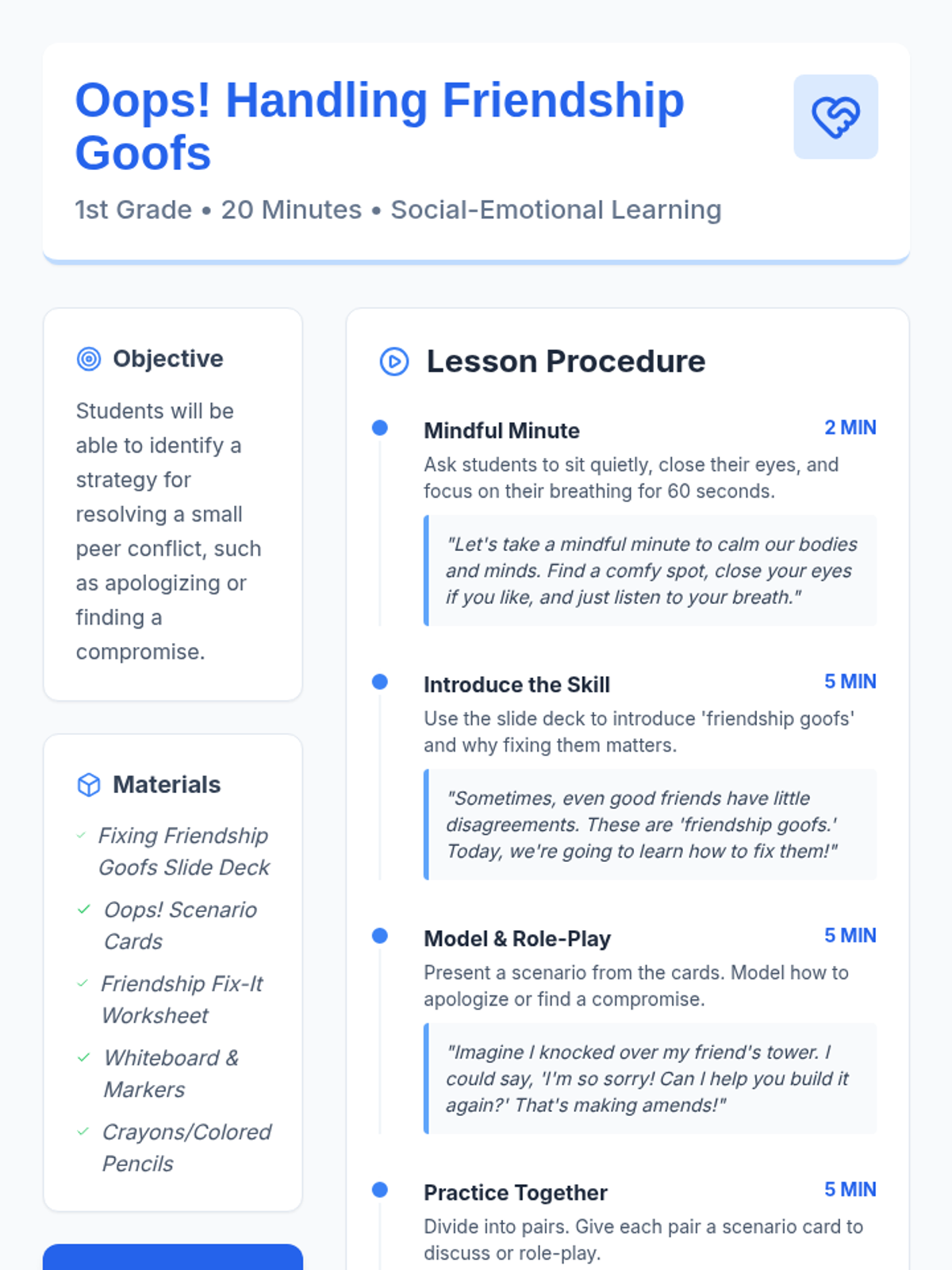 This 20-minute lesson for 1st-grade students helps them understand how to resolve small conflicts with friends. Students will learn practical strategies like apologizing and compromising, fostering positive social skills and building stronger friendships.